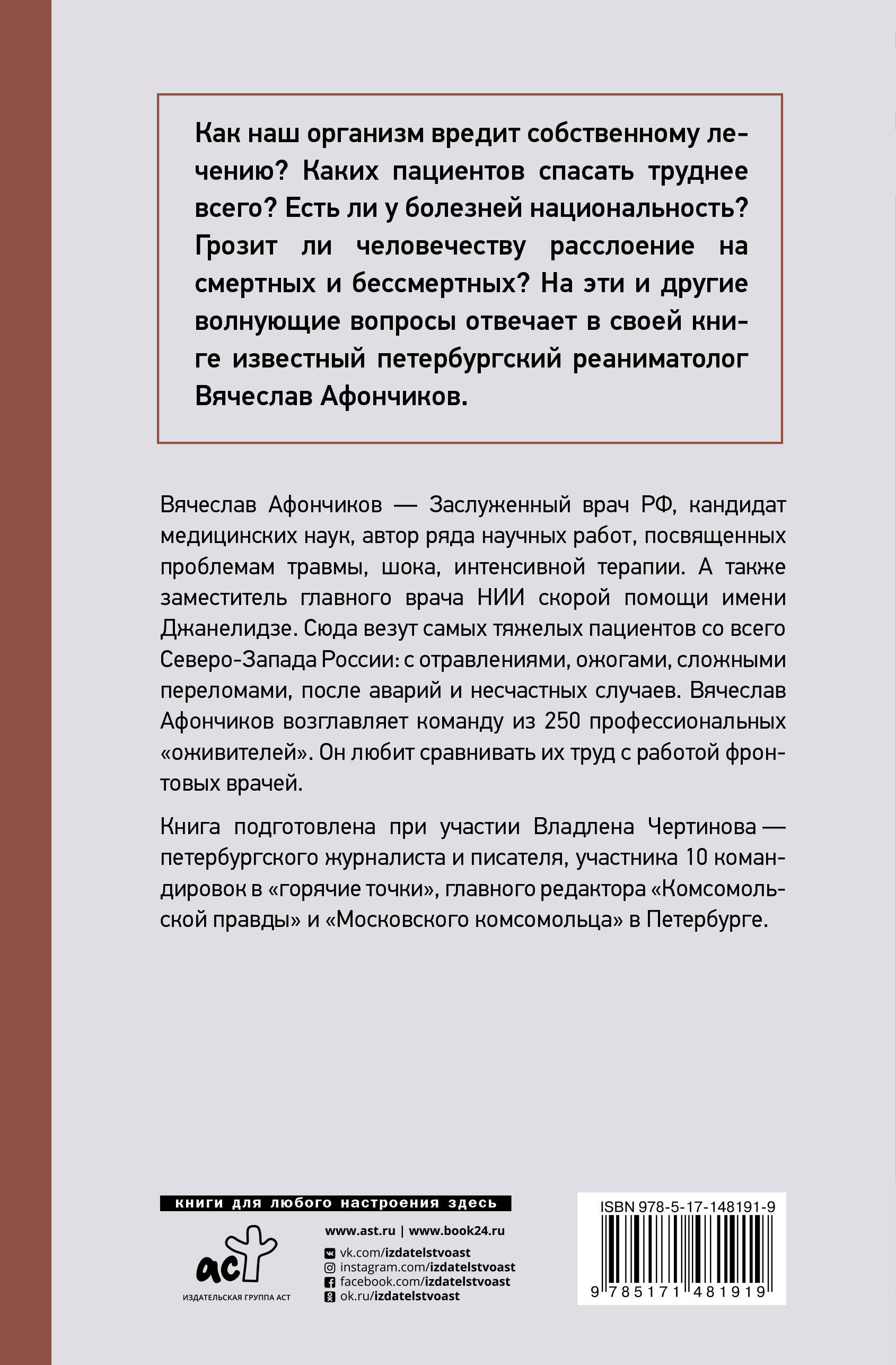 «Истории реаниматолога из "петербургского Склифа"» - жизнь глазами врача реаниматолога Вячеслава Афончикова. Автор делится своим опытом и наблюдениями о том, как пациенты нарушают лечение, как диагностируют болезни и как устроены современные методы лечения. Книга наполнена увлекательными историями из мира реаниматологии и рассказывает о здоровье, болезнях, врачах и пациентах.| Издательство | АСТ |