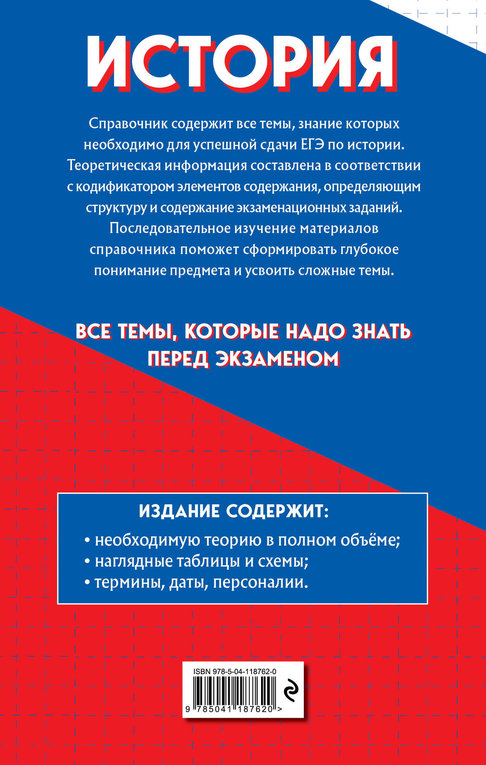 В учебном пособии представлена полная информация по всем темам школьного курса истории, проверяемым на ЕГЭ. Теоретические сведения изложены в соответствии с Кодификатором элементов содержания и требований к уровню подготовки выпускников общеобразовательных учреждений для проведения ЕГЭ. Издание адресовано учащимся старших классов, учителям и репетиторам. В данном справочнике: • все темы, проверяемые на ЕГЭ по истории, приведены в полном объёме; • материал излагается последовательно и сопровождается наглядными таблицами; • сложные темы курса систематизированы и написаны доступным языком; • в конце каждой главы приводится список основных терминов и понятий с определениями, что облегчает процесс усвоения материала.| Издательство | Эксмо |