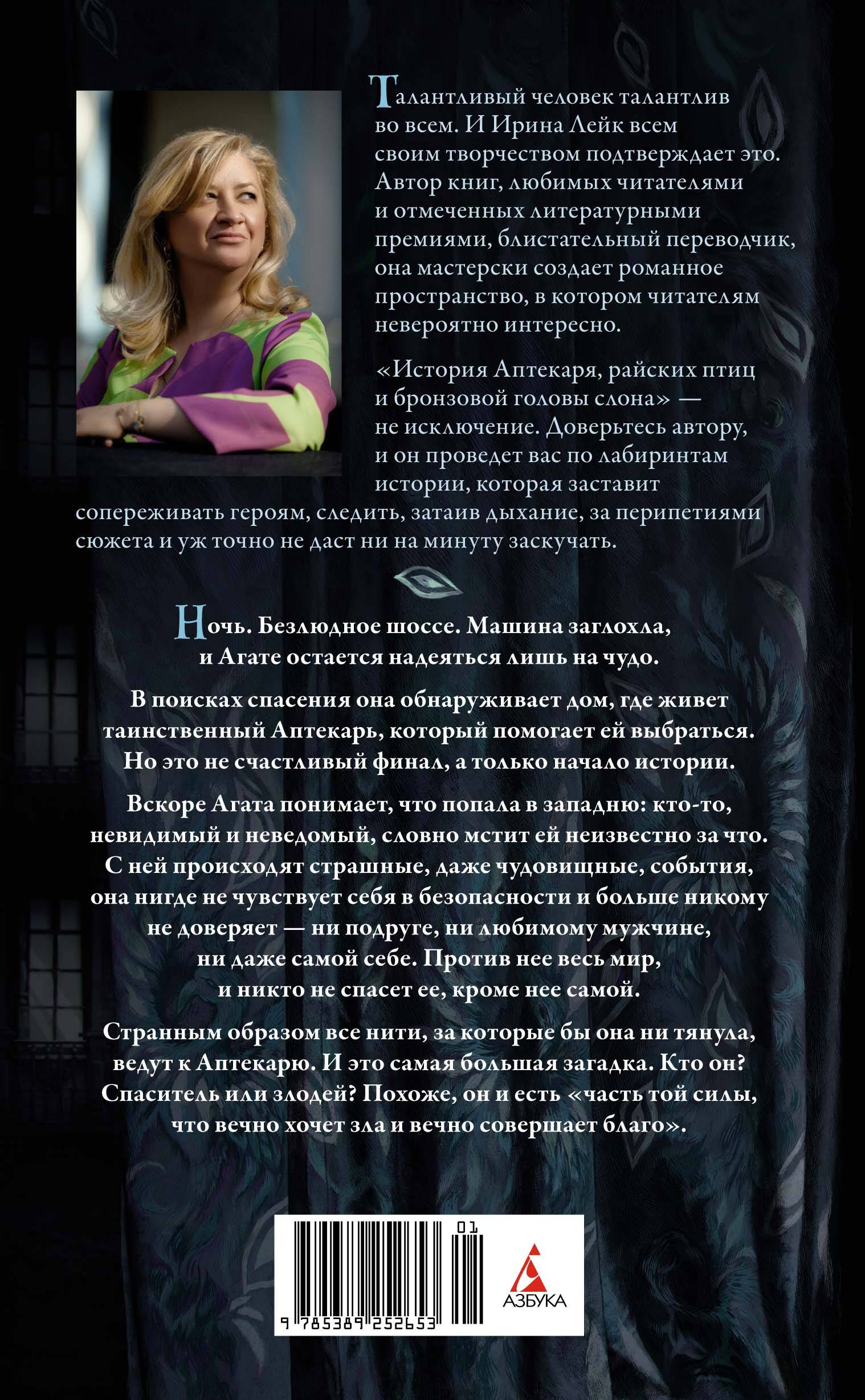Талантливый человек талантлив во всем. И Ирина Лейк всем своим творчеством подтверждает это. Автор книг, любимых читателями и отмеченных литературными премиями, блистательный переводчик, она мастерски создает романное пространство, в котором читателям невероятно интересно. "История Аптекаря, райских птиц и бронзовой головы слона" - не исключение. Доверьтесь автору, и он проведет вас по лабиринтам истории, которая заставит сопереживать героям, следить, затаив дыхание, за перипетиями сюжета и уж точно не даст ни на минуту заскучать. Ночь. Безлюдное шоссе. Машина заглохла, и Агате остается надеяться лишь на чудо. В поисках спасения она обнаруживает дом, где живет таинственный Аптекарь, который помогает ей выбраться. Но это не счастливый финал, а только начало истории. Вскоре Агата понимает, что попала в западню: кто-то, невидимый и неведомый, словно мстит ей неизвестно за что. С ней происходят страшные, даже чудовищные, события, она нигде не чувствует себя в безопасности и больше никому не доверяет - ни подруге, ни любимому мужчине, ни даже самой себе. Против нее весь мир, и никто не спасет ее, кроме нее самой. Странным образом все нити, за которые бы она ни тянула, ведут к Аптекарю. И это самая большая загадка. Кто он? Спаситель или злодей? Похоже, он и есть "часть той силы, что вечно хочет зла и вечно совершает благо".| Издательство | Азбука-Аттикус Издат.группа ООО |