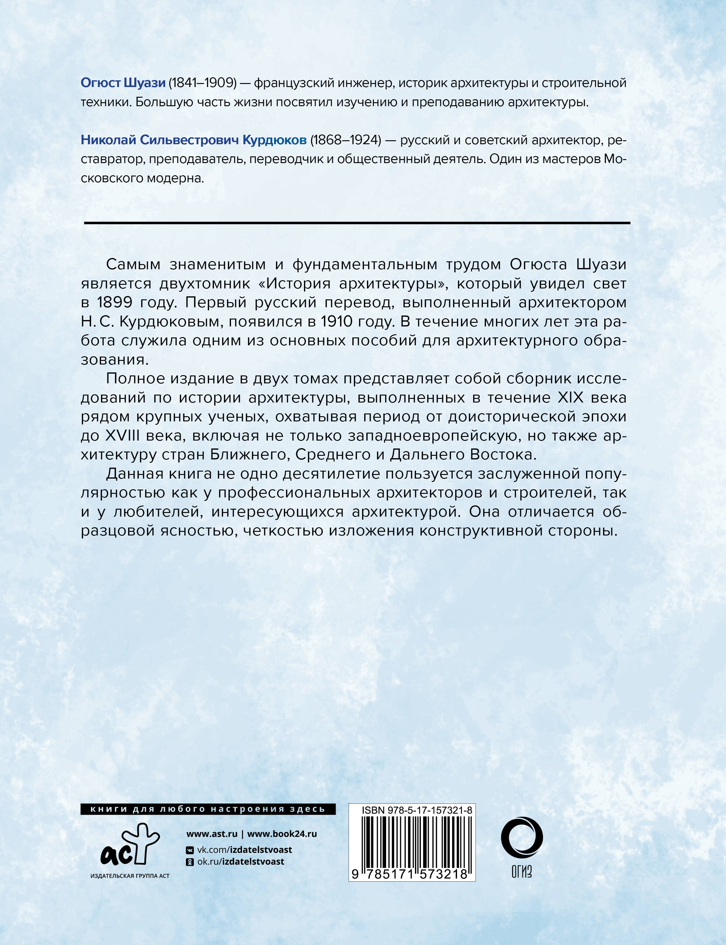 Полное издание в двух томах книги французского инженера, историка архитектуры и строительной техники Огюста Шуази не одно десятилетие служило одним из основных пособий для архитектурного образования и до сих пор пользуется заслуженной популярностью как у профессиональных архитекторов и строителей, так и у любителей, интересующихся архитектурой. Оно отличается образцовой ясностью, четкостью изложения конструктивной стороны. Печатается в первом русском переводе 1910 года Николая Сильвестровича Курдюкова. Более 850 иллюстраций!| Издательство | Издательство "АСТ" |