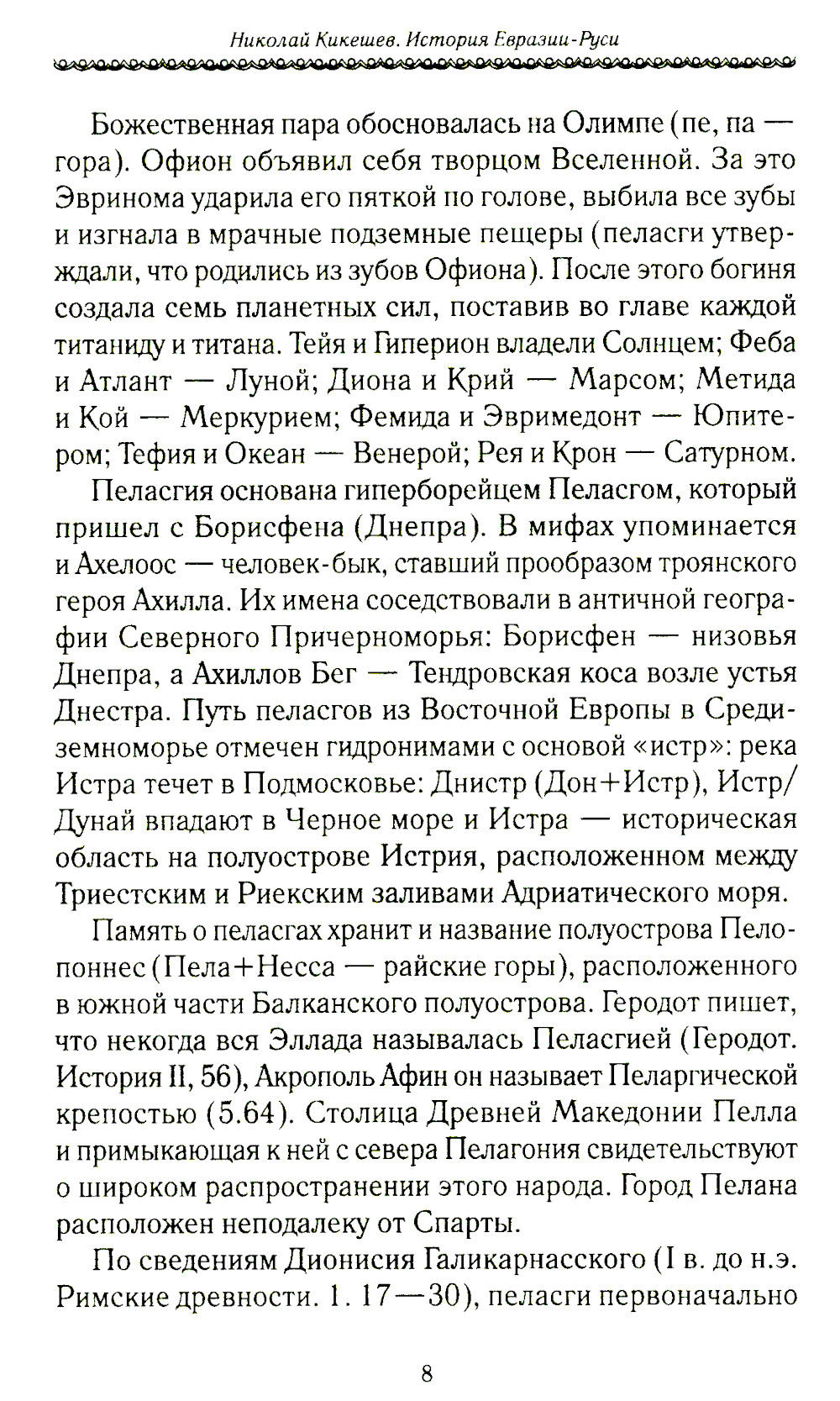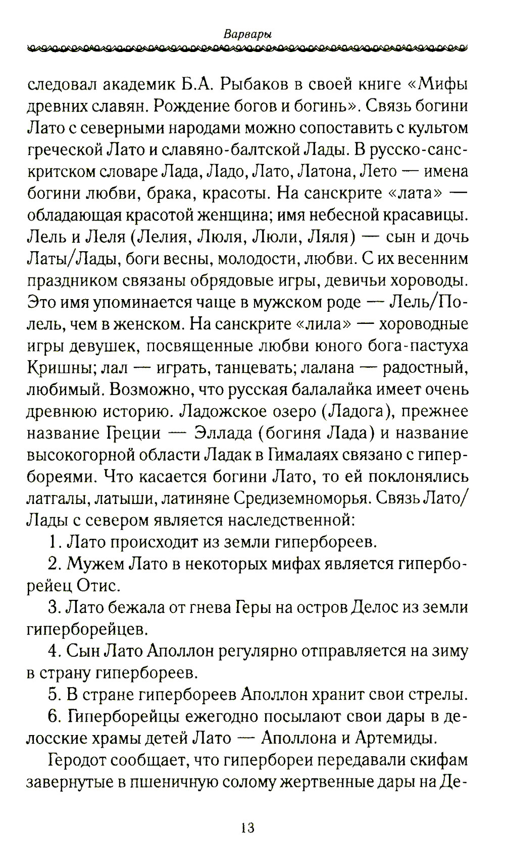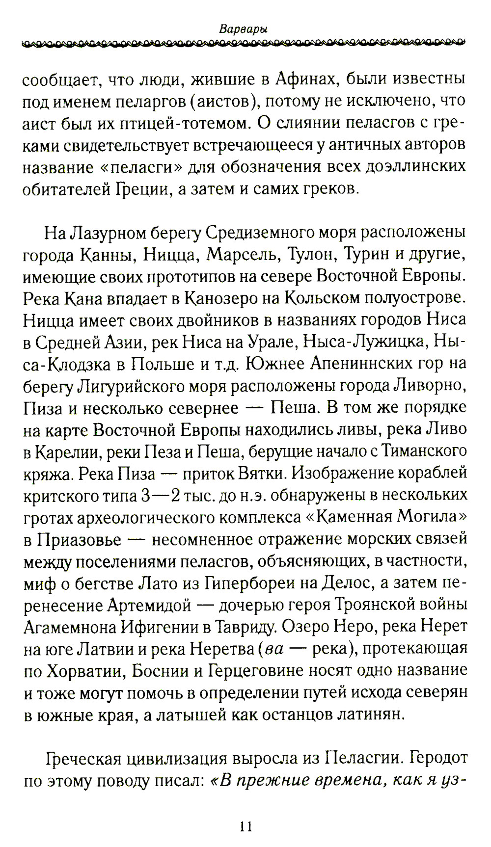 Монография «История Евразии­Руси» - первое в отечественной и зарубежной историографии комплексное исследование географии, климата Четвертичного периода, зарождения и развития племен, народов и цивилизаций континента начиная с 50 тысячелетия до н.э. Сравнивая мифы и легенды народов мира о первых временах, их богах и героях с новыми достижениями в различных областях знаний автор пришел к выводу: арийским Семиречьем является Сибирь - сакральный центр Евразии. С помощью Дендрограммы 55 этнопопуляций, данных археологии, ДНК­-генеалогии, палеогеографии и лингвистики, этнонимики, топонимики и других наук определяются пути древнейших переселений народов из Сибири к современным местам обитания, фундаментальные основы генетической и духовной близости этносов Евразии. Пятая книга посвящена исследованиям истории варваров. Хотя этот этноним получил негативный оттенок, к варварам причисляются многие народы севера Евразии от Тихого до Атлантического океана. Изначально слово «вара» - солнечная вода. Варуна - бог космических вод. Сварга - рай арийского бога солнца Индры. В ведической мифологии Сварог - верховный небесный бог, управляющий течением жизни и всем мироустройством Вселенной.