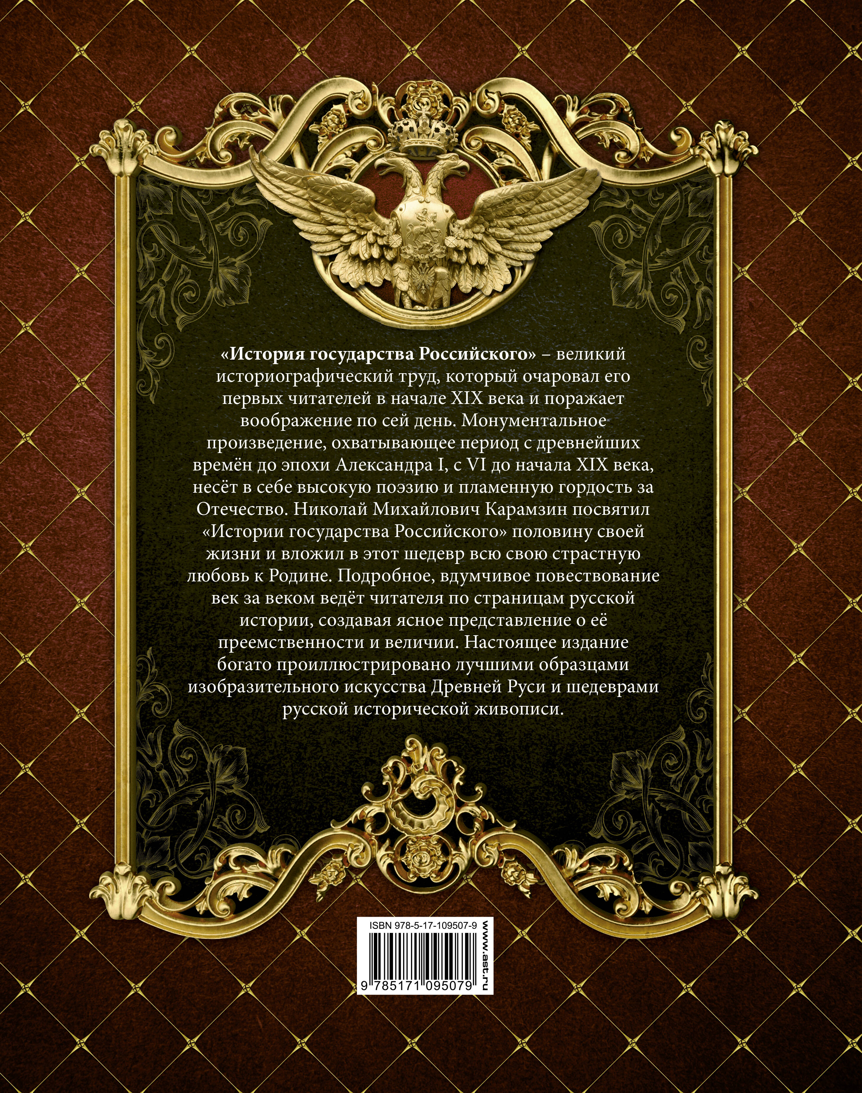 «История государства Российского» - великий историографический труд, который очаровал его первых читателей в начале XIX века и поражает воображение по сей день. Монументальное произведение, охватывающее период с древнейших времён до эпохи Александра I, с VI до начала XIX века, несёт в себе высокую поэзию и пламенную гордость за Отечество. Николай Михайлович Карамзин посвятил «Истории государства Российского» половину своей жизни и вложил в этот шедевр всю свою страстную любовь к Родине. Подробное, вдумчивое повествование век за веком ведёт читателя по страницам русской истории, создавая ясное представление о её преемственности и величии. Настоящее издание богато проиллюстрировано лучшими образчиками изобразительного искусства Древней Руси и шедеврами русской исторической живописи.| Издательство | Издательство "АСТ" |