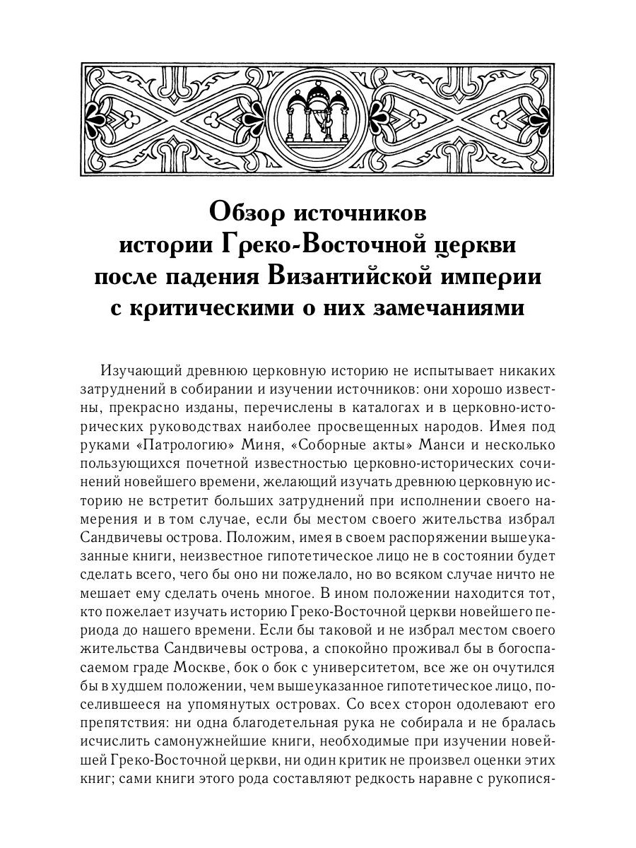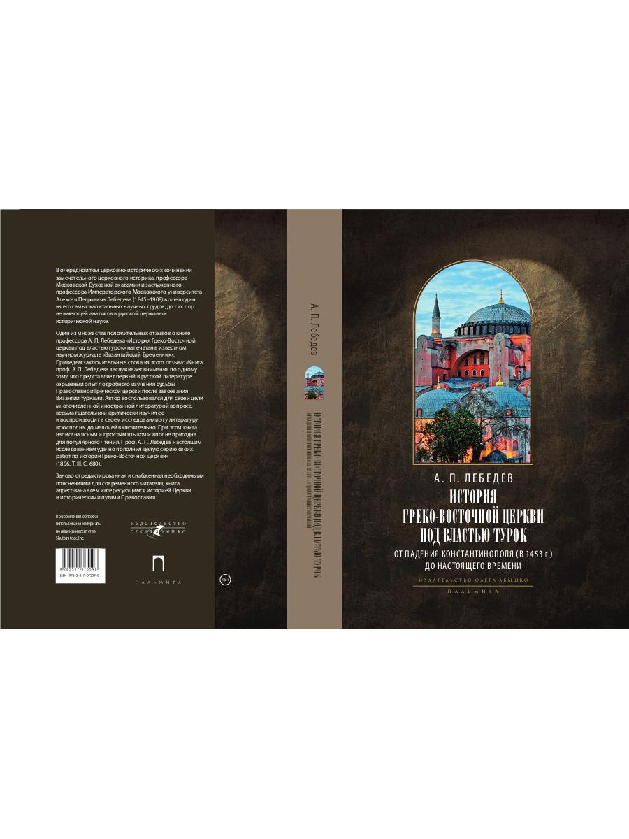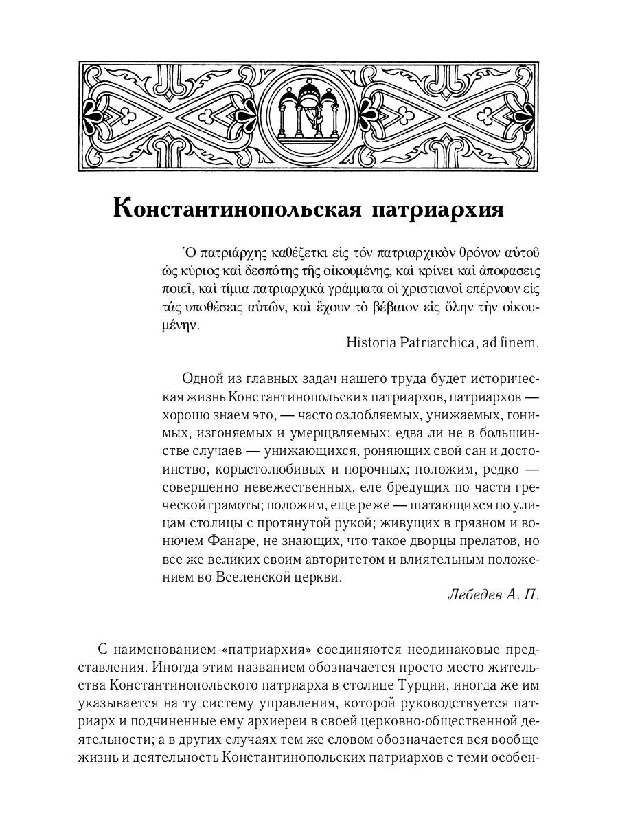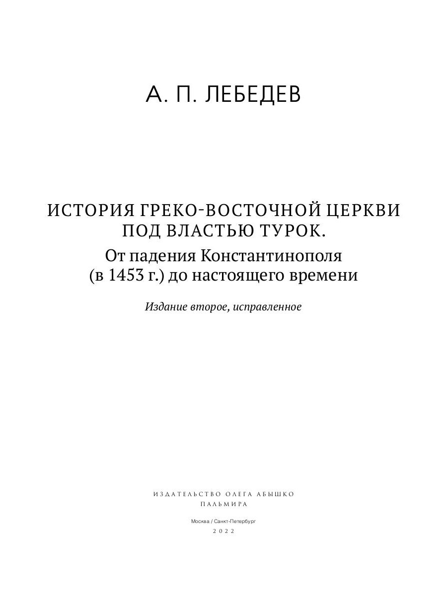 В очередной том церковно-исторических сочинений замечательного церковного историка, профессора Московской Духовной академии и заслуженного профессора Императорского Московского университета Алексея Петровича Лебедева (1845-1908) вошел один из его самых капитальных научных трудов, до сих пор не имеющий аналогов в русской церковно-исторической науке. Один из множества положительных отзывов о книге профессора А. П. Лебедева "История Греко-Восточной церкви под властью турок" напечатан в известном научном журнале "Византийский Временник". Приведем заключительные слова из этого отзыва: "Книга проф. А. П. Лебедева заслуживает внимания по одному тому, что представляет первый в русской литературе серьезный опыт подробного изучения судьбы Православной Греческой церкви после завоевания Византии турками. Автор воспользовался для своей цели многочисленной иностранной литературой вопроса, весьма тщательно и критически изучил ее и воспроизводит в своем исследовании эту литературу всю сполна, до мелочей включительно. При этом книга написана ясным и простым языком и вполне пригодна для популярного чтения. Проф. А. П. Лебедев настоящим исследованием удачно пополнил целую серию своих работ по истории Греко-Восточной церкви" (1896. Т. III. С. 680). Заново отредактированная и снабженная необходимыми пояснениями для современного читателя, книга адресована всем интересующимся историей Церкви и историческими путями Православия.