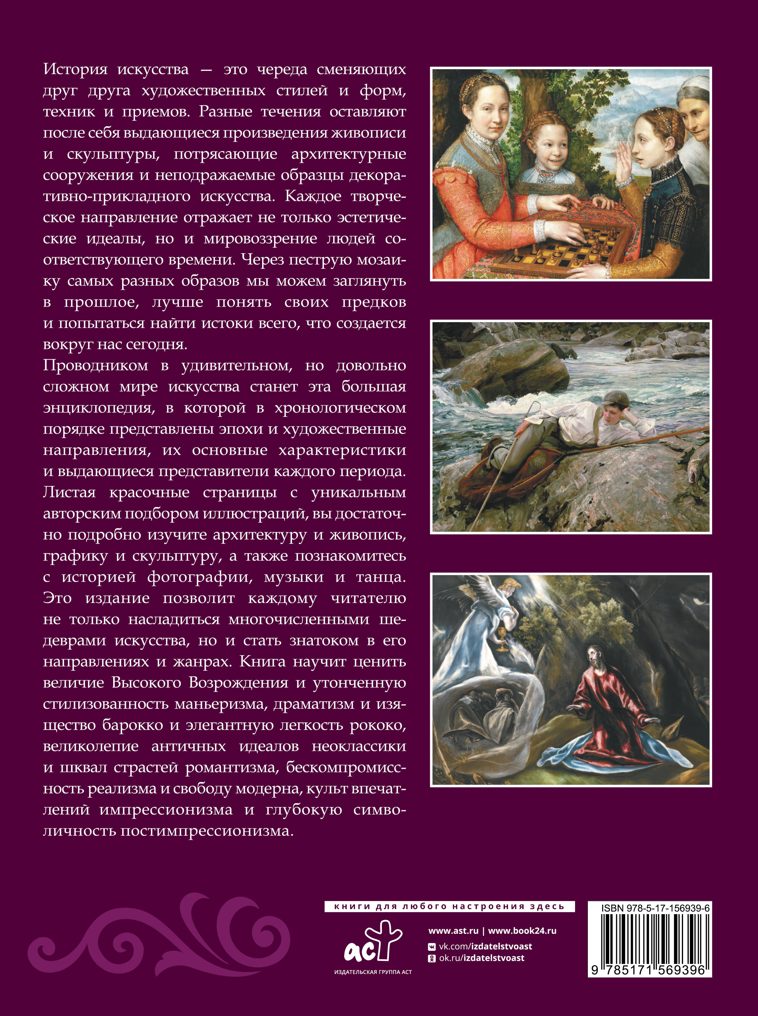 История искусства - это череда сменяющих друг друга художественных стилей и форм, техник и приемов. Разные течения оставляют после себя выдающиеся произведения живописи и скульптуры, потрясающие архитектурные сооружения и неподражаемые образцы декоративно-прикладного искусства. Каждое творческое направление отражает не только эстетические идеалы, но и мировоззрение людей соответствующего времени. Через пеструю мозаику самых разных образов мы можем заглянуть в прошлое, лучше понять своих предков и попытаться найти истоки всего, что создается вокруг нас сегодня. Проводником в удивительном, но довольно сложном мире искусства станет эта большая энциклопедия, в которой в хронологическом порядке представлены эпохи и художественные направления, их основные характеристики и выдающиеся представители каждого периода. Листая красочные страницы с уникальным авторским подбором иллюстраций, вы достаточно подробно изучите архитектуру и живопись, графику и скульптуру, а также познакомитесь с историей фотографии, музыки и танца. Это издание позволит каждому читателю не только насладиться многочисленными шедеврами искусства, но и стать знатоком в его направлениях и жанрах. Книга научит ценить величие Высокого Возрождения и утонченную стилизованность маньеризма, драматизм и изящество барокко и элегантную легкость рококо, великолепие античных идеалов неоклассики и шквал страстей романтизма, бескомпромиссность реализма и свободу модерна, культ впечатлений импрессионизма, глубокую символичность постимпрессионизма и еще многое другое в мире непреходящей Красоты.| Издательство | Издательство "АСТ" |
