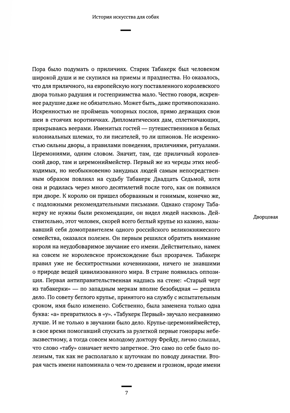 Яркое, ироничное, чрезвычайно занимательное по форме и насыщенное по содержанию повествование об истории искусства, поданное якобы через призму видения немаловажных персонажей многих картин и скульптурных изображений - собак.| Издательство | Арка |