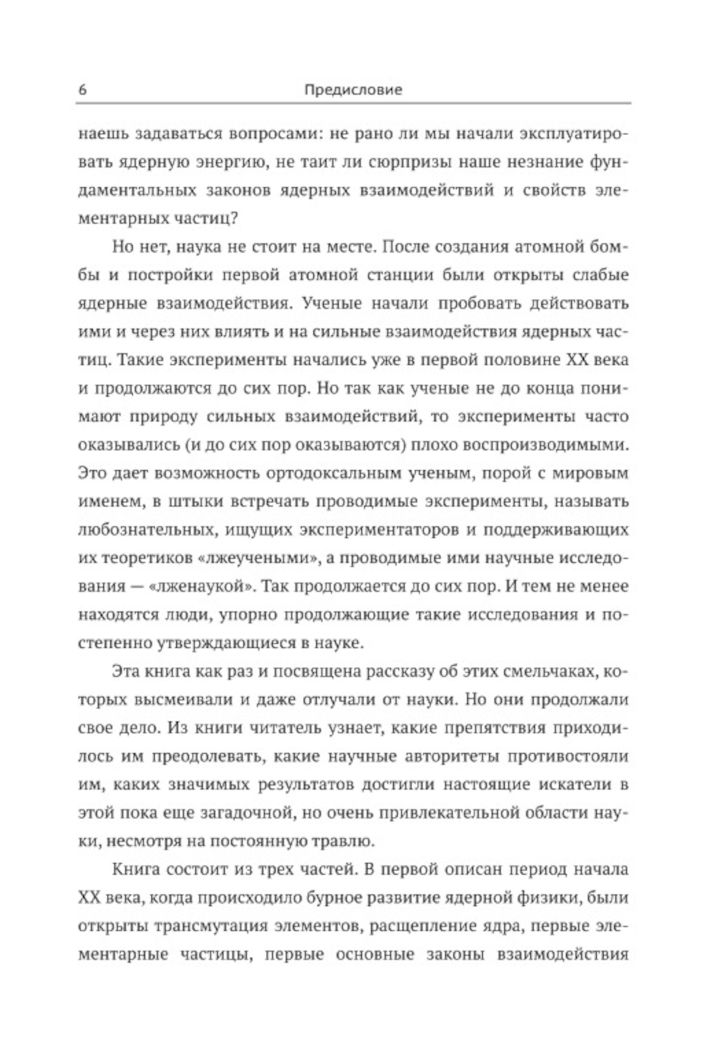 Книга посвящена рассказу о смельчаках, которых высмеивали и даже отлучали от науки. Но они продолжали свое дело. Из книги читатель узнает, какие препятствия приходилось им преодолевать, какие научные авторитеты противостояли им, каких значимых результатов достигли настоящие искатели в пока еще загадочной, но очень привлекательной области науки - ядерной физике. Книга состоит из трех частей. В первой описан период начала XX века, когда происходило бурное развитие ядерной физики, были открыты трансмутация элементов, расщепление ядра, первые элементарные частицы, первые основные законы взаимодействия ядерных частиц, преимущественно энергетические. Во второй части описан «спокойный» период, полный догматизма и появления новых ростков знаний по физике слабых взаимодействий. Он длился от создания атомных бомб и реакторов до Чернобыля, когда возникли первые сомнения: а все ли мы знаем? С этого момента вновь запахло «революцией», вновь появились любопытные, пытливые и сомневающиеся «лжеученые». Этот период, длящийся до сегодняшнего дня, когда появляется свет во тьме, описан в третьей, наиболее интересной части. Этот период продолжается, но уже видно, что очень скоро вновь произойдет ломка старых представлений и состоится новый скачок в ядерной физике. Книга адресуется всем тем, кто интересуется историей науки и ядерной физикой.| Издательство | ЛЕНАНД |
