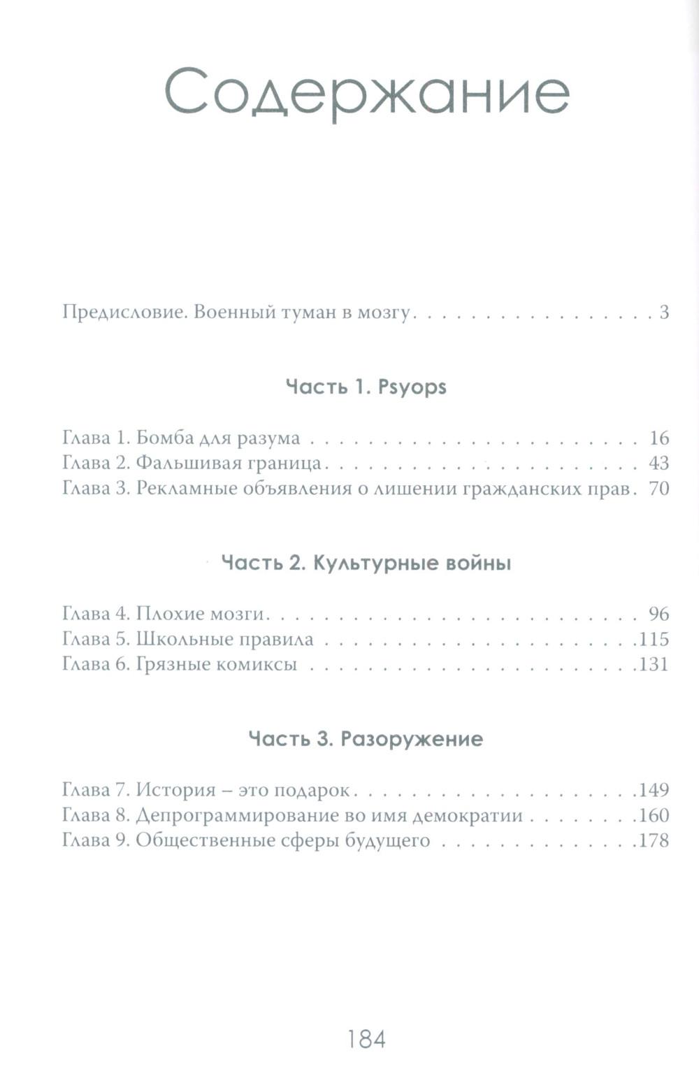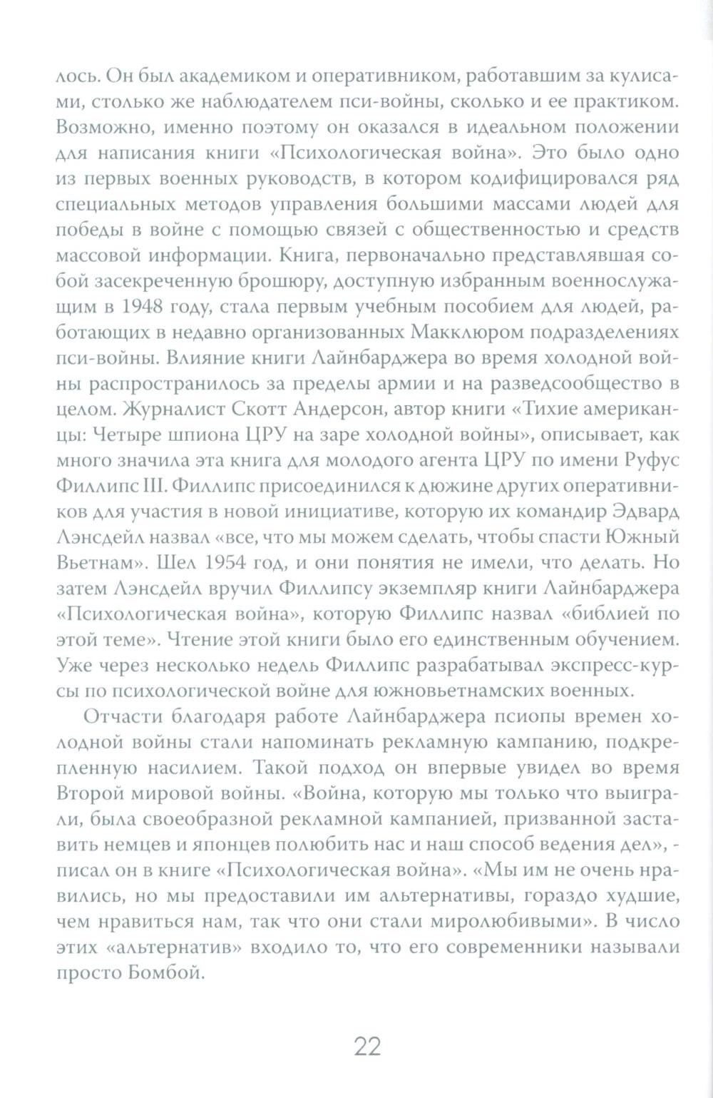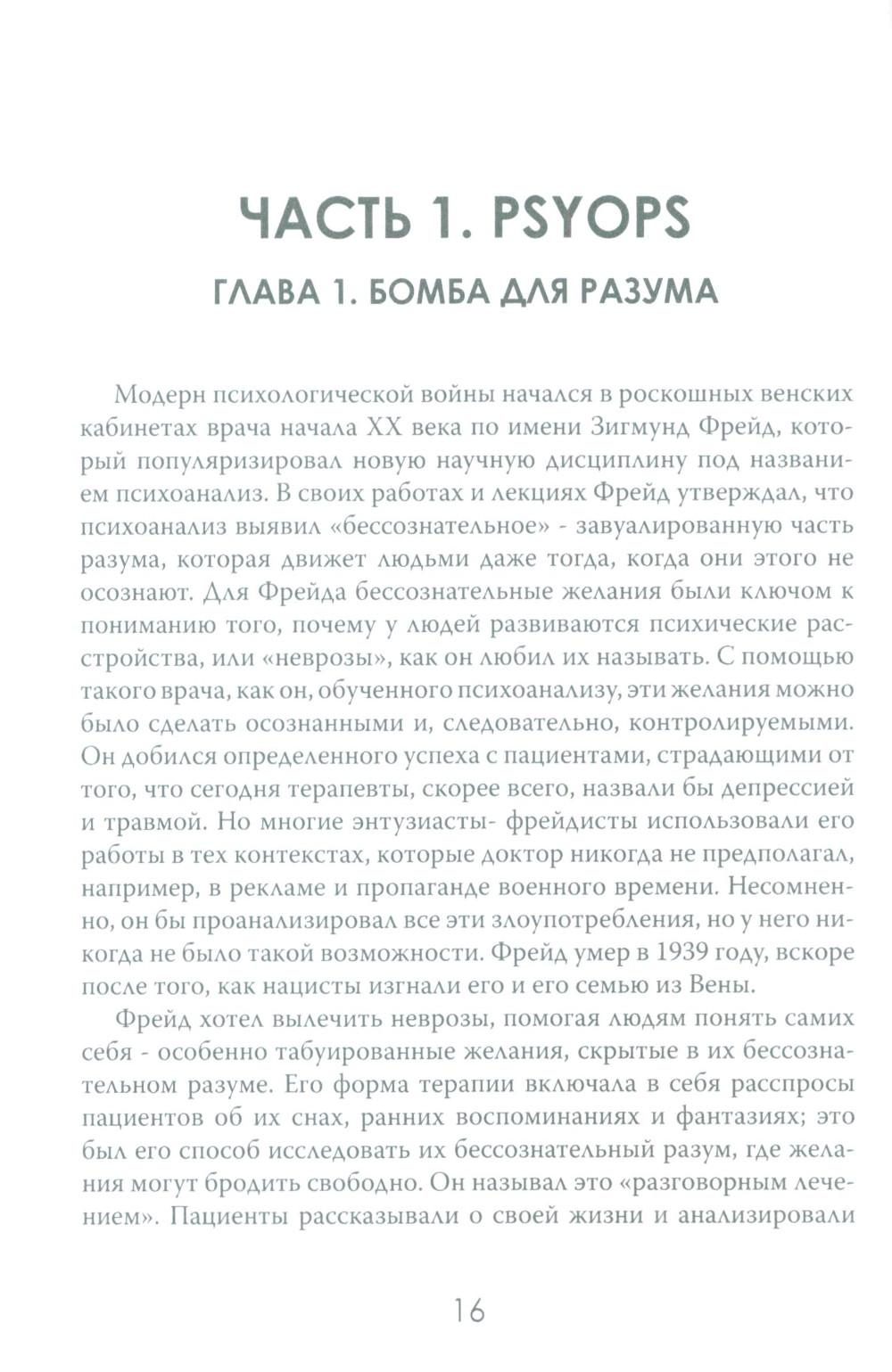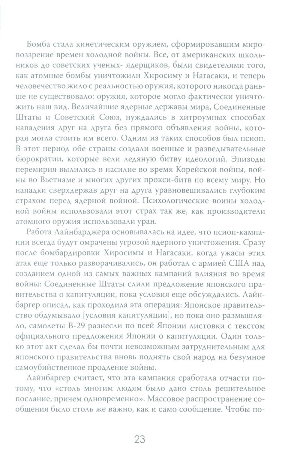 Военные действия происходят не только на поле боя. Не менее страшна и опасна война психологическая, внутренняя, осуществляемая при помощи дезинформации и пропаганды. Автор всесторонне исследует историю информационных войн США, начиная с XIX века и до наших дней, раскрывает тайну секретного оружия Америки. В чём заключается главная цель психологической войны? Как идеи Зигмунда Фрейда использовались в массовых экспериментах? Каким образом немецкие фашисты во время Второй Мировой войны привлекали внимание радиослушателей? Что такое "фальшивая газета"? Как можно манипулировать людьми на основе их данных из соцсетей? Какова роль социальных сетей в предвыборных кампаниях? Каковы признаки "культурной войны"? Издание написано живым, доступным языком и содержит множество интересных примеров из истории, литературы и кинематографа. Автор помогает разобраться в серьёзных хитросплетениях психологических манипуляторов, что позволит читателям в дальнейшем отличать правду от пропагандистской и рекламной лжи.| Издательство | Картина мира |