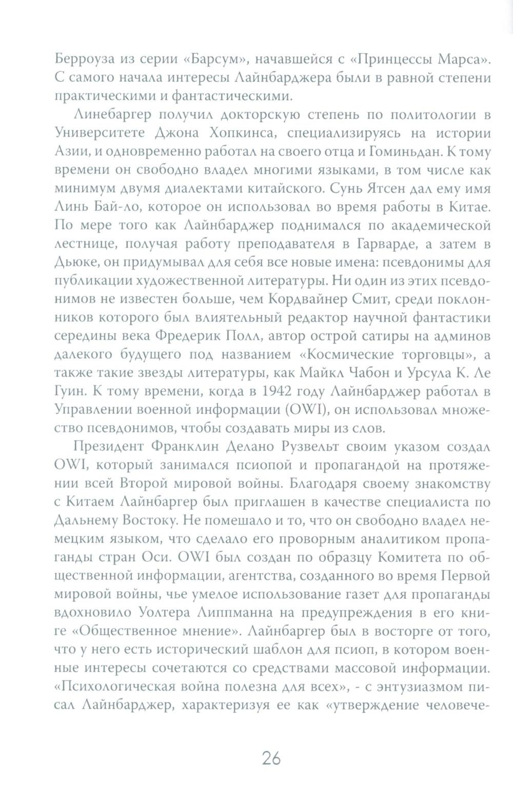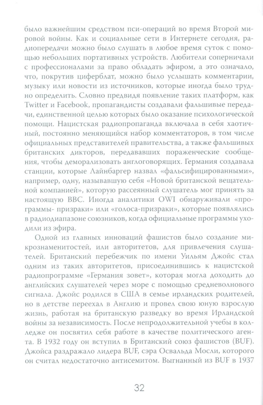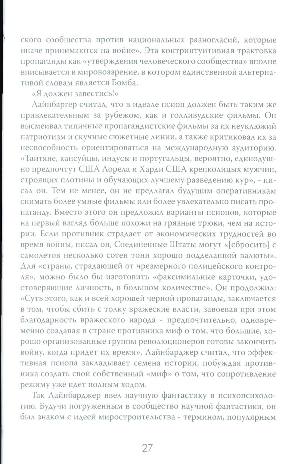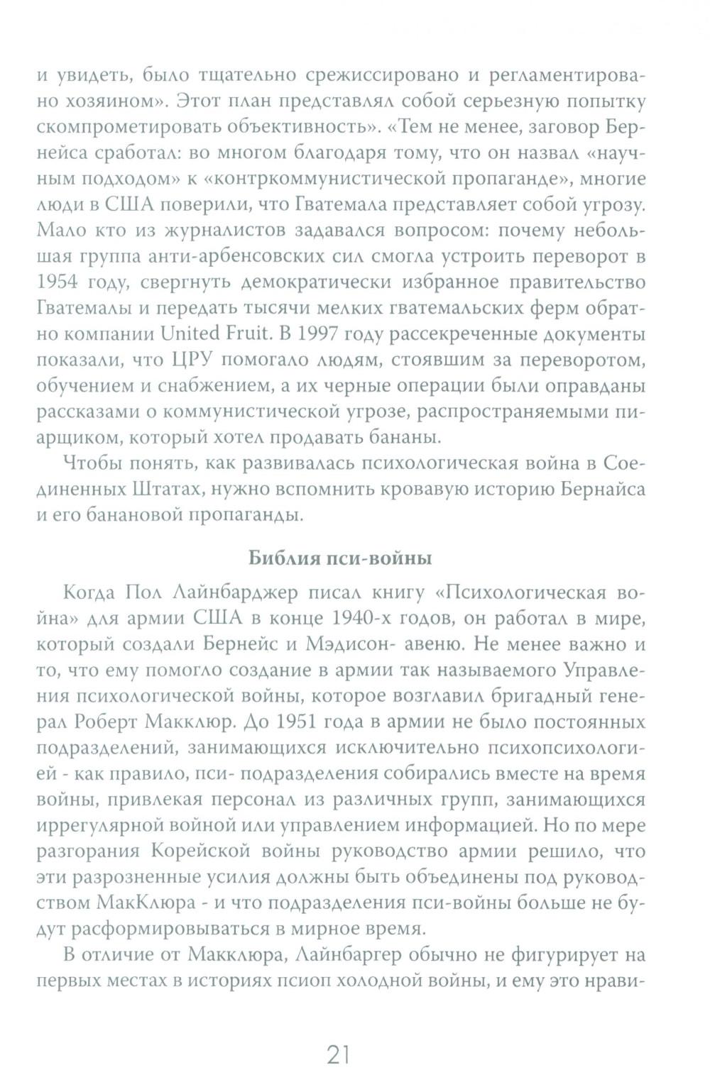 Военные действия происходят не только на поле боя. Не менее страшна и опасна война психологическая, внутренняя, осуществляемая при помощи дезинформации и пропаганды. Автор всесторонне исследует историю информационных войн США, начиная с XIX века и до наших дней, раскрывает тайну секретного оружия Америки. В чём заключается главная цель психологической войны? Как идеи Зигмунда Фрейда использовались в массовых экспериментах? Каким образом немецкие фашисты во время Второй Мировой войны привлекали внимание радиослушателей? Что такое "фальшивая газета"? Как можно манипулировать людьми на основе их данных из соцсетей? Какова роль социальных сетей в предвыборных кампаниях? Каковы признаки "культурной войны"? Издание написано живым, доступным языком и содержит множество интересных примеров из истории, литературы и кинематографа. Автор помогает разобраться в серьёзных хитросплетениях психологических манипуляторов, что позволит читателям в дальнейшем отличать правду от пропагандистской и рекламной лжи.| Издательство | Картина мира |