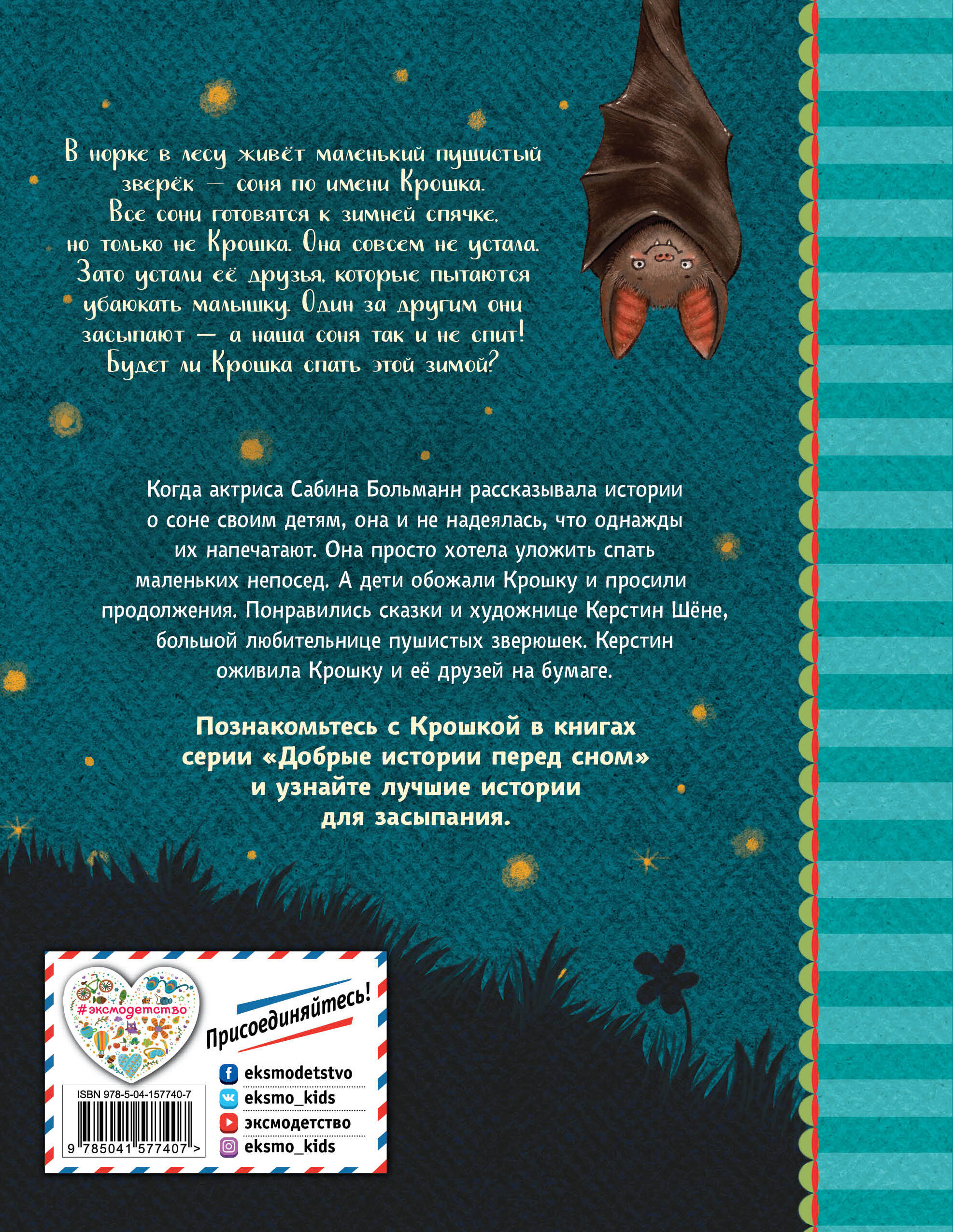 Поздняя осень. Пора зимней спячки. Все сони спят. И только к соне Крошке сон никак не приходит. Может быть, посчитать овечек или послушать колыбельную? Повисеть вниз головой или обнять любимую мягкую игрушку? Удастся ли ей уснуть? Серия книг «Добрые истории перед сном» рассчитана на малышей, которых нелегко уложить спать. Их ждут интересные и увлекательные истории о приключениях лесной сони Крошки и её друзей, сопровождаемые красочными и милыми иллюстрациями немецкой художницы Керстин Шёне.| Издательство | ООО "Издательство "Эксмо" |