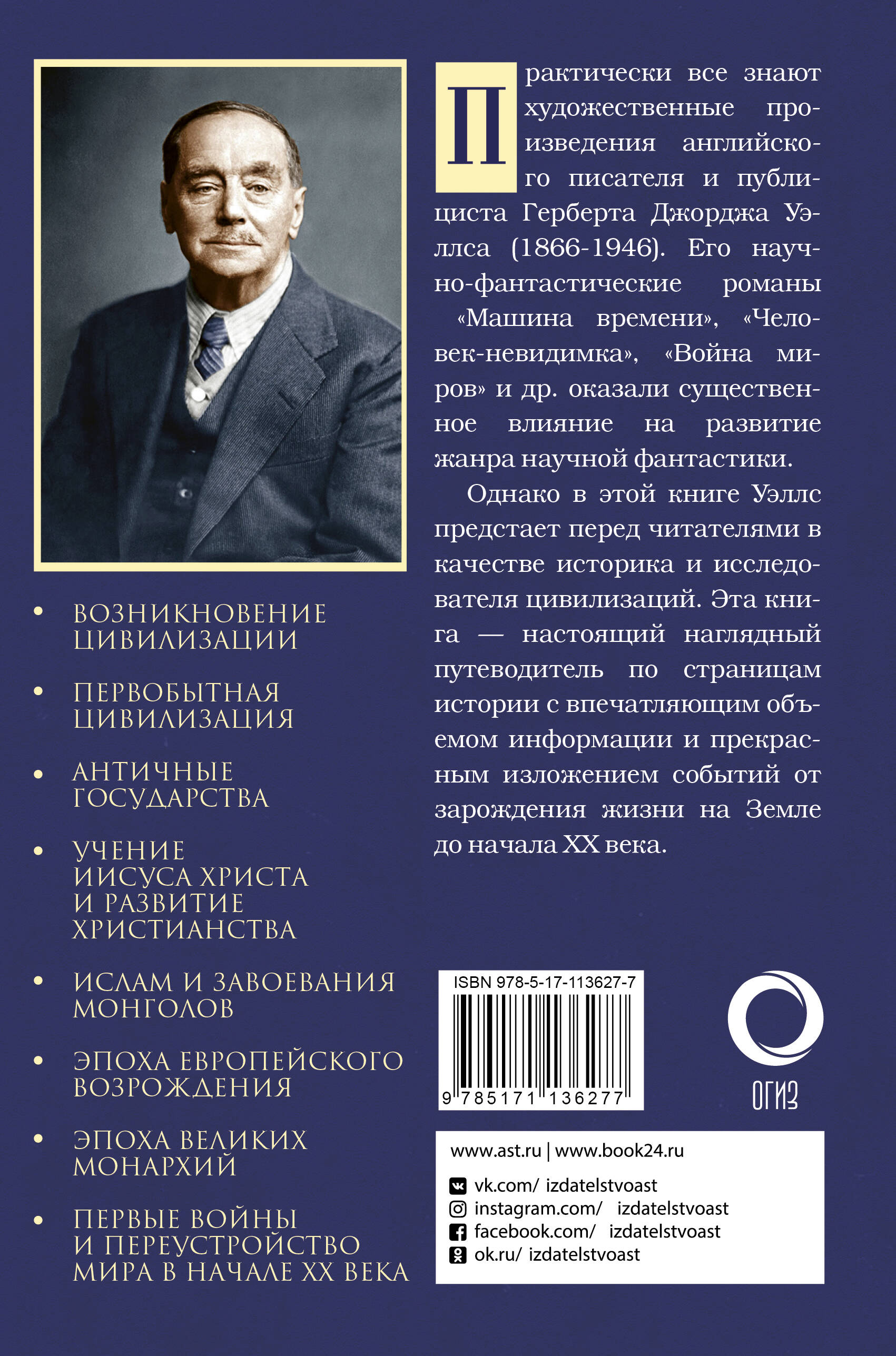 Практически все знают художественные произведения английского писателя и публициста Герберта Джорджа Уэллса (1866-1946). Его научно-фантастические романы "Машина времени", "Человек-невидимка", "Война миров" и др. оказали существенное влияние на развитие жанра научной фантастики. Однако в этой книге Уэллс предстает перед читателями в качестве историка и исследователя цивилизаций. Эта книга - настоящий наглядный путеводитель по страницам истории с впечатляющим объемом информации и прекрасным изложением событий от зарождения жизни на Земле до начала ХХ века.| Издательство | ИЗДАТЕЛЬСТВО "АСТ" |
