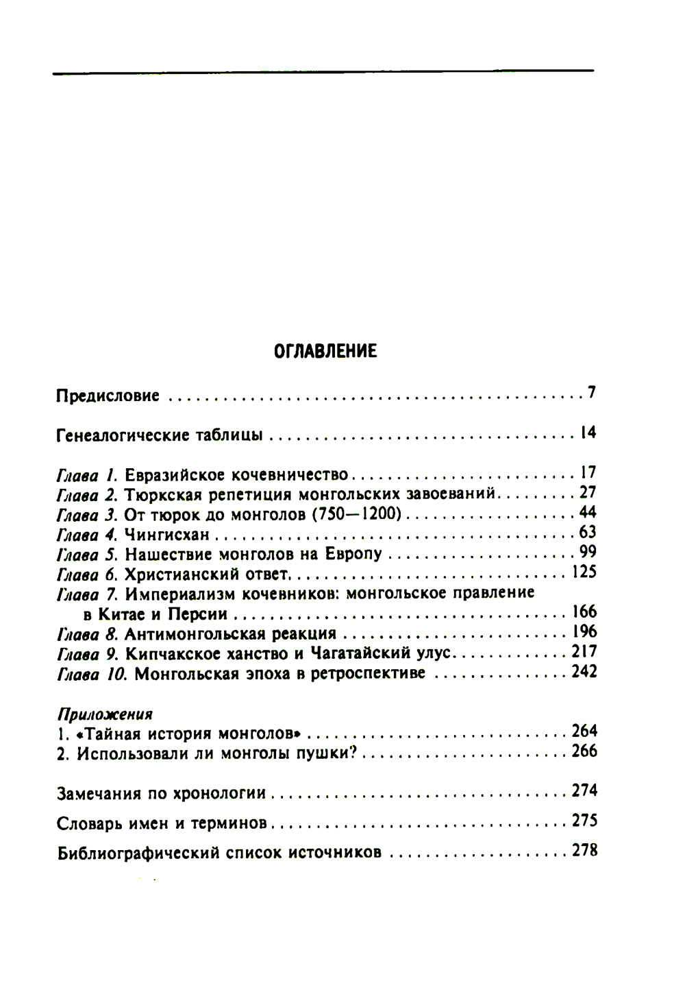 Книга посвящена непревзойденным по размаху монгольским завоеваниям XIII века, когда кочевники Центральной Азии в течение короткого времени завладели территорией, которая простиралась через всю Азию до границ с Германией и берегов Адриатического моря. Автор излагает документально подтвержденную историю взлета и падения великой монгольской империи. Рассказывает о евразийском кочевничестве, нашествии монголов на Европу и христианском ответе на него. Приводит подробности правления монголов в Китае и Персии. Рисует портреты их правителей: великих ханов, и прежде всего легендарного Чингисхана, монгольских властителей Китая и ханов Золотой и Белой Орды. Повествование завершается тем, как монголы были остановлены на краю Европы и вытеснены с Ближнего Востока.