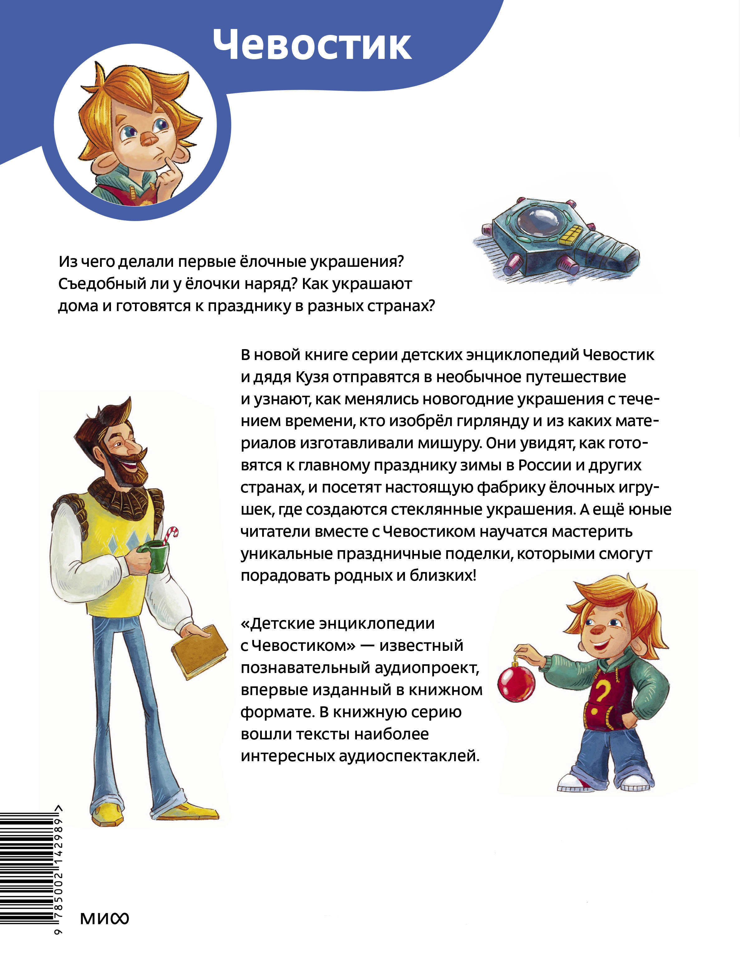 Из чего делали первые елочные игрушки? Кто такой Йоулупукки? Съедобный ли у елочки наряд? Как украшают дома и готовятся к празднику в разных странах? Зачем болгарам сурвачки, а грузинам - чичилаки? В новой книге серии детских энциклопедий Чевостик и дядя Кузя отправятся в увлекательное путешествие и узнают, как менялись новогодние украшения с течением времени, кто изобрел гирлянду и из каких материалов изготавливали мишуру. Они увидят, как готовятся к главному празднику зимы в России и в других странах, посетят настоящую фабрику елочных игрушек, где создаются стеклянные шары, и привезут домой двенадцать необычных украшений. А еще юные читатели вместе с Чевостиком научатся мастерить уникальные праздничные поделки, которыми смогут порадовать родных и близких! Кто такой Чевостик? Чевостик - симпатичный герой из известного аудиопроекта. Сегодня ребята знают его по энциклопедиям. В серии продолжают выходить книги, которые объясняют ребенку устройство мира. Дети гораздо лучше воспринимают информацию, когда о мире им рассказывает какой-нибудь сказочный персонаж. Именно поэтому девчонки и мальчишки так любят подобные энциклопедии. Чевостик вместе с дядей Кузей совершает удивительные путешествия в мир наук: физики, химии, астрономии, анатомии, геологии и других. Он рассказывает детям о великих географических открытиях, покорении космоса и волшебных химических превращениях. Для кого эта книга: Для любознательных детей от 6 лет. Для всех-всех фанатов Чевостика. Для дошкольников и младших школьников.| Издательство | МАНН, ИВАНОВ И ФЕРБЕР ООО |