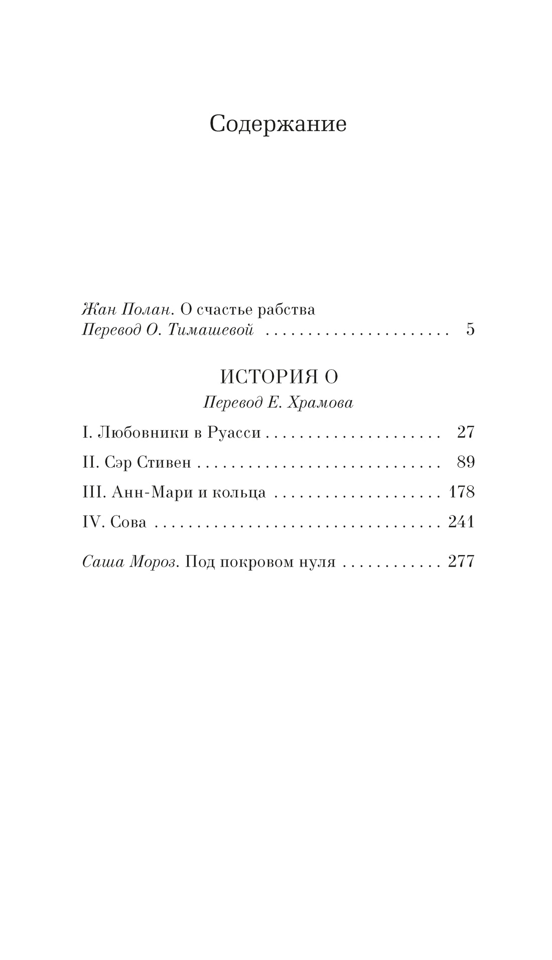 С первой же публикации в 1954 году «История О» считается одной из самых подрывных книг в истории французской и мировой литературы. Написанный многолетней участницей редакционного совета крупнейшего французского издательства «Галлимар», журналисткой, переводчицей Т. С. Элиота, Вирджинии Вульф, Ф. Скотта Фицджеральда и Ивлина Во, обладательницей ордена Почетного легиона Доминик Ори (она же Анна Декло), многие годы скрывавшейся под псевдонимом Полин Реаж, этот роман - страстное любовное послание, предельно откровенный анализ истинных движений души, с которой сорваны все покровы, и революционный для своего времени взгляд на женскую сексуальность.| Издательство | Азбука |