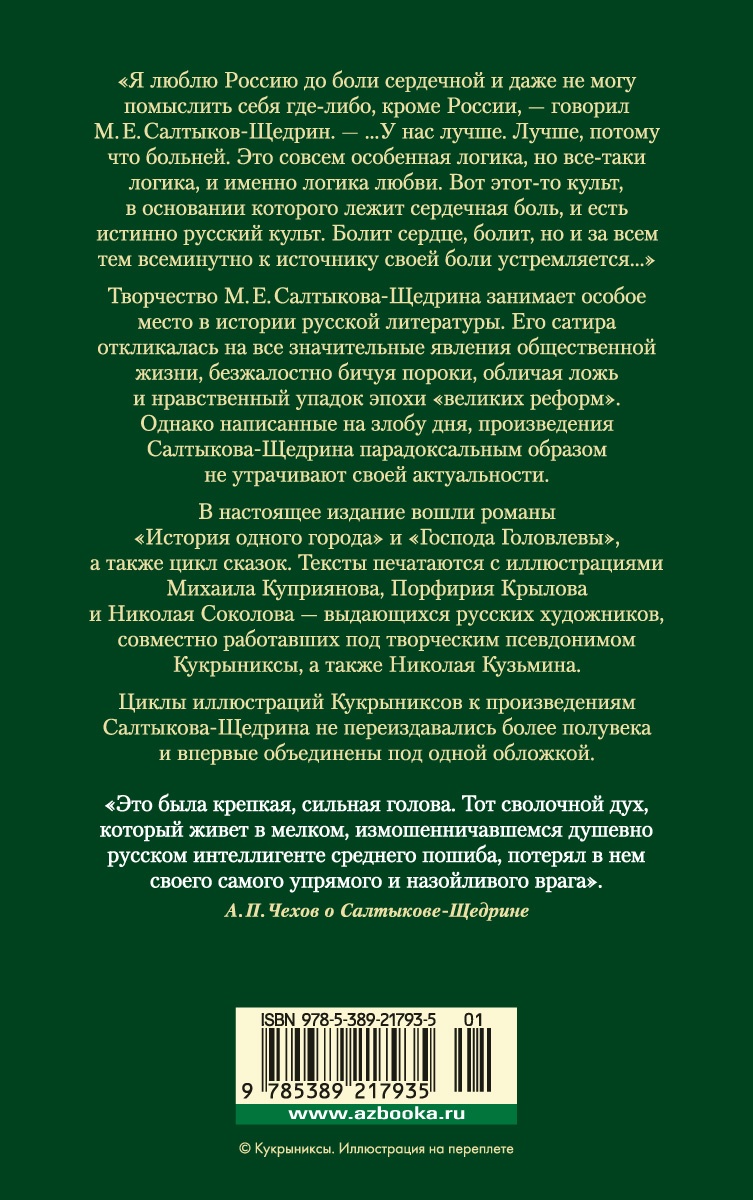 Творчество М. Е. Салтыкова-Щедрина занимает особое место в истории русской литературы. Его сатира откликалась на все значительные явления общественной жизни, безжалостно бичуя пороки, обличая ложь и нравственный упадок эпохи «великих реформ». Однако написанные на злобу дня, произведения Салтыкова-Щедрина парадоксальным образом не утрачивают своей актуальности. В настоящее издание вошли романы «История одного города» и «Господа Головлевы», а также сказки. Тексты печатаются с иллюстрациями Михаила Куприянова, Порфирия Крылова и Николая Соколова - выдающихся русских художников, совместно работавших под творческим псевдонимом Кукрыниксы, а также Николая Кузьмина.| Издательство | Азбука |