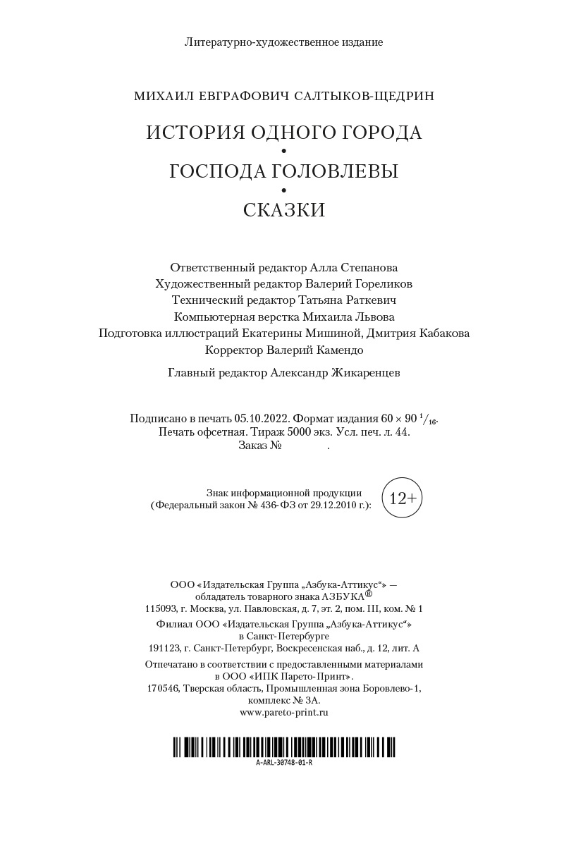 Аннотация: История одного города. Господа Головлевы. Сказки