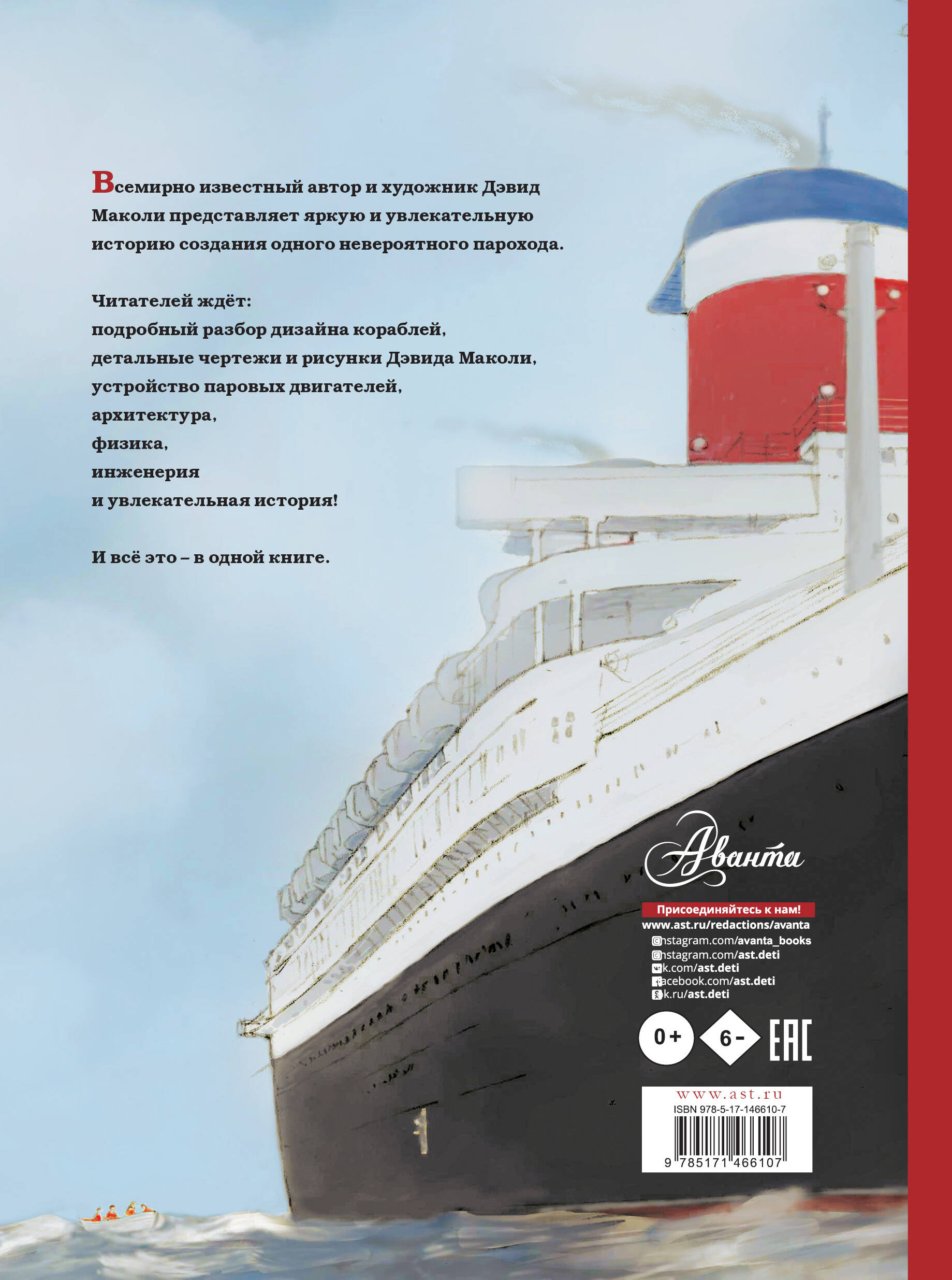 Всемирно известный автор и художник Дэвид МАКОЛИ Маколи представляет яркую и увлекательную историю создания одного невероятного парохода. Читателей ждёт: подробный разбор дизайна кораблей, детальные чертежи и рисунки Дэвида Маколи, устройство паровых двигателей, архитектура, физика, инженерия и увлекательная история! И всё это - в одной книге.