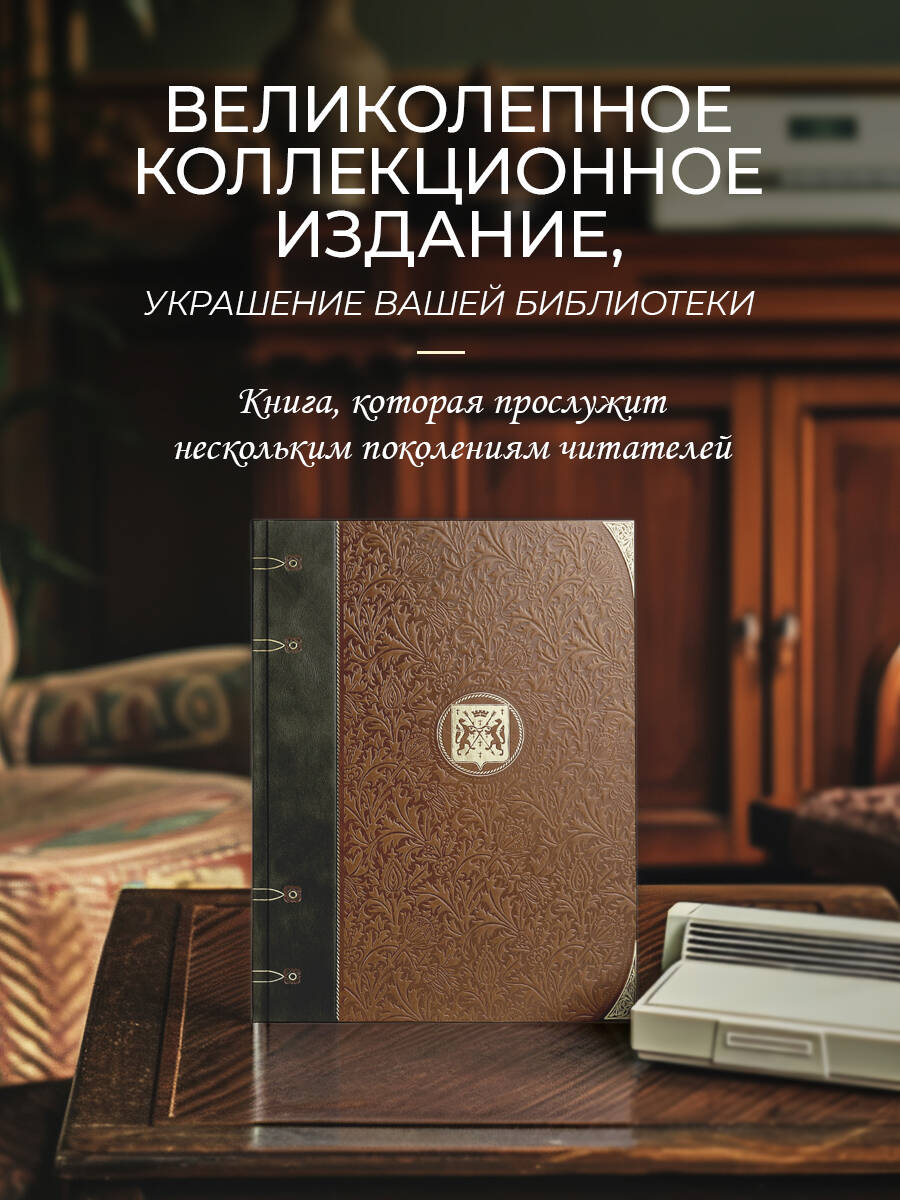 Книга в коллекционном инкрустированном переплете. Переплет изготовлен их двух видов натуральной кожи по технологии XIX века и украшен сплошным тончайшим тиснением, в полном соответствии с лучшими образцами переплетов европейских мастеров. Использовано 3 вида тиснения - золото,черный натуральный пигмент и рельефное тиснение. В оформлении переплета использованы растительно-геометрические орнаменты, благодаря им книга будет отлично смотреться на любой книжной полке. Лента для закладывания страниц и каптал, скрепляющий верх и низ объемного тома, изготовлены из шелка. Бумага в книге легкая, матовая, что обеспечивает комфортное чтение даже длительное время, цветные иллюстрации напечатаны на мелованной бумаге. Обрез книги окрашен, торшонирован и вызолочен вручную. К книге прилагается сертификат, подтверждающий уникальность издания, он вложен в каждый экземпляр и пронумерован вручную.| Издательство | ООО "Издательство "Эксмо" |