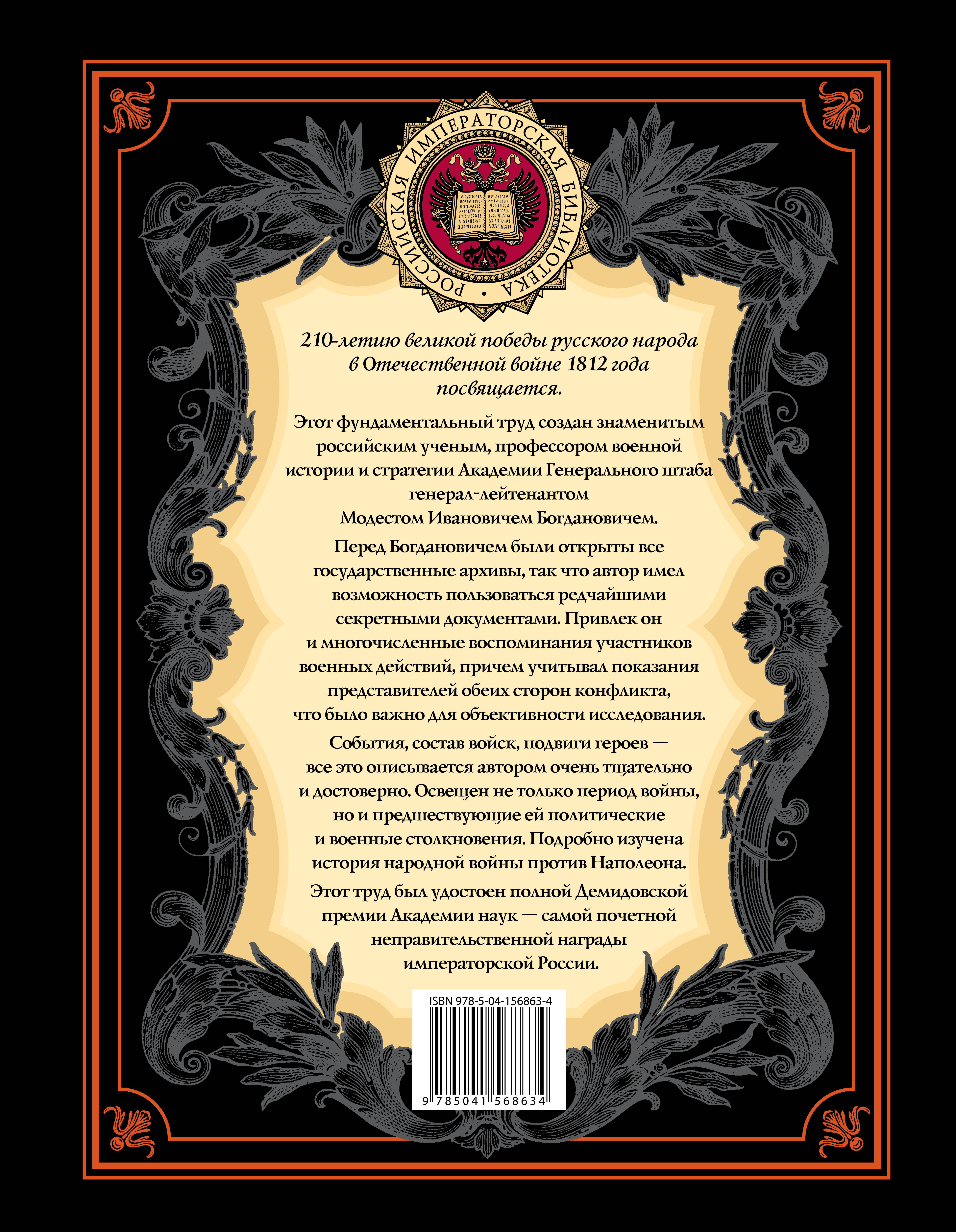 История Отечественной войны 1812 года - книга, приуроченная к 210-летию великой победы русского народа в Отечественной войне 1812 года. Эта война занимает значительное место в исторической памяти русского народа, она послужила вдохновением для многих великих творцов, таких как Толстой, Лермонтов, Верещагин… Практически сразу же после окончания войны эта тема стала привлекать внимание ученых, и этот интерес не утихает до сих пор. В новой книге из серии «Российская Императорская библиотека» представлена одна из самых фундаментальных работ, посвященных Отечественной войне 1812 года, написанная ее современником, но представляющая большой интерес и для современных читателей. Модест Иванович Богданович (1805-1882) - русский военный деятель и историк, генерал-лейтенант, профессор военной истории и стратегии академии Генерального штаба, автор множества трудов, посвященных военному искусству и современным ему военным конфликтам, таких как «История войны 1813 года за независимость Германии», «Восточная война 1853-1856 гг.» и т.д. «История Отечественной войны 1812 года» - одна из наиболее известных его работ, и не зря. Это фундаментальное издание охватывает не только саму Отечественную войну, но и первые войны Александра I с Наполеоном, в ней максимально подробно описана подготовка обеих сторон к большой войне, ход военных действий, приводятся многочисленные воспоминания участников как русской, так и французской армий. Работа была высоко оценена и современниками. В 1863 г. она была удостоена полной Демидовской премии Императорской академии наук, которая считалась самой почетной неправительственной наградой России середины XIX в. Что же отличает труд Богдановича от других работ, посвященных этой теме? В первую очередь, это доступ автора ко всем государственным архивам, даже самым секретным, а следовательно, работа с максимально широким рядом источников; объективность и беспристрастность; тщательная работа с текстом и подробный анализ всех происходивших событий. Все это позволяет говорить о книге «История Отечественной войны 1812 года» как о наиболее полном и фундаментальном труде на тему войны с Наполеоном. Эта книга подходит вам, если вас интересует история России XIX века, история военного дела, история наполеоновских войн, история внешней политики. Современное издание богато иллюстрировано редкими иллюстративными материалами; картами, подготовленными специально для этого издания; снабжено примечаниями и комментариями, а также подробным именным указателем, что будет интересно как профессионалам, так и просто любителям истории. А классическое серийное оформление сделает эту книгу настоящим украшением на вашей книжной полке. О СЕРИИ Серия «Российская императорская библиотека» - это грандиозное собрание выдающихся образцов отечественной мысли и словесности. Издания, вошедшие в серию, представляют собой лучшее в великом духовном наследии нашей страны. Это труды, созданные знаменитыми историками, учеными, великими государственными деятелями и посвященные тысячелетней истории России, ее культуре и искусству, военной славе, многовековым народным обычаям и деяниям выдающихся представителей нашего Отечества. Прекрасная возможность составить свою домашнюю библиотеку из великих трудов о великой стране. Каждая книга серии прекрасно проиллюст