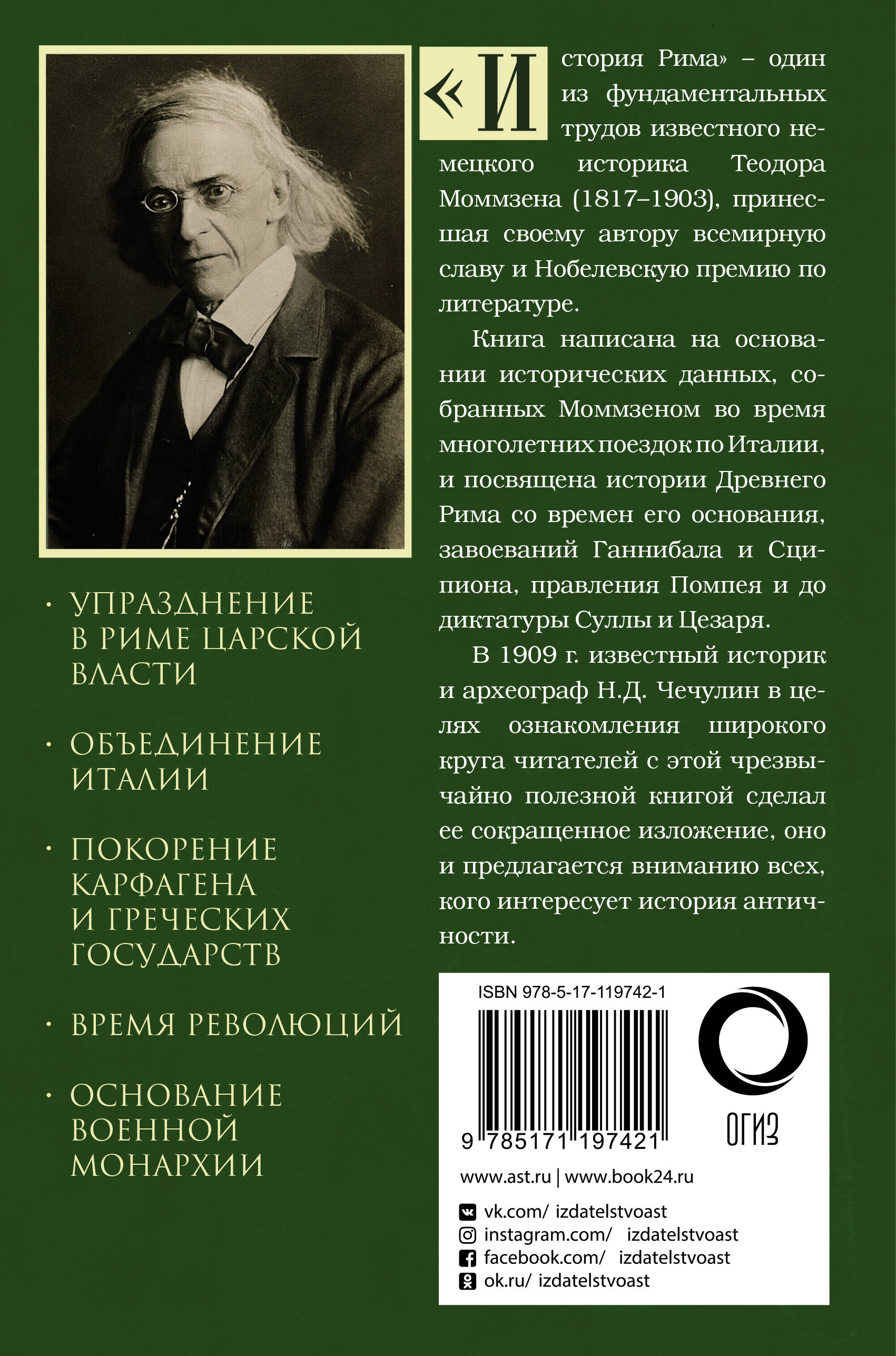 "История Рима" - один из фундаментальных трудов известного немецкого историка Теодора Моммзена (1817-1903), принесшая своему автору всемирную славу и Нобелевскую премию по литературе. Книга написана на основании исторических данных, собранных Моммзеном во время многолетних поездок по Италии, и посвящена истории Древнего Рима со времен его основания, завоеваний Ганнибала и Сципиона, правления Помпея и до диктатуры Суллы и Цезаря. В 1909 г. известный историк и археограф Н.Д. Чечулин в целях ознакомления широкого круга читателей с этой чрезвычайно полезной книгой сделал ее сокращенное изложение, оно и предлагается вниманию всех, кого интересует история античности.| Издательство | Издательство "АСТ" |