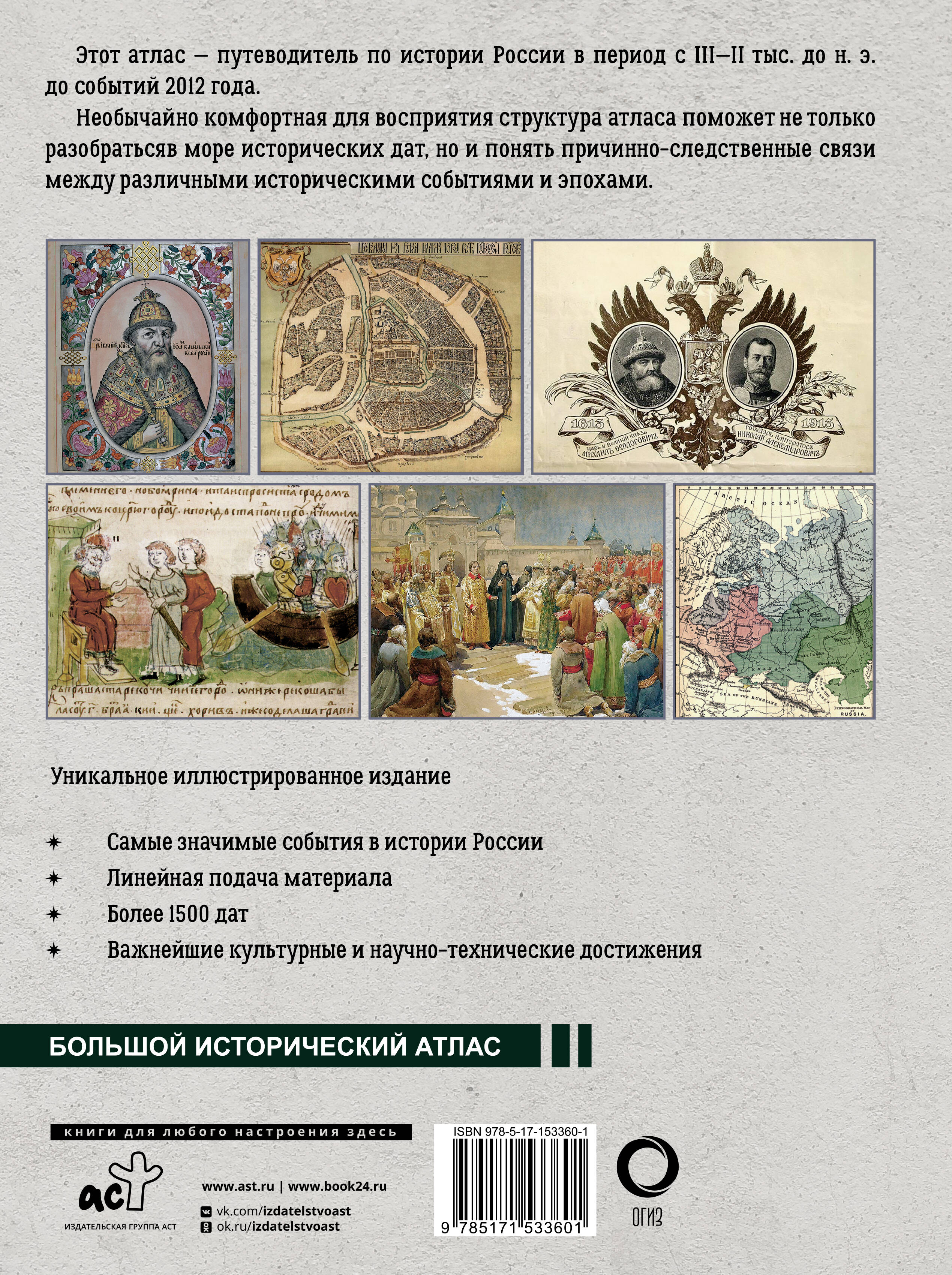 Этот атлас - путеводитель по истории России в период с III-II тыс. до н. э. до событий 2012 года. Необычайно комфортная для восприятия структура атласа поможет не только разобраться в море исторических дат, но и понять причинно-следственные связи между различными историческими событиями и эпохами.| Издательство | ИЗДАТЕЛЬСТВО "АСТ" |