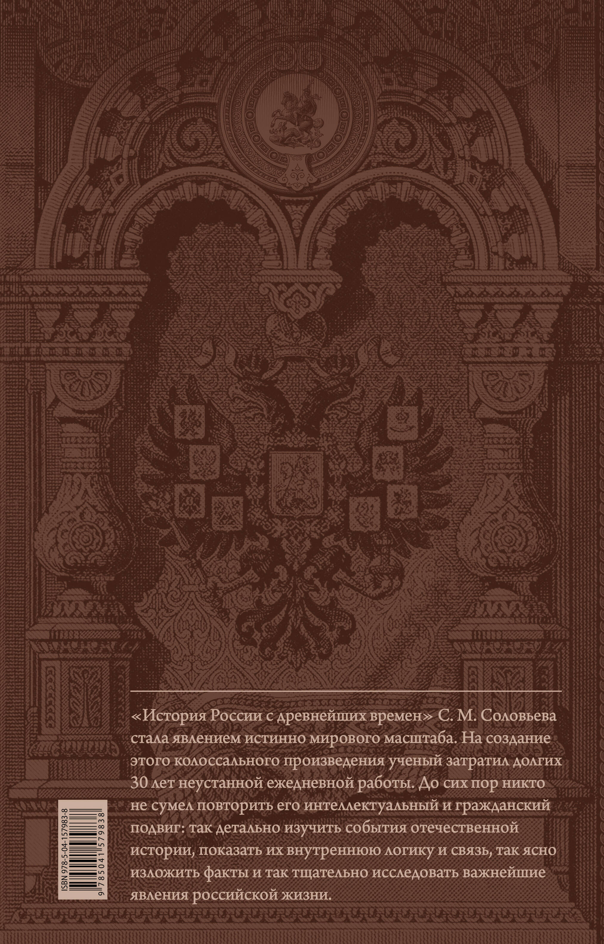 Фундаментальный труд «История России с древнейших времен» выдающегося ученого Сергея Михайловича Соловьева (1820-1879) не имеет себе равных в российской науке. Ни один из отечественных историков, ни до Соловьева, ни после него, в своих попытках изложить ход русской истории не охватывал такого огромного хронологического пространства: а ведь это двадцать три столетия, начиная с V века до нашей эры! Для науки «История России с древнейших времен» С. М. Соловьева стала явлением истинно мирового масштаба. На создание этого колоссального произведения ученый затратил долгих 30 лет неустанной ежедневной работы. До сих пор никто не сумел повторить его интеллектуальный и гражданский подвиг: так детально изучить события отечественной истории, показать их внутреннюю логику и связь, так ясно изложить факты и так тщательно исследовать важнейшие явления российской жизни. 200-летию со дня рождения величайшего историка Земли Русской- Сергея Михайловича Соловьева (1820) и 170-летию со дня выхода в свет 1-го тома его фундаментального многотомного труда «История России с древнейших времен» (1851) посвящает издательство это юбилейное иллюстрированное издание.