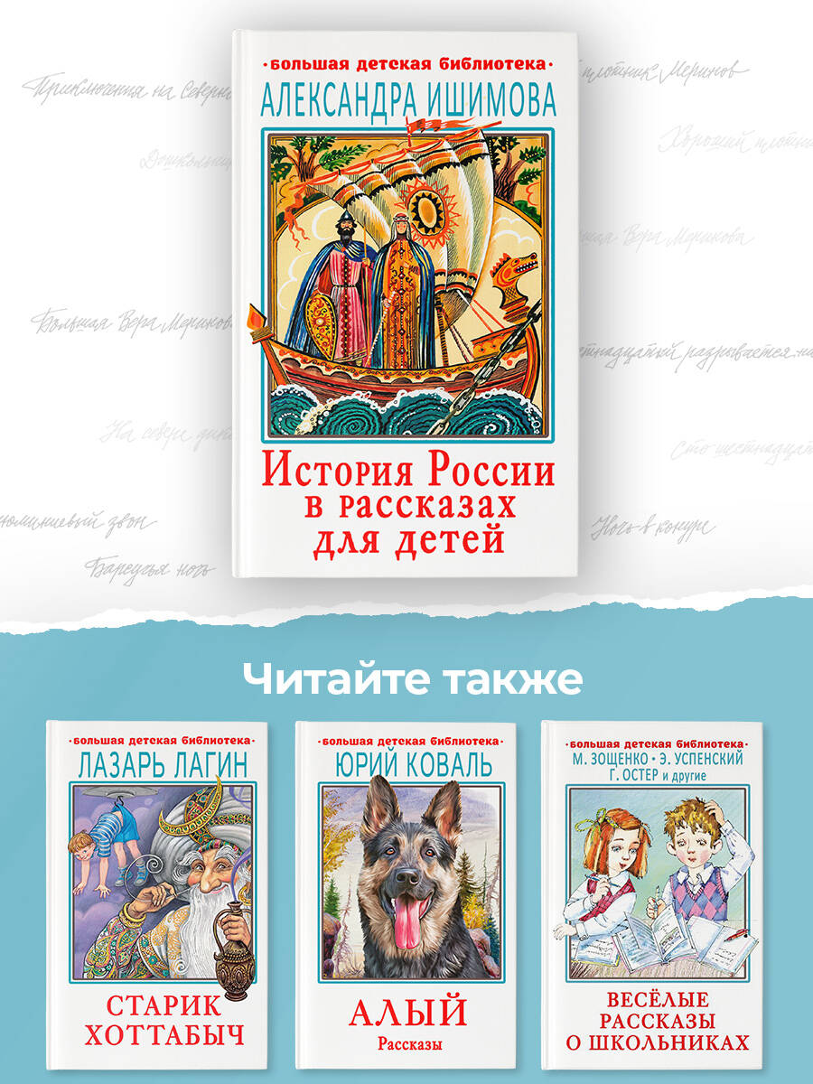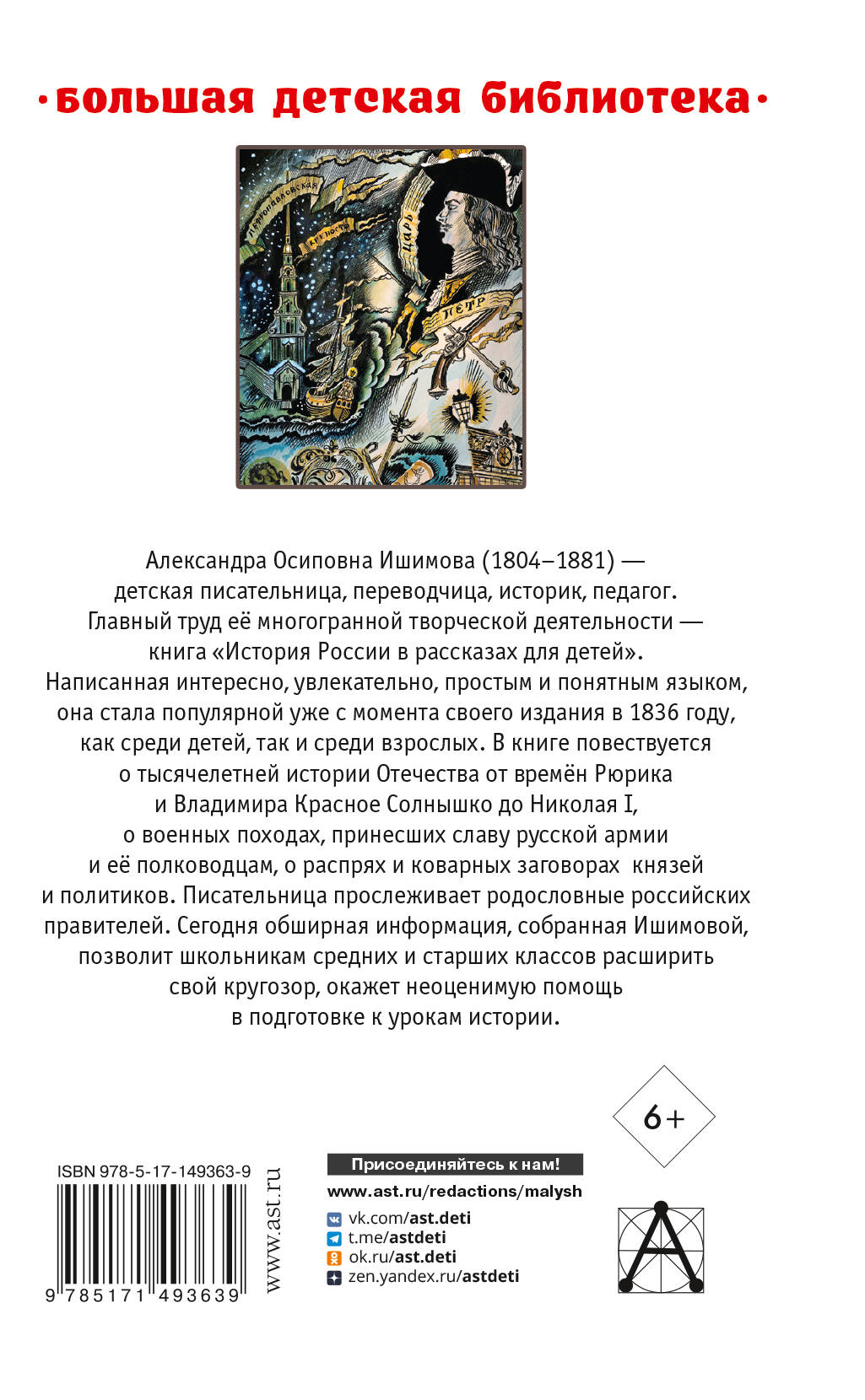 Александра Осиповна Ишимова (1804-1881) - рус- ская детская писательница, переводчица, педагог. За основу будущей исторической книги "История России в рассказах для детей" (1836) была взята "История" Карам- зина, которую А.О. Ишимова перечитала несколько раз. Известно, что над своей книгой писательница работала шесть лет. Написанная для детей, "История" А. Ишимовой интересна и взрослому читателю: в ней собрана обширная информация о тысячелетней истории Отечества. За свой исторический труд писательница получила почётную Де- мидовскую премию Российской академии наук. Кроме работы над книгой, А.О. Ишимова преподавала, переводила с английского, а также занималась издатель- ской деятельностью. С 1841 по 1862 год писательница из- давала детский журнал "Звёздочка". О творчестве А.О. Ишимовой высоко отзывались В.А. Жуковский, А.С. Пушкин, Н.В. Гоголь и другие ве- ликие писатели. Известный русский критик В.Г. Белинский так оцени- вал творчество писательницы: "История" госпожи Иши- мовой - важное приобретение для русской литературы: так богато сочинение её другими достоинствами, между которыми первое место занимает превосходный рассказ и прекрасный язык, обличающие руку твердую, опытность литературную, основательное изучение предмета, неутоми- мое трудолюбие".| Издательство | АСТ |