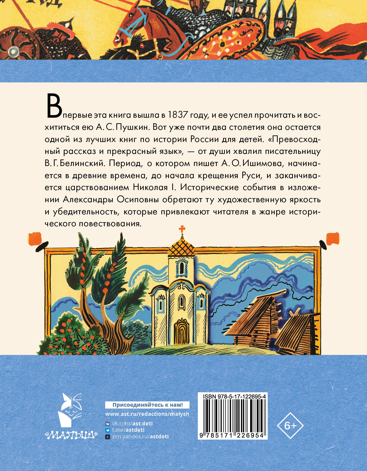 Редко встретишь книгу по истории России, в которой достоверность встречается с легкостью и ясностью повествования. Книга Александры Осиповны Ишимовой (1804-1881) "История России в рассказах для детей" обладает именно такими качествами. А.С. Пушкин хвалил стиль письма А.О. Ишимовой, и действительно, книга написана увлекательно и доступно для ребенка. Великие князья, цари и императоры, борьба за власть, войны и бунты - об этом и многом другом пишет А.О. Ишимова в одной из лучших книг для детей по истории России. Рисунки А. Аземши. Для среднего школьного возраста.| Издательство | ИЗДАТЕЛЬСТВО "АСТ" |