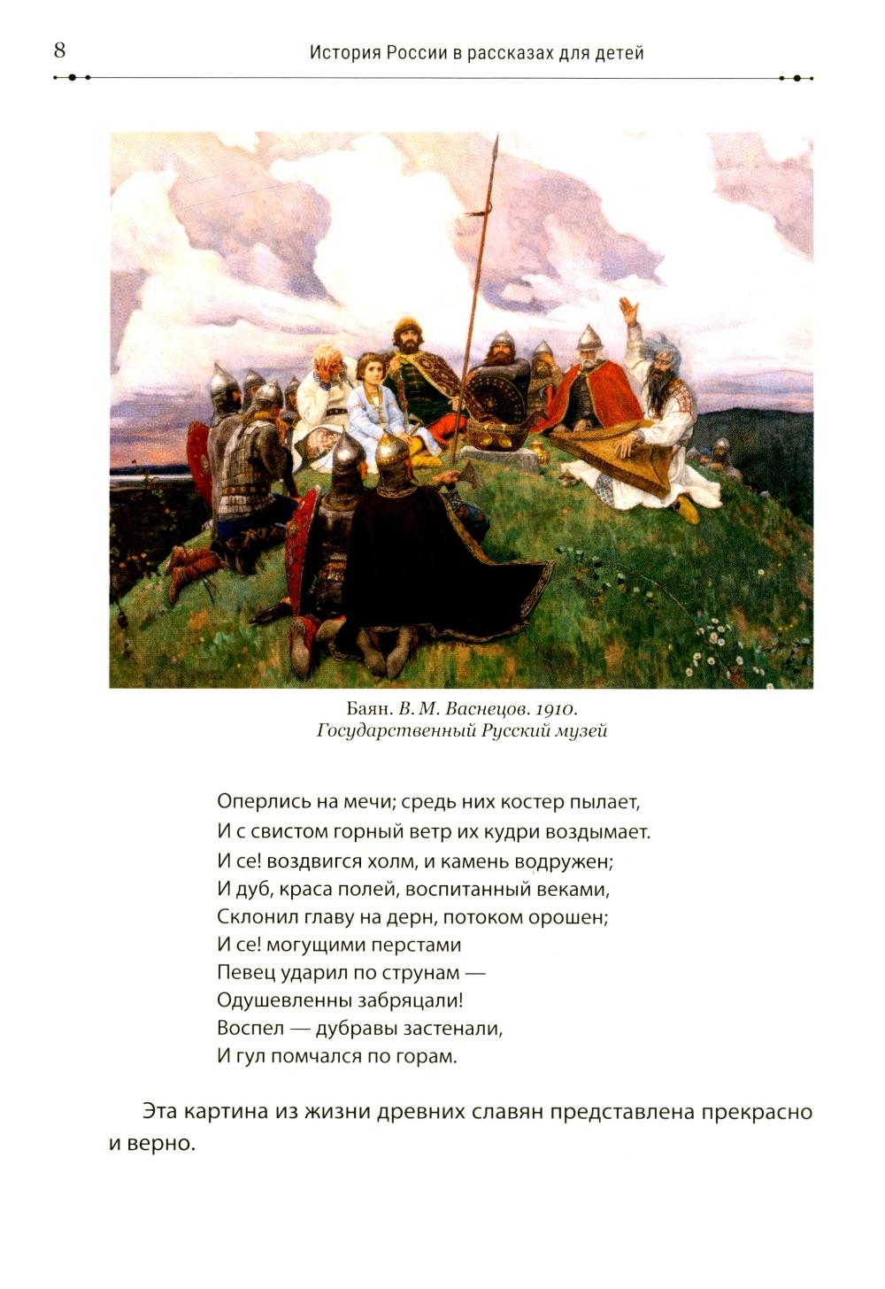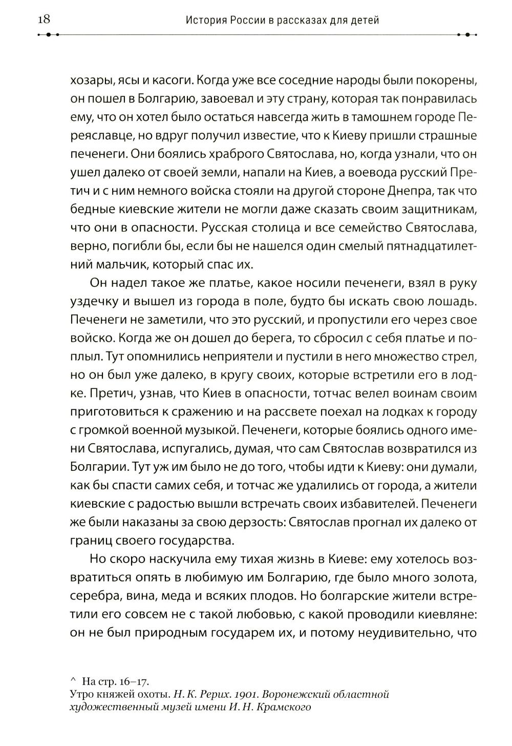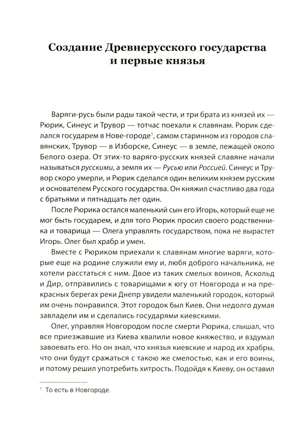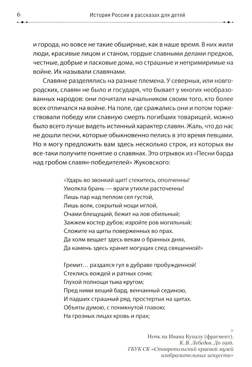 Первые рассказы А. О. Ишимовой были восторженно встречены как ведущими русскими литераторами, так и юными читателями. Она изложила историю России для детей наподобие того, как В. Скотт рассказал историю Англии английским детям. Предварительно писательница изучила все доступные к тому времени источники по русской истории и прежде всего «Историю государства Российского» Н. М. Карамзина. «Рассказ г-жи Ишимовой до того картинен, жив, увлекателен, язык так прекрасен, что чтение ее истории есть истинное наслаждение - не для детей, которым чтение истории, какой бы то ни было, совершенно бесполезно, потому что для них в ней нет ничего интересного и доступного, - а для молодых, взрослых и даже старых людей... "История" г-жи Ишимовой - важное приобретение для русской литературы: так богато сочинение ее другими достоинствами, между которыми первое место занимает превосходный рассказ и прекрасный язык, обличающие руку твердую, опытность литературную, основательное изучение предмета, неутомимое трудолюбие», - писал В. Г. Белинский. Особенностью настоящего издания является богатейший иллюстративный материал, тщательно подобранный из лучших музеев России и частных коллекций, который поможет познакомить ребенка с шедеврами русской исторической живописи. Для широкого круга читателей.
