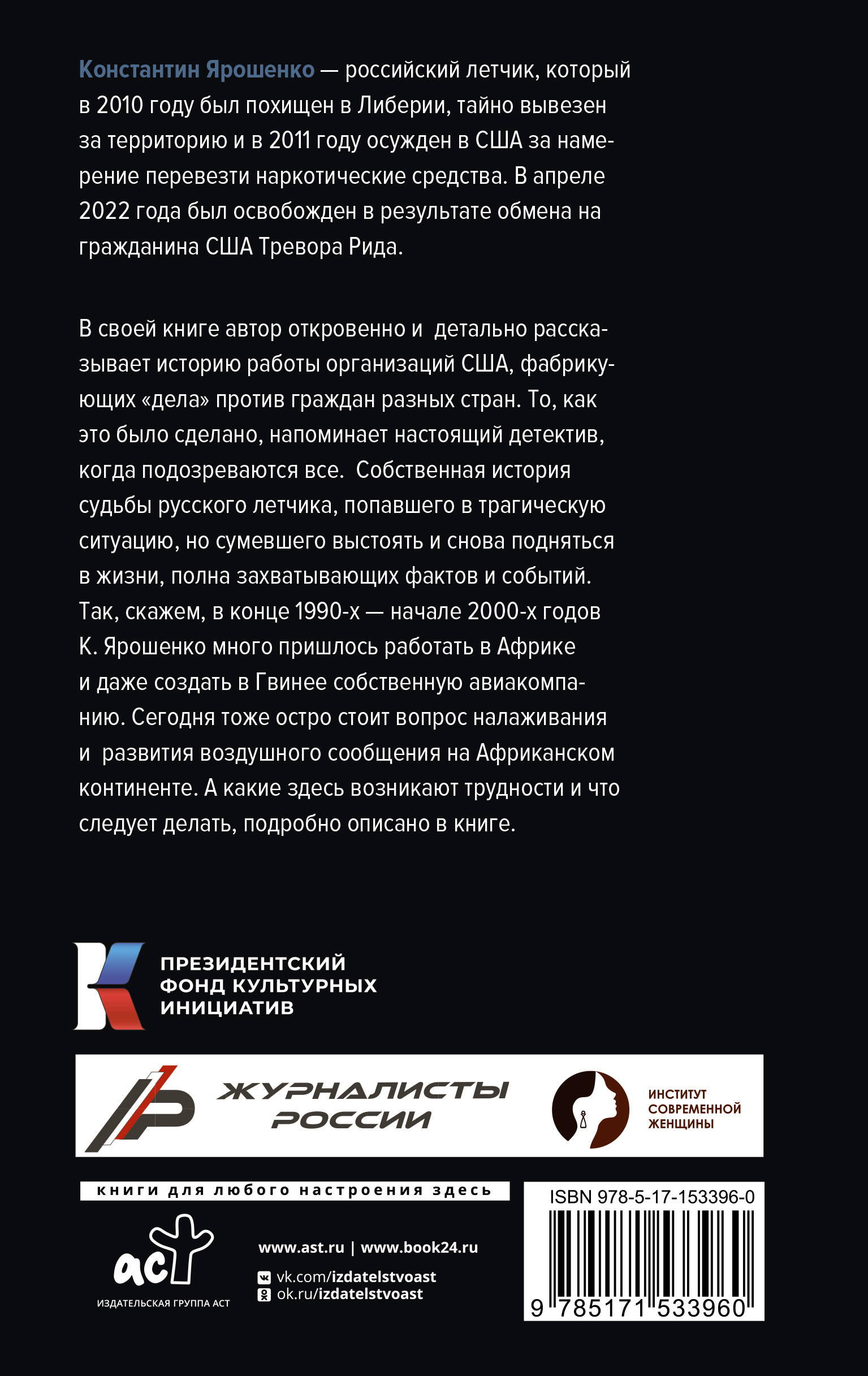 Константин Ярошенко - российский летчик, который в 2010 году был похищен в Либерии, тайно вывезен за территорию и в 2011 году осужден в США за намерение перевезти наркотические средства. В апреле 2022 года был освобожден в результате обмена на гражданина США Тревора Рида. В своей книге автор откровенно и детально рассказывает историю работы организаций США, фабрикующих "дела" против граждан разных стран. То, как это было сделано, напоминает настоящий детектив, когда подозреваются все. Собственная история судьбы русского летчика, попавшего в трагическую ситуацию, но сумевшего выстоять и снова подняться в жизни, полна захватывающих фактов и событий. Так, скажем, в конце 1990-х - начале 2000-х годов К. Ярошенко много пришлось работать в Африке и даже создать в Гвинее собственную авиакомпанию. Сегодня тоже остро стоит вопрос налаживания и развития воздушного сообщения на Африканском континенте. А какие здесь возникают трудности и что следует делать, подробно описано в книге.| Издательство | Издательство "АСТ" |