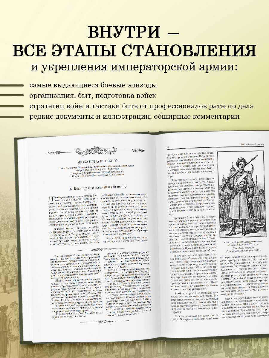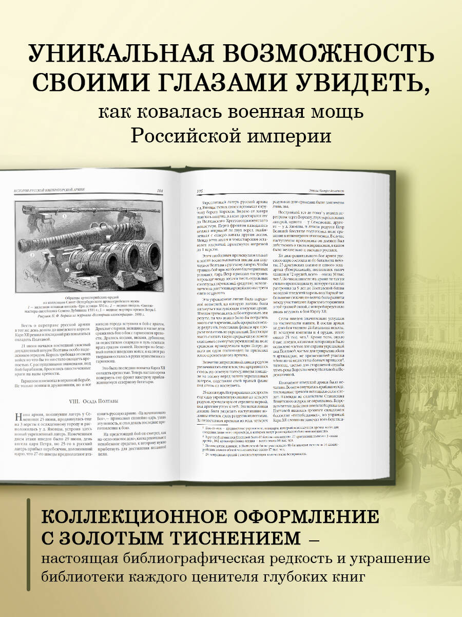 «История русской императорской армии» - уникальное издание, посвященное ключевым событиям русской военной истории, ее легендарным сражениям и прославленным вершителям. Подготовленные боевыми офицерами академии Генерального штаба, данные тексты иллюстрируют важнейшие боевые операции, описание военных тактик и стратегий, к которым прибегали виднейшие военачальники своего времени: А. В. Суворов, М. И. Голенищев-Кутузов, М. Д. Скобелев и многие другие. Историю великих побед прекрасно дополняют красочные цветные и черно-белые иллюстрации, посвященные различным этапам становления и укрепления боевой мощи Российской империи. Подарочное издание в качественном переплете с богатым иллюстративным рядом позволит погрузиться в сложную и захватывающую историю Отечества и увидеть то, что на многие годы вперед определило Россию как великую и мощную военную державу. Будучи настоящей библиографической редкостью, данное издание станет прекрасным дополнением к библиотеке истинного коллекционера и ценителя редких и глубоких книг.| Издательство | ООО "Издательство "Эксмо" |
