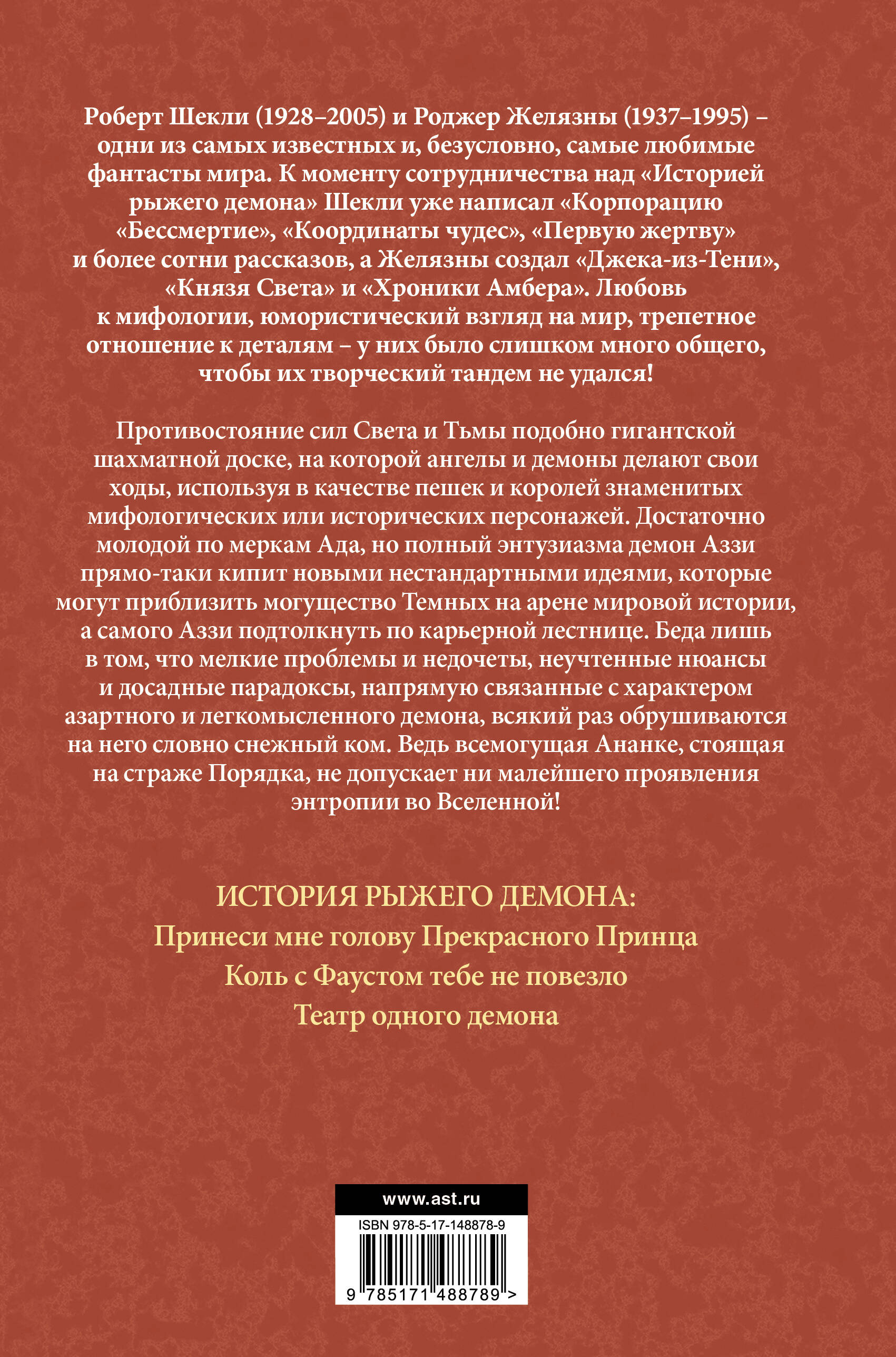 Классика мировой фантастики. Для всех поклонников Гарри Гаррисона, Айзека Азимова и Роберта Хайнлайна. Вся трилогия под одной обложкой. Юный Аззи - непутёвый демон: в соревновании между силами Тьмы и силами Света он получает награды обеих сторон, а когда начинает скучать - спускается к людям, чтобы поставить для них «пьесу о безнравственности». То ли юному демону не хватает дальновидности, то ли Судьба настроена против него, но Аззи то и дело попадает в глупейшие ситуации. Многочисленные аллюзии на классические произведения мировой литературы придают трилогии ещё большей комичности, а философская составляющая наделает их неожиданными подтекстами.| Издательство | ИЗДАТЕЛЬСТВО "АСТ" |