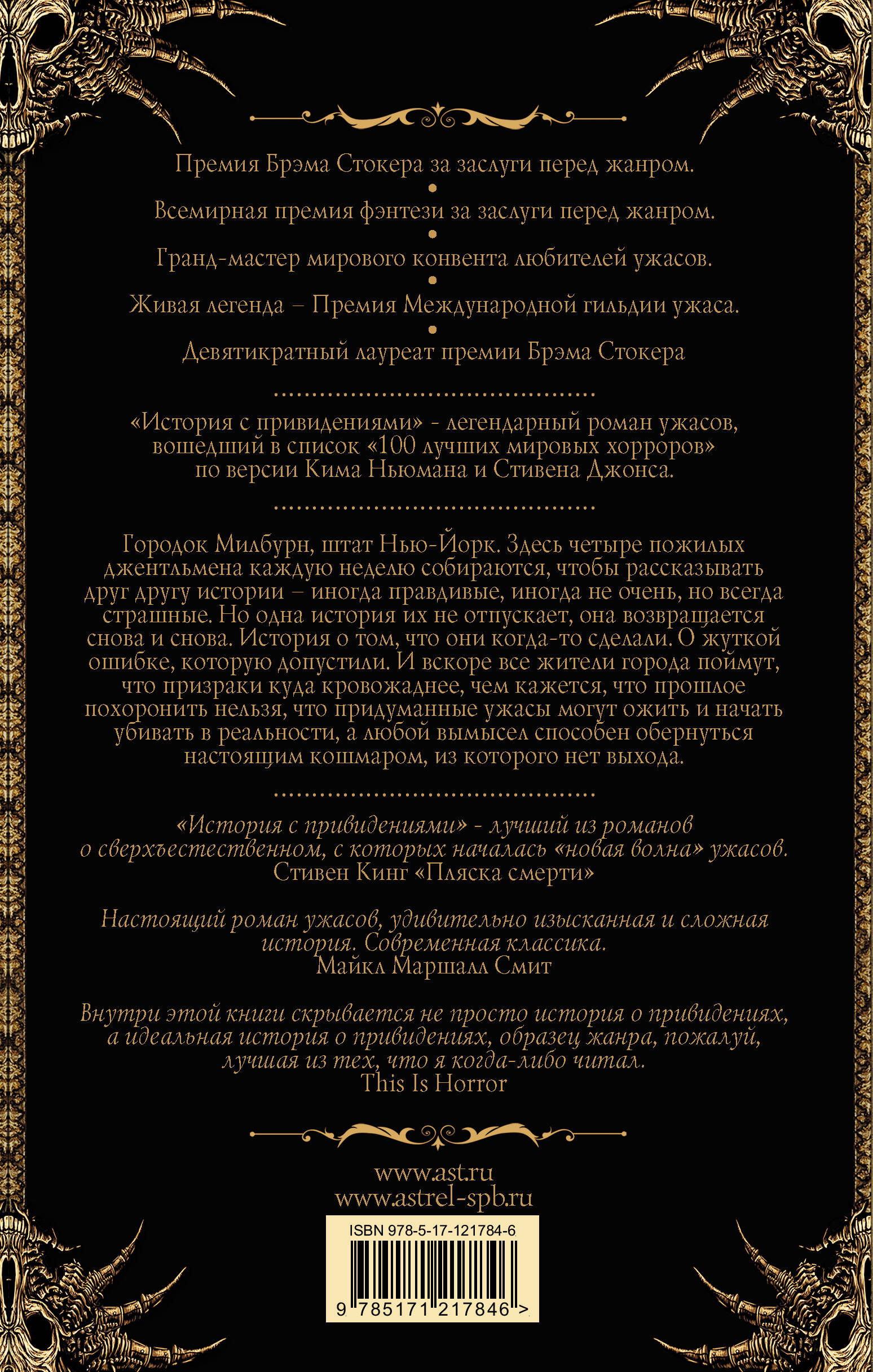 Городок Милбурн, штат Нью-Йорк. Здесь четыре пожилых джентльмена каждую неделю собираются, чтобы рассказывать друг другу истории - иногда правдивые, иногда не очень, но всегда страшные. Но одна история их не отпускает, она возвращается снова и снова. История о том, что они когда-то сделали. О жуткой ошибке, которую допустили. И вскоре все жители города поймут, что призраки куда кровожаднее, чем кажется, что прошлое похоронить нельзя, что придуманные ужасы могут ожить и начать убивать в реальности, а любой вымысел способен обернуться настоящим кошмаром, из которого нет выхода.| Издательство | Издательство "АСТ" |