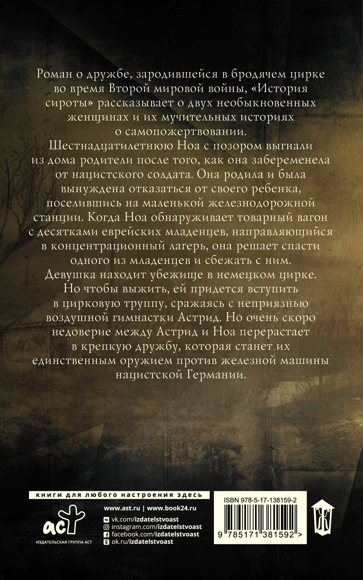 • Бестселлер The New York Times! • Невероятная история о соперничестве и силе настоящей дружбы, спасающей даже в самые темные времена. • Исторический роман поведает об одном из самых отчаянных и смелых человеческих подвигов времен Второй мировой войны. • Пэм Дженофф работала в Пентагоне и участвовала в операциях на самых высоких правительственных уровнях. Во время работы в Польше Пэм заинтересовалась изучением Холокоста и польско-еврейских отношений. В шестнадцать лет Ноа выгнали из дома родители за порочную связь с нацистским солдатом. Ей пришлось отказаться от ребенка, родившегося в результате этого союза, и навсегда уехать из Голландии. Судьба забрасывает ее в Германию, где девушка находит временное пристанище и работу на вокзале. Однажды Ноа спасает ребенка из товарного вагона, в котором еврейских младенцев перевозят в концлагерь, и решает сбежать с ним. Она находит прибежище в немецком цирке, где встречает воздушную гимнастку Астрид. Настоящее имя женщины - Ингрид, она еврейка и потому вынуждена скрываться. Девушка пытается научиться цирковому мастерству, чтобы путешествовать вместе с ними, воспитывая Тео. Ноа и Астрид открыто враждуют, но со временем понимают, что их главный враг - это бесчеловечность нацистов. Непростая история о поиске своего места в мире, о любви и преданности, о боли за тех, кто потерян навсегда. Пэм Дженофф нашла совершенно новый способ рассказать о трагедии Второй мировой войны. В романе судьбы простых цирковых артистов, немецких офицеров и жителей оккупированных городов сливаются в едином потоке жестокости, против которой работают только вера, отвага и любовь.| Издательство | ИЗДАТЕЛЬСТВО "АСТ" |