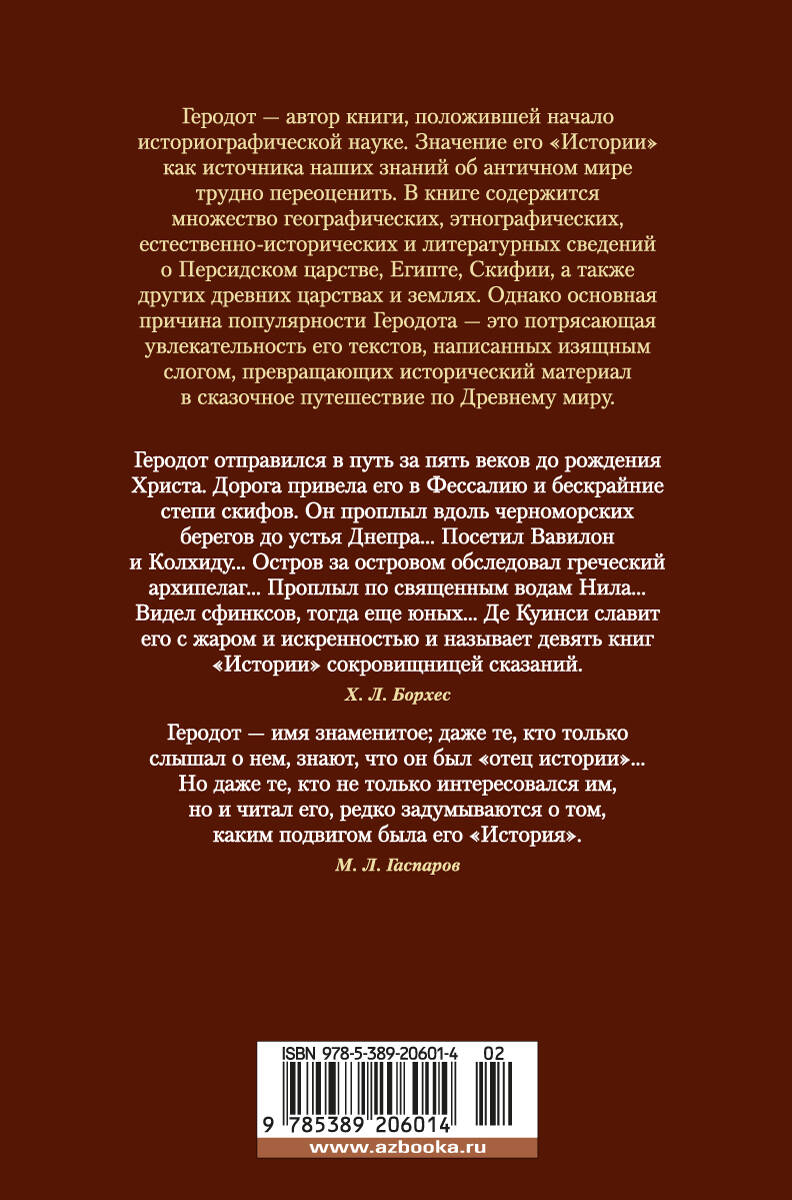 Геродот - автор книги, положившей начало историографической науке. Значение его "Истории" как источника*наших знаний об античном мире трудно переоценить. В книге содержится множество географических, этнографических, естественно-исторических и литературных сведений о Персидском царстве, Египте, Скифии, а также других царствах и землях, в которых обрела свое рождение и смысл культура Западного мира. Однако основная причина неувядающей популярности Геродота - потрясающая увлекательность его текстов, написанных изящным слогом, превращающих исторический материал в сказочное путешествие по Древнему миру.| Издательство | Азбука-Аттикус Издат.группа ООО |