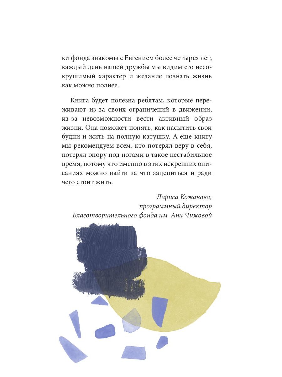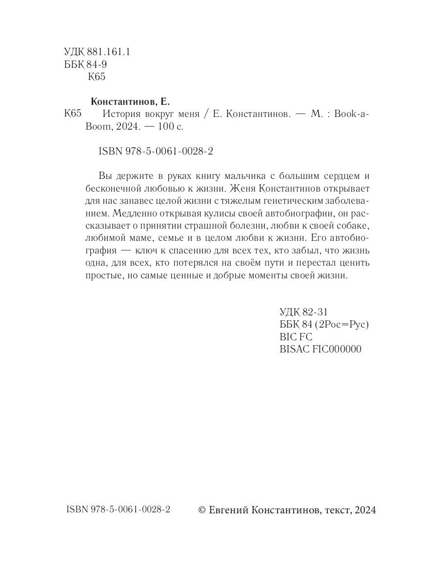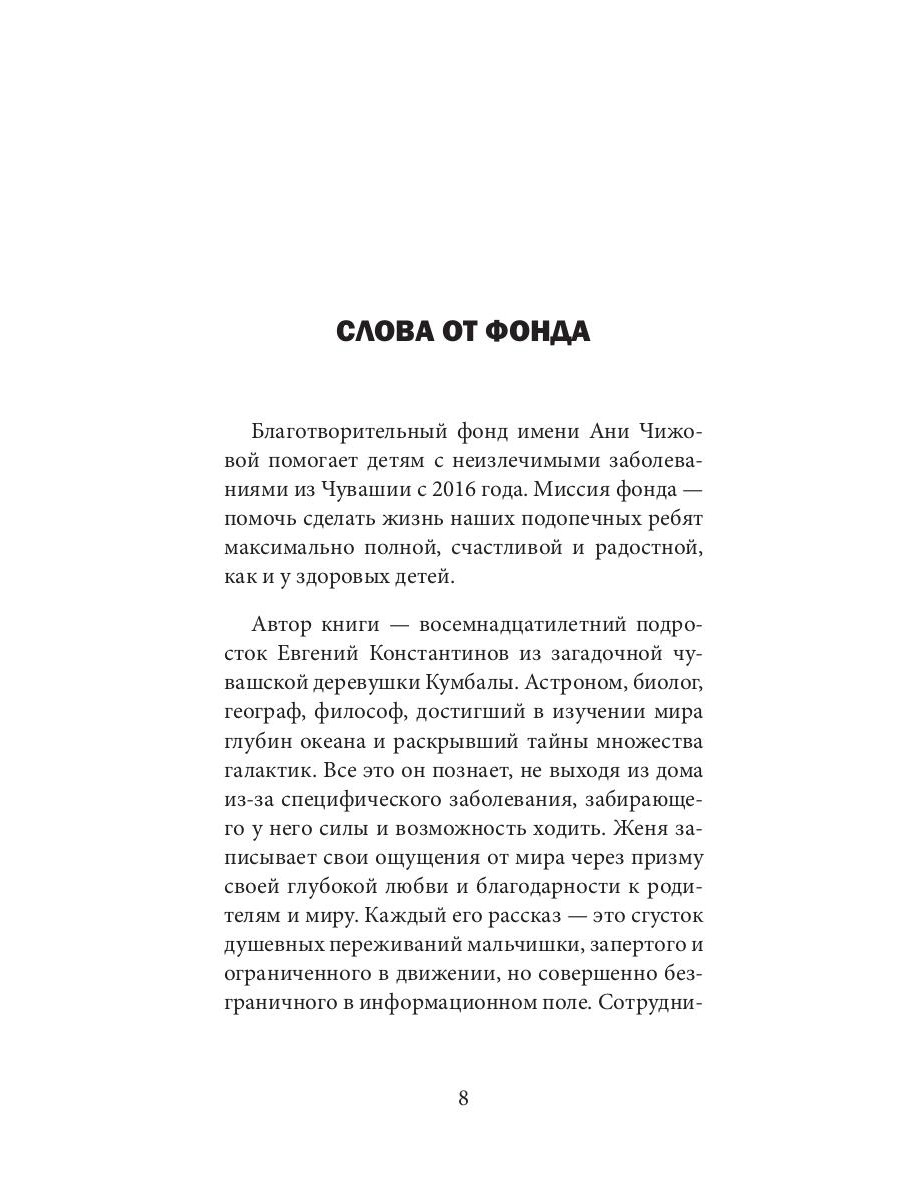 Вы держите в руках книгу мальчика с большим сердцем и бесконечной любовью к жизни. Женя Константинов открывает для нас занавес целой жизни с тяжелым генетическим заболеванием. Медленно открывая кулисы своей автобиографии, он рассказывает о принятии страшной болезни, любви к своей собаке, любимой маме, семье и в целом любви к жизни. Его автобиография - ключ к спасению для всех тех, кто забыл, что жизнь одна, для всех, кто потерялся на своём пути и перестал ценить простые, но самые ценные и добрые моменты своей жизни.