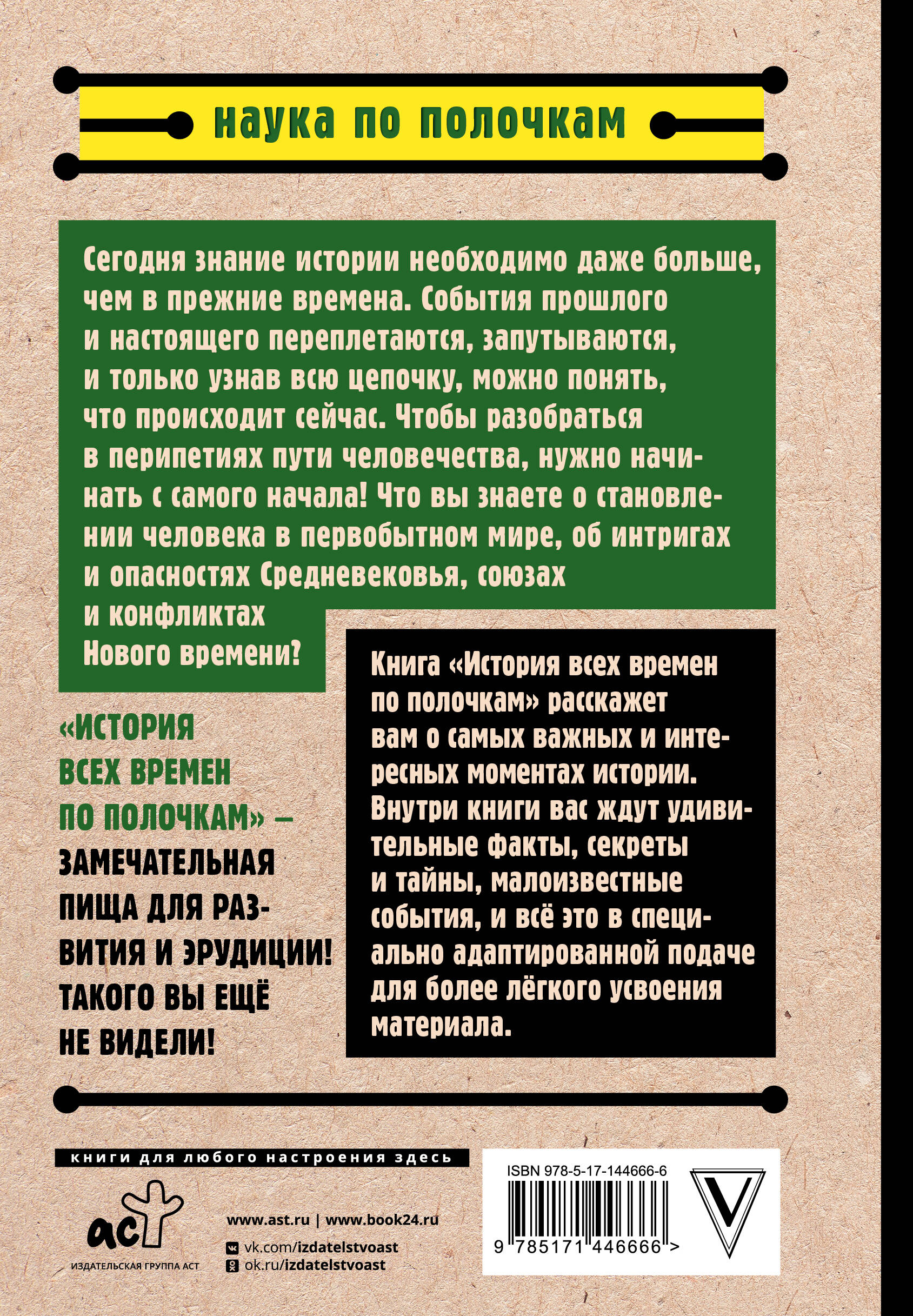 Сегодня знание истории необходимо даже больше, чем в прежние времена. События прошлого и настоящего переплетаются, запутываются, и только узнав всю цепочку, можно понять, что происходит сейчас. Чтобы разобраться в перипетиях пути человечества, нужно начинать с самого начала! Что вы знаете о становлении человека в первобытном мире, об интригах и опасностях Средневековья, союзах и конфликтах Нового времени? Книга "История всех времен по полочкам" расскажет вам о самых важных и интересных моментах истории. Внутри книги вас ждут удивительные факты, секреты и тайны, малоизвестные события, и все это в специально адаптированной подаче для более лёгкого усвоения материала.| Издательство | ИЗДАТЕЛЬСТВО "АСТ" |