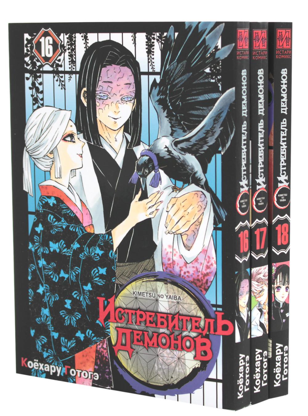 В комплект входят три тома (16-18) манги Коехару Готогэ «Истребитель демонов». В шестандцатом томе тренировка столпов в самом разгаре, и Тандзиро пришёл к Химэдзиме, каменному столпу. В ходе его сурового обучения приходится стоять под водопадом, таскать брёвна и толкать огромные валуны; сумеет ли Тандзиро выстоять и заслужить признание Химэдзимы?! И что делать с Мудзаном, который вот-вот отыщет и Нэдзуко, и поместье Убуясики?! В семнадцатом томе чтобы победить Мудзана, истребители врываются в Бесконечную крепость. В развернувшейся отчаянной схватке с Домой, второй молодой луной, Синобу приходится очень нелегко, ведь её противник невосприимчив к ядам. Сумеет ли она отомстить за свою сестру?.. В то же время на пути Дзэницу встаёт ещё один демон! В восемнадцатом томе Тандзиро и Томиока приняли бой с Акадзой, третьей молодой луной. Он настолько силён, что мечникам остаётся только держать глухую оборону. Однако в ожесточённой схватке Тандзиро удаётся достичь «Изнанки мира», о которой рассказывал его отец! Сумеет ли теперь клинок Тандзиро поразить Акадзу?!| Издательство | ИД Истари Комикс |