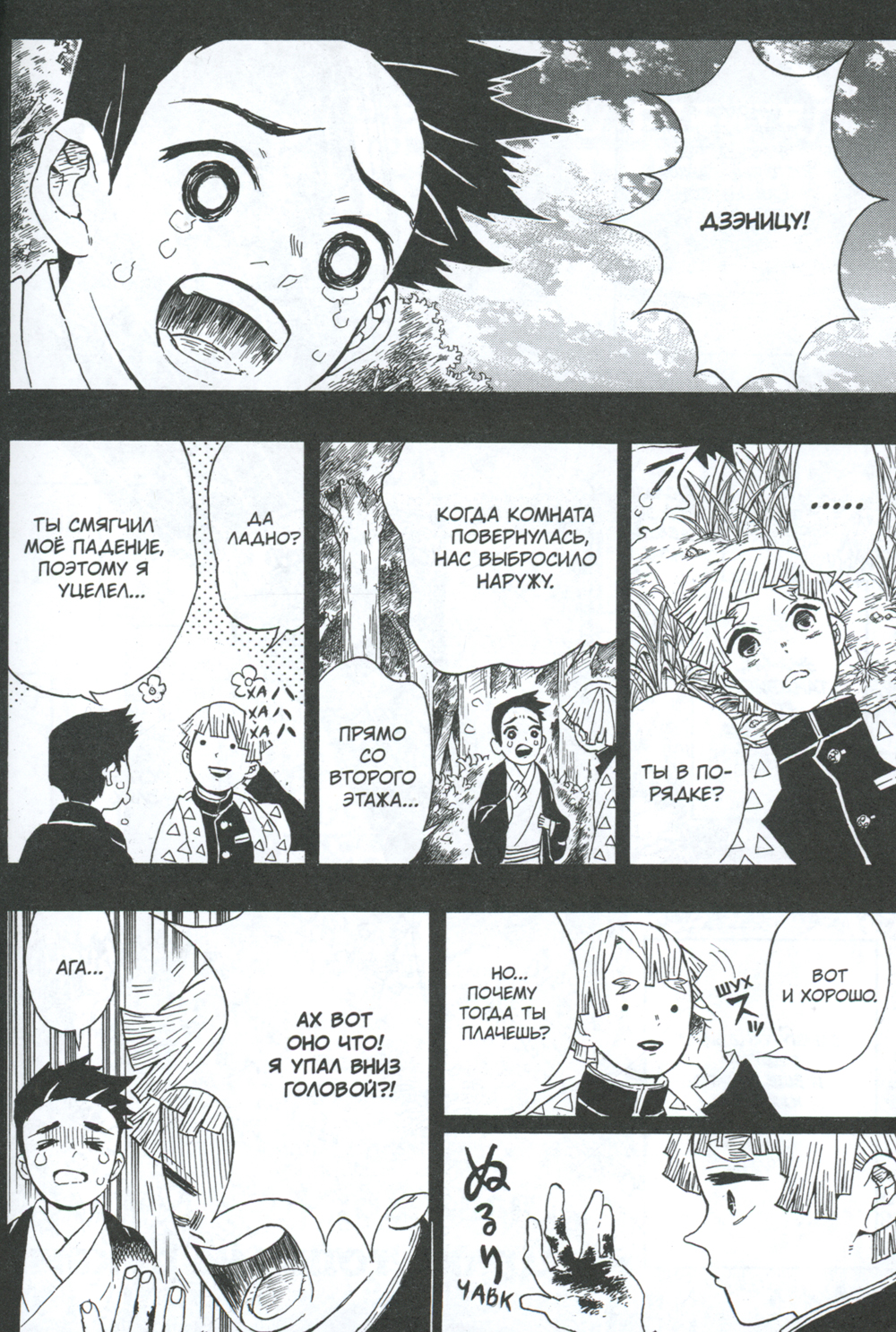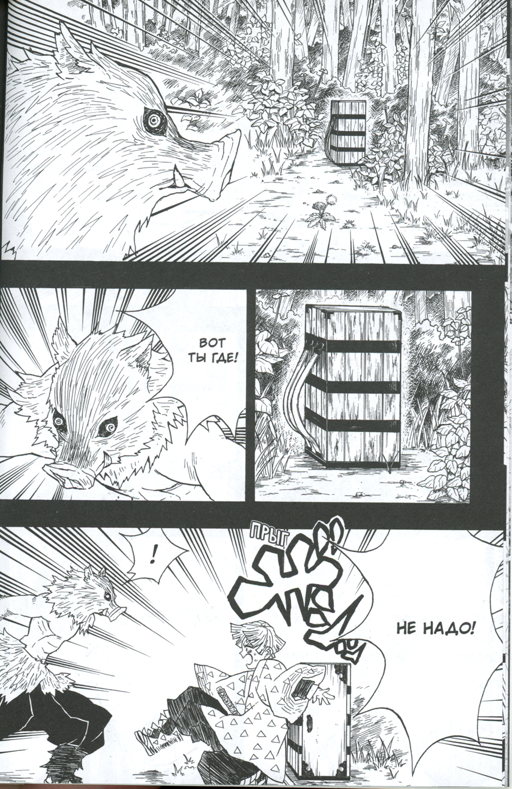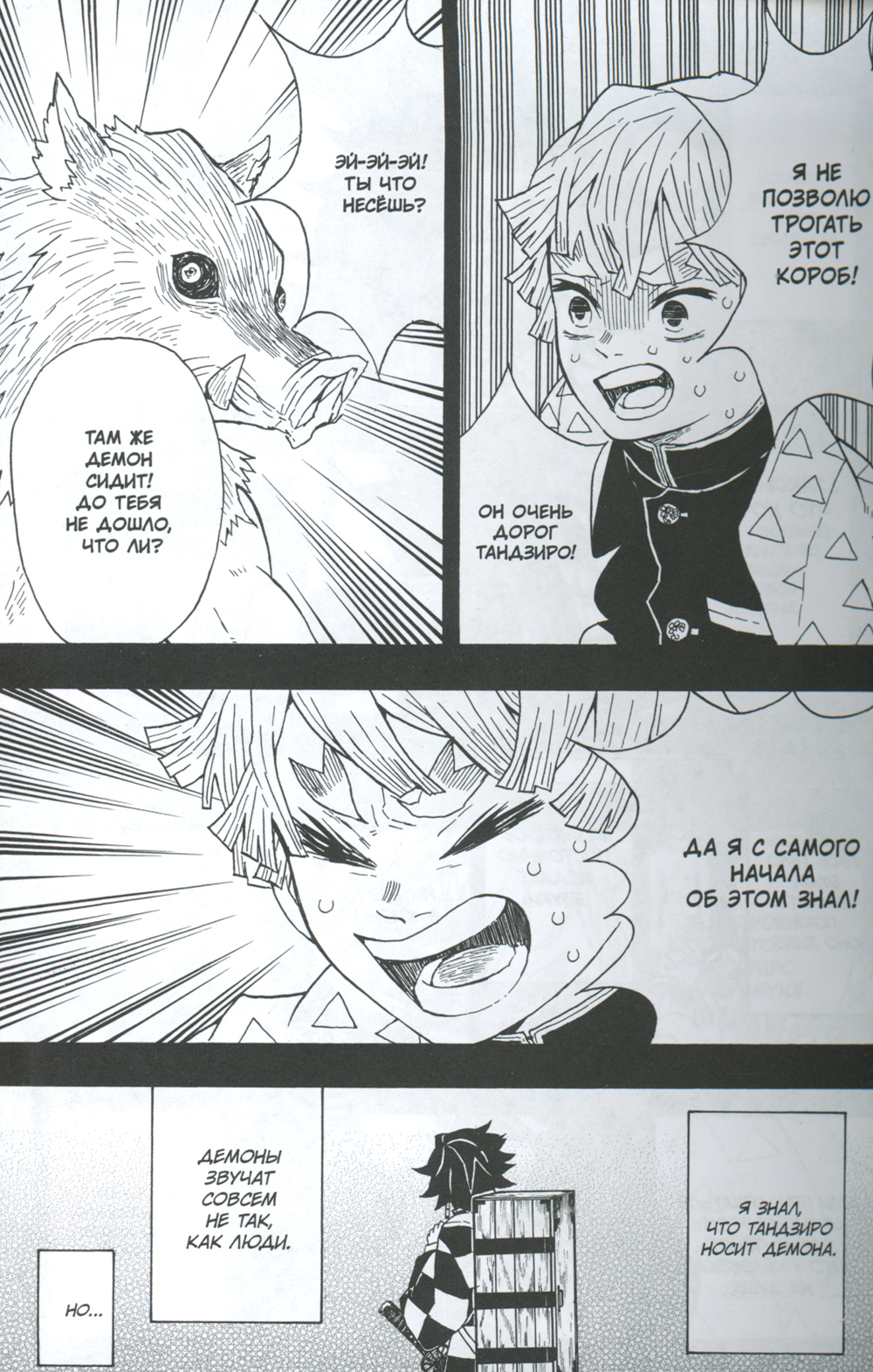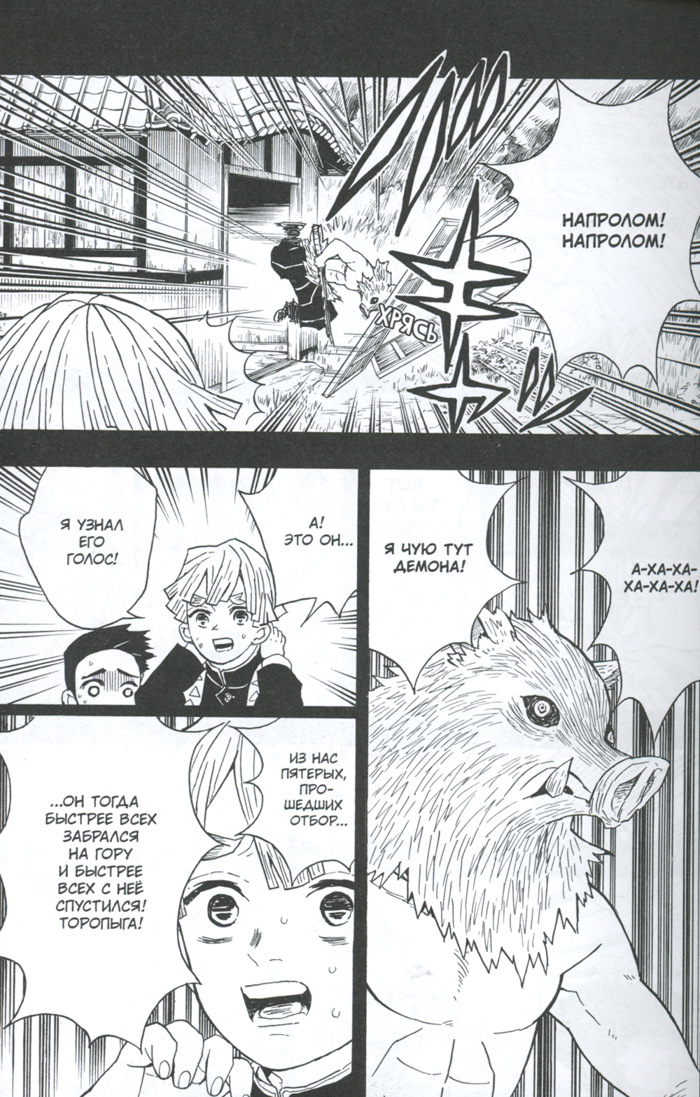 Покинув дом демона, управляющего барабанами, Тандзиро видит, как юноша в маске кабана избивает Дзэницу Агацуму.