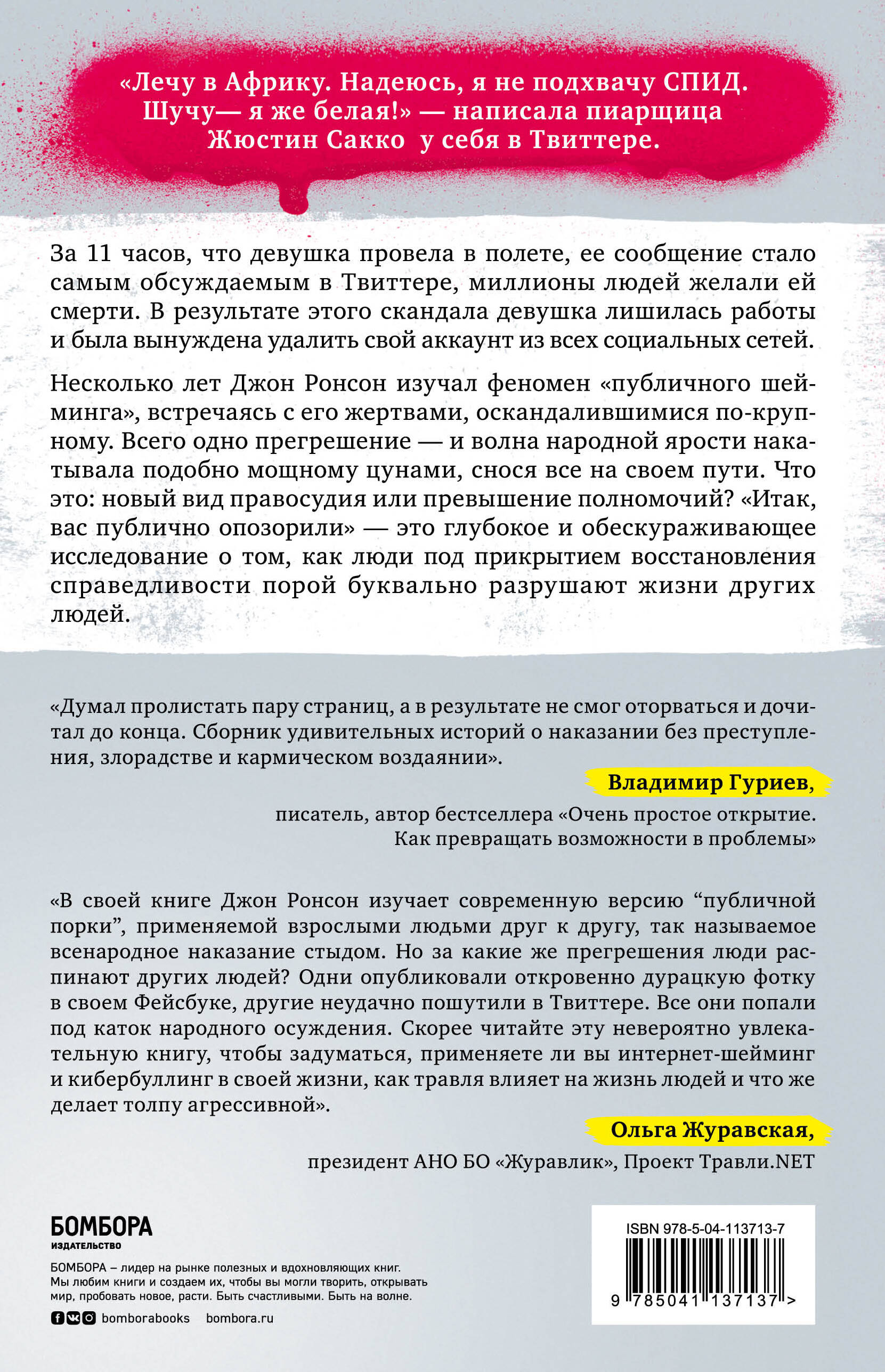 Несколько лет Джон Ронсон изучал феномен "публичного шейминга", встречаясь с его жертвами, оскандалившимися по-крупному. Всего одно прегрешение - и волна народной ярости накатывала подобно мощному цунами, снося все на своем пути. Что это: новый вид правосудия или превышение полномочий? "Итак, вас публично опозорили" - это исследование Ронсона, одновременно обескураживающее и невероятно смешное, о том, как люди под прикрытием восстановления справедливости порой буквально разрушают жизни других людей.| Издательство | ООО "Издательство "Эксмо" |