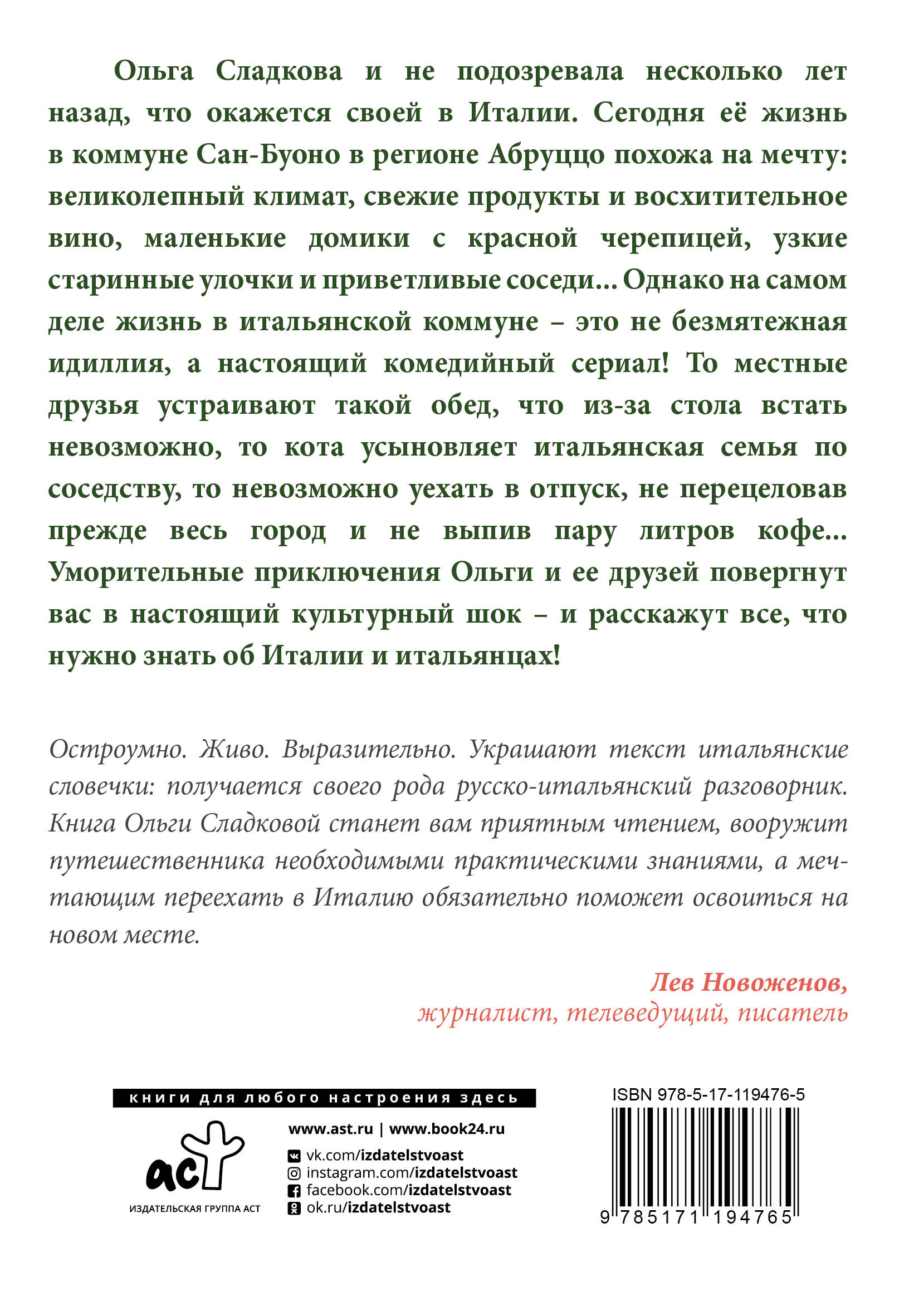 Ольга Сладкова и не подозревала несколько лет назад, что окажется своей в Италии. Сегодня ее жизнь в коммуне Сан-Буоно в регионе Абруццо похожа на мечту: великолепный климат, свежие продукты и восхитительное вино, маленькие домики с красной черепицей, узкие старинные улочки и приветливые соседи... Однако на самом деле жизнь в итальянской коммуне - это не безмятежная идиллия, а настоящий комедийный сериал! То местные друзья устраивают такой обед, что из-за стола встать невозможно, то кота усыновляет итальянская семья по соседству, то невозможно уехать в отпуск, не перецеловав прежде весь город и не выпив пару литров кофе... Уморительные приключения Ольги и ее друзей повергнут вас в настоящий культурный шок - и расскажут все, что нужно знать об Италии и итальянцах!| Издательство | ИЗДАТЕЛЬСТВО "АСТ" |