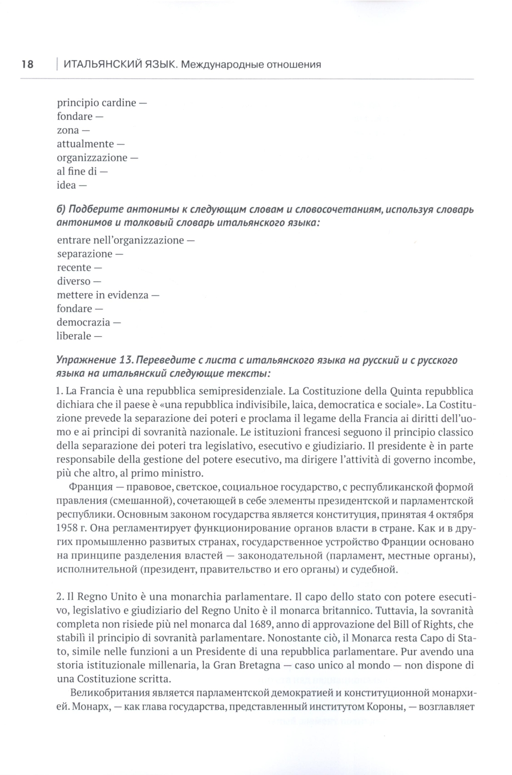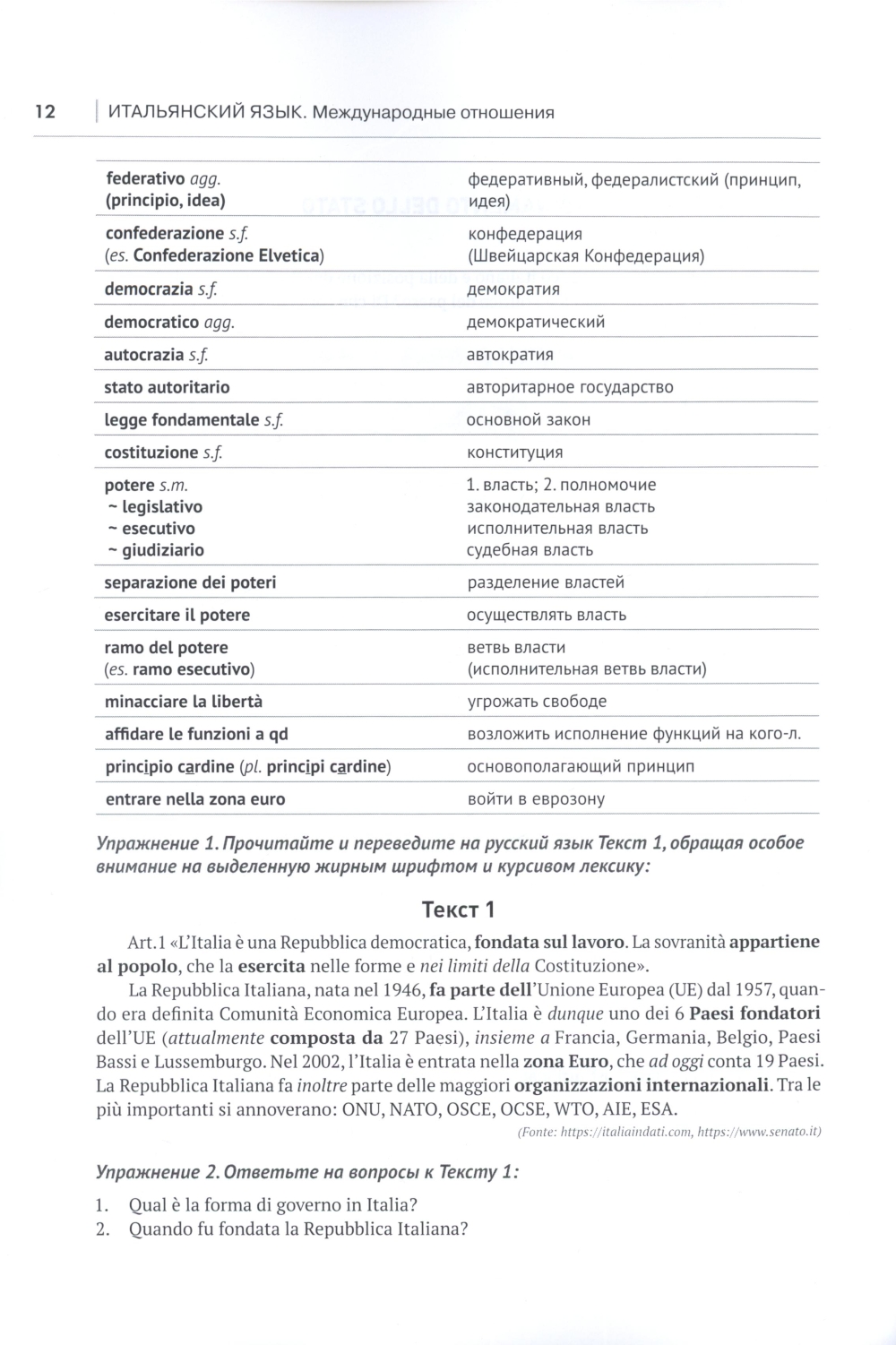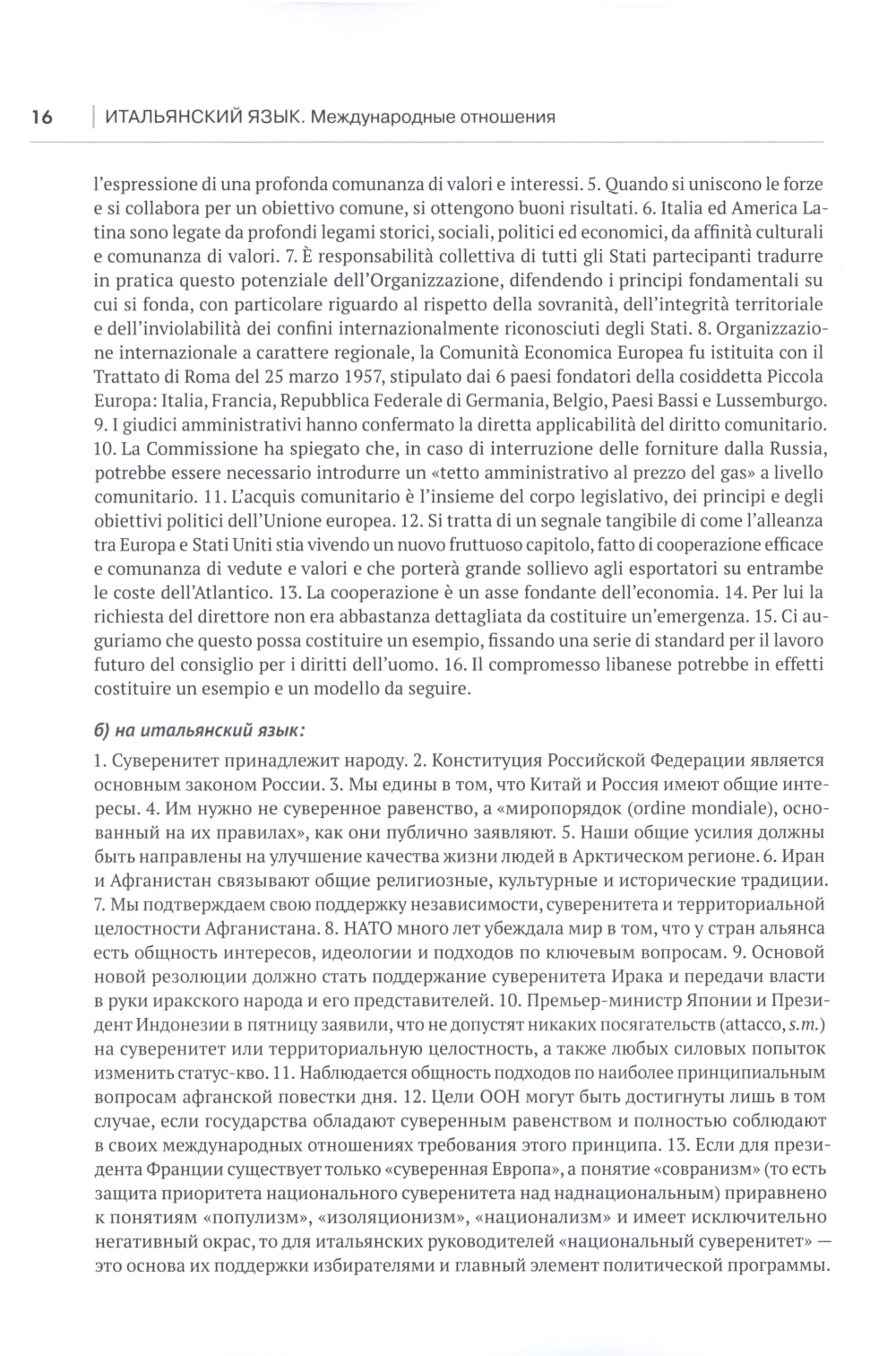 Учебное пособие предназначено для формирования и развития у студентов навыков владения языком профессии, в том числе навыков письменного и устного перевода текстов общественно-политической тематики с итальянского языка на русский и с русского языка на итальянский, а также коммуникационных компетенций на итальянском языке в сфере международных отношений и дипломатии. Для студентов старших курсов бакалавриата МГИМО, изучающих итальянский язык и обучающихся по направлениям «Международные отношения», «Зарубежное регионоведение», «Политология».