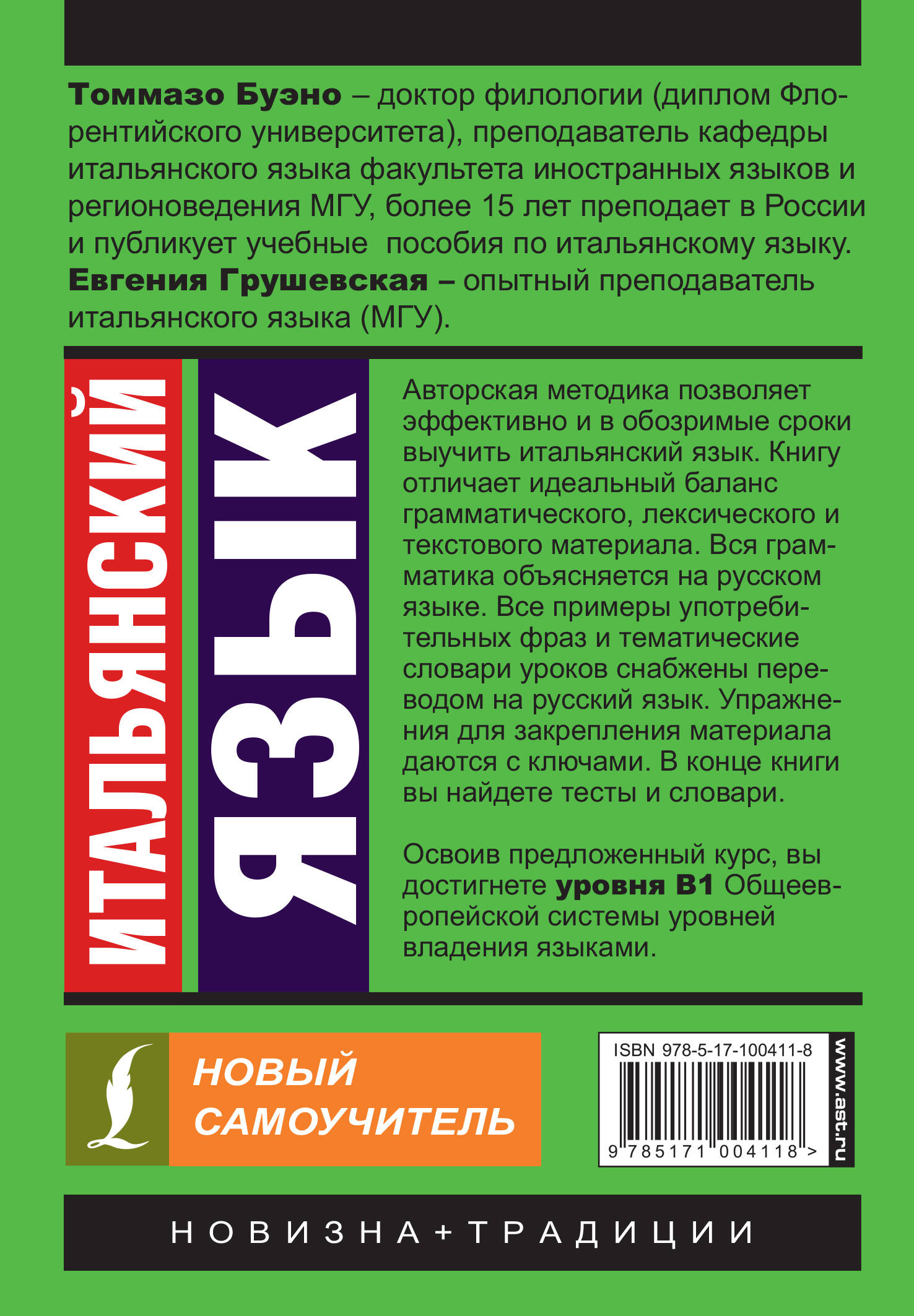 Авторы книги - опытные преподаватели итальянского языка (кафедра итальянского языка факультета иностранных языков и регионоведения МГУ)! Томмазо Буэно - самый популярный автор книг на итальянском языке. Он - итальянец, более 15 лет преподает в МГУ итальянский язык. Книги Томмазо Буэно - это настоящий итальянский. Соавтор и коллега Томмазо Буэно - Евгения Грушевская осуществила мечту многих читателей! Все необходимые материалы, словарики и комментарии в самоучителе дала на русском языке. Книгу отличает идеальный баланс грамматического, лексического и текстового материала. Теперь это настоящий САМОУЧИТЕЛЬ итальянского языка с аутентичными текстами, диалогами и переводом на русский язык. Упражнения для закрепления материала даются с ключами. В конце книги вы найдете тесты и словари. Авторская методика позволяет эффективно и в обозримые сроки выучить итальянский язык. Освоив предложенный курс, вы достигните уровня В1 Общеевропейской системы уровней владения языками.| Издательство | ИЗДАТЕЛЬСТВО "АСТ" |
