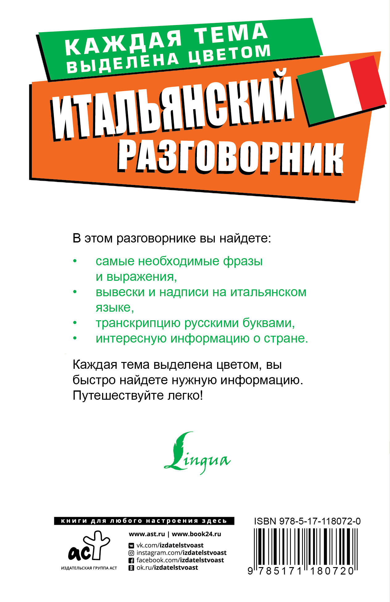 «Итальянский разговорник» из новой серии «Лучший разговорник для путешествий». В нем вы найдете: - самые необходимые фразы и выражения с переводами - вывески и надписи на итальянском языке - транскрипцию русскими буквами - полезную информацию о стране Материал разбит по темам, каждая выделена своим цветом. Вы без труда найдете нужную вам в данный момент информацию. Компактное издание для тех, кто не владеет языком, но хотел бы чувствовать себя уверенно в заграничной поездке.| Издательство | Издательство "АСТ" |