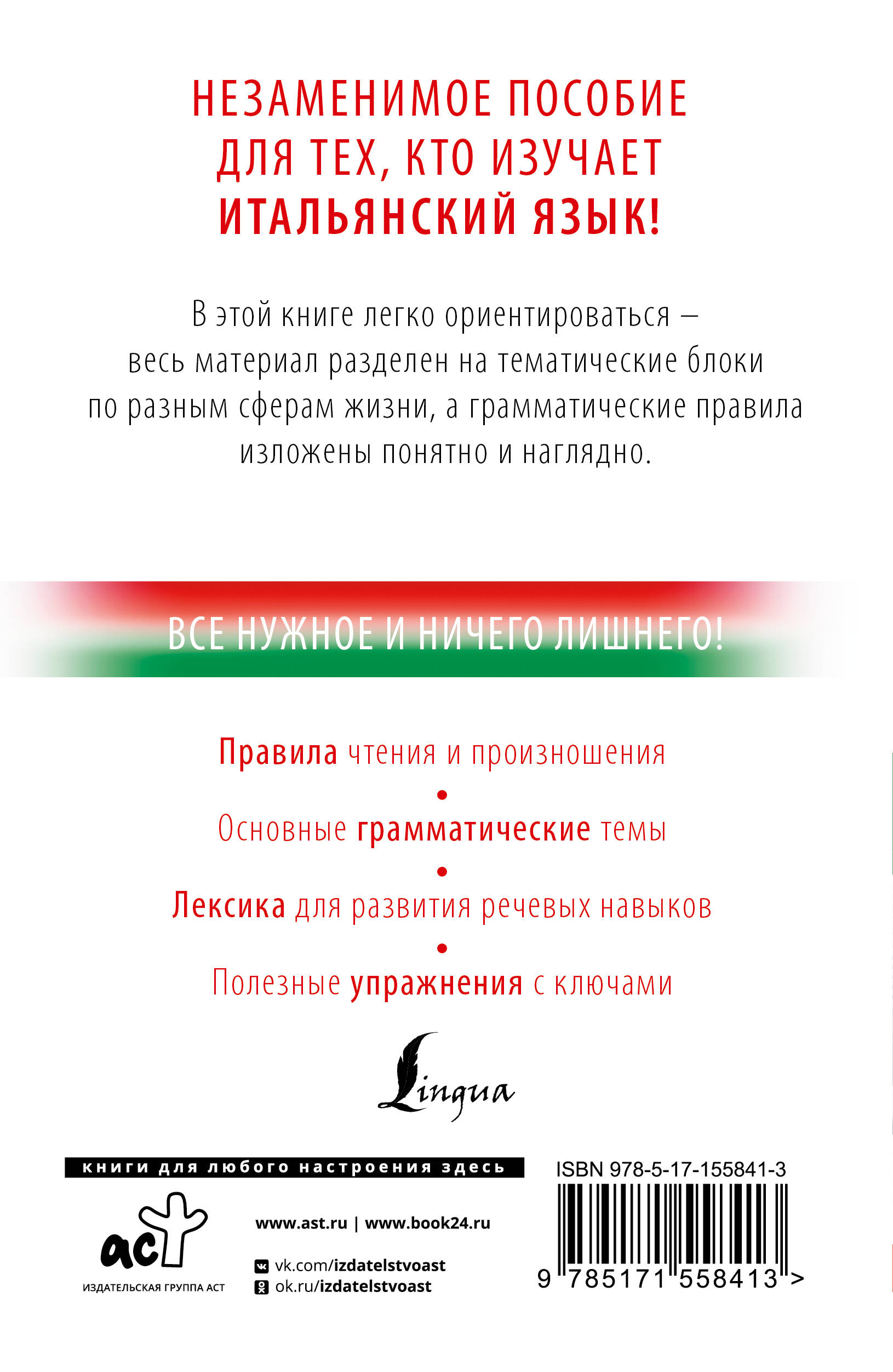 Пособие содержит лексический и грамматический материал для изучения итальянского языка с нулевого уровня. Издание охватывает лексику по 12 важнейшим бытовым темам. В каждом разделе приводится базовый вокабуляр, который будет полезен в самых разных ситуациях. Также пособие содержит упражнения с ключами, русско-итальянский и итальянско-русский словари. Книга будет полезна всем, кто начинает изучать итальянский язык. Подходит как для самостоятельных занятий, так и для работы с преподавателем.| Издательство | ИЗДАТЕЛЬСТВО "АСТ" |