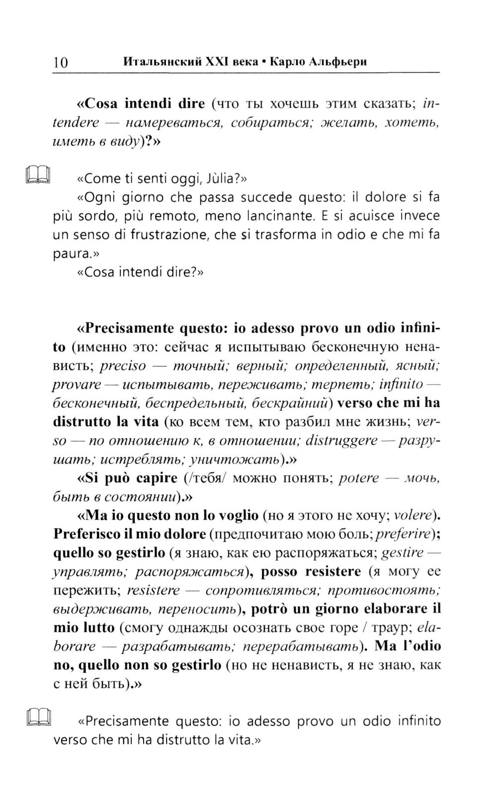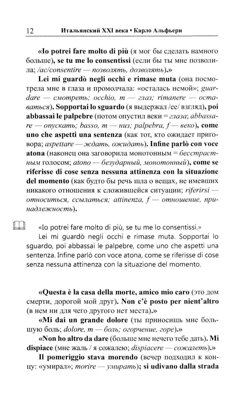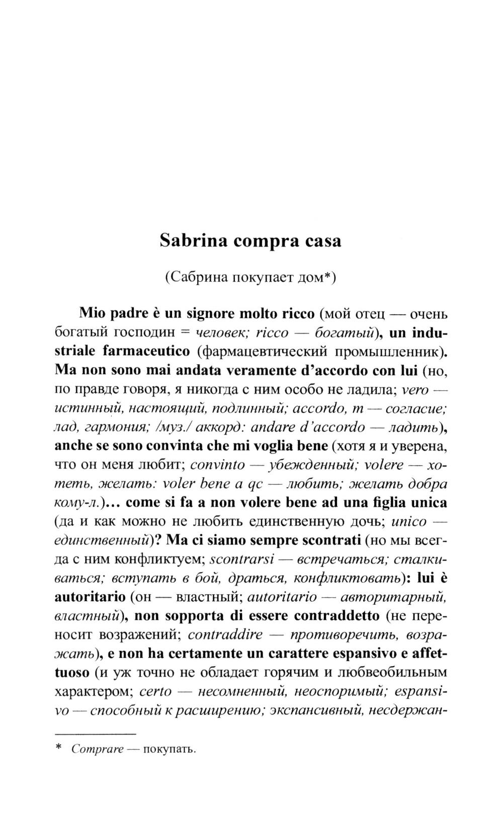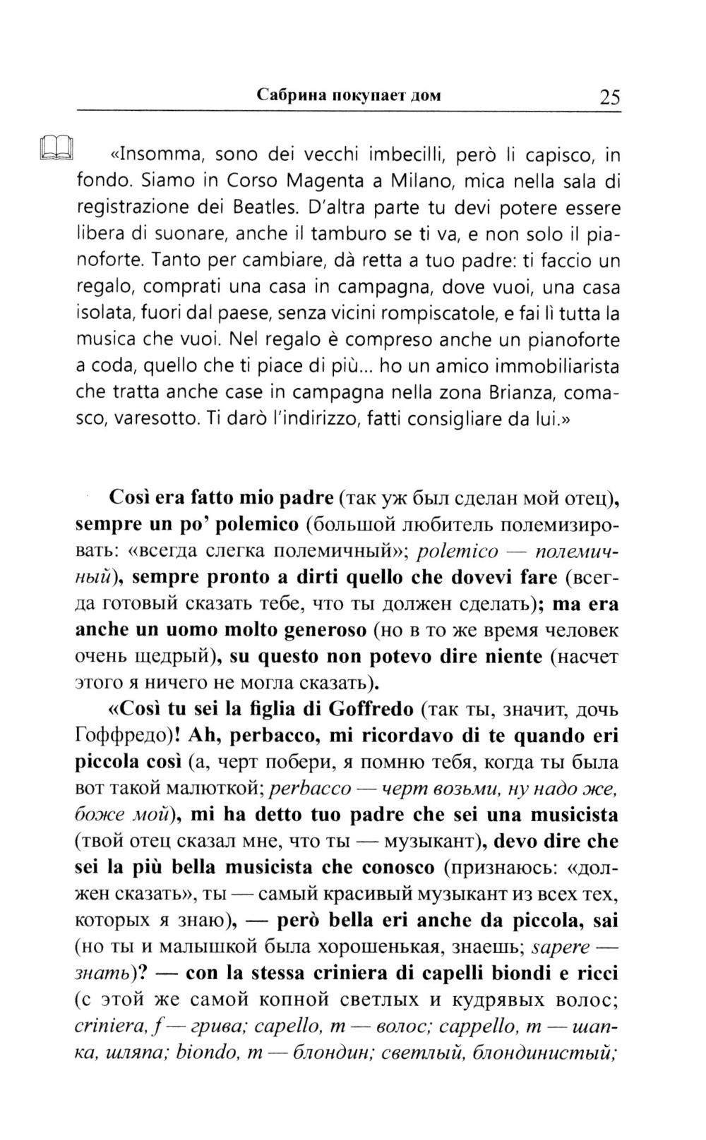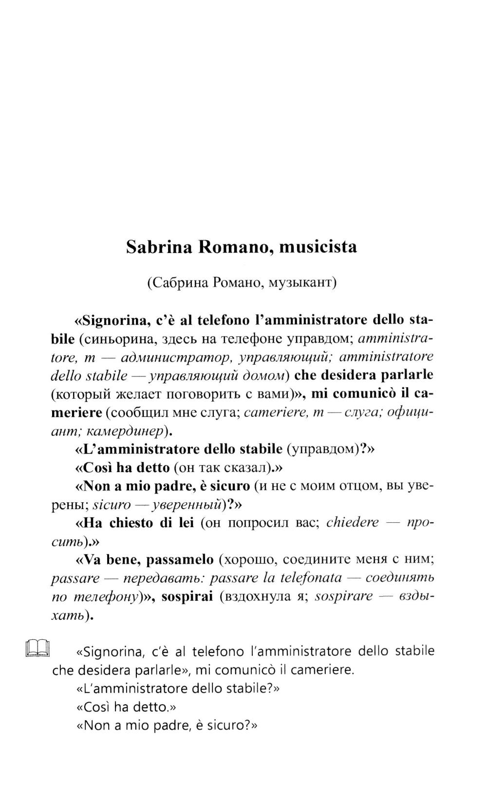 Покупая старый дом, будьте готовы к встрече с призраками прошлого, бродящими по его комнатам... О тайне, окутывающей заброшенное поместье, слышали многие, но беспощадную правду знала только она. И вот, спустя много лет, эта история вновь напомнила о себе, глубоко волнуя, заставляя сопереживать всех, кто с ней соприкоснулся, обретая новую жизнь, над которой время уже не властно... Роман известного итальянского писателя, уроженца Милана Карло Альфьери адаптирован в настоящем издании по методу Ильи Франка: снабжен дословным переводом на русский язык и необходимым лексико-грамматическим комментарием. Уникальность метода заключается в том, что запоминание слов и выражений происходит за счет их повторяемости, без заучивания и необходимости использовать словарь. Кроме того, читатель привыкает к логике итальянского языка, начинает его «чувствовать». Книги из серии «Итальянский XXI века» представляют собой новейшие произведения италоязычной литературы и являются неоценимым подспорьем в изучении «живого» современного итальянского языка.| Издательство | Восточная книга |