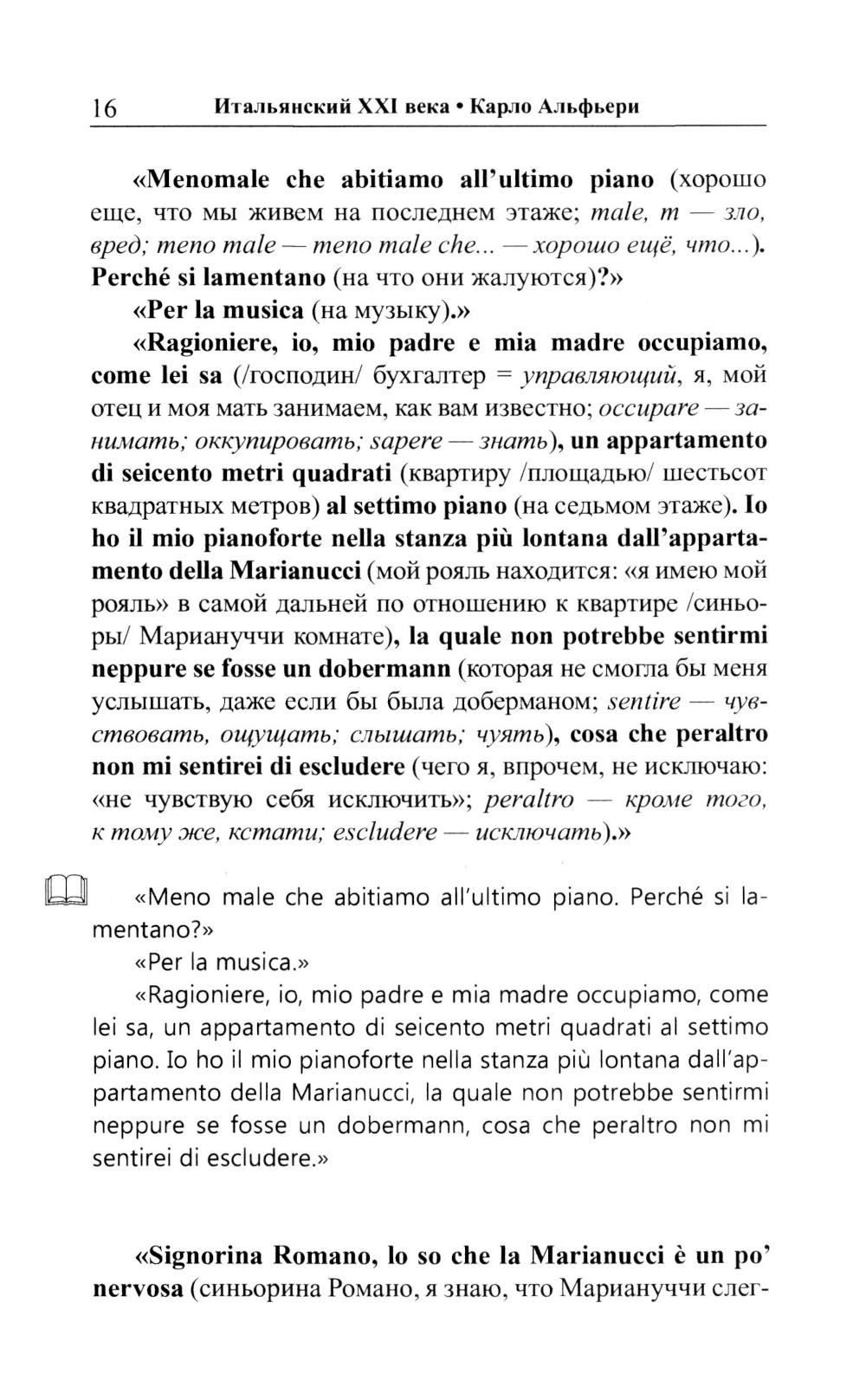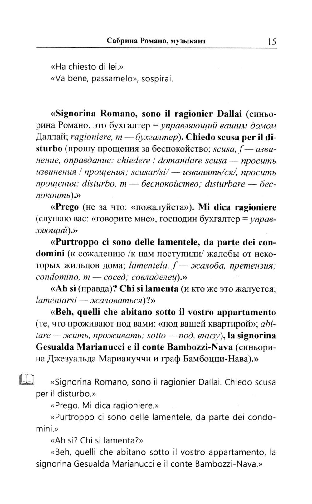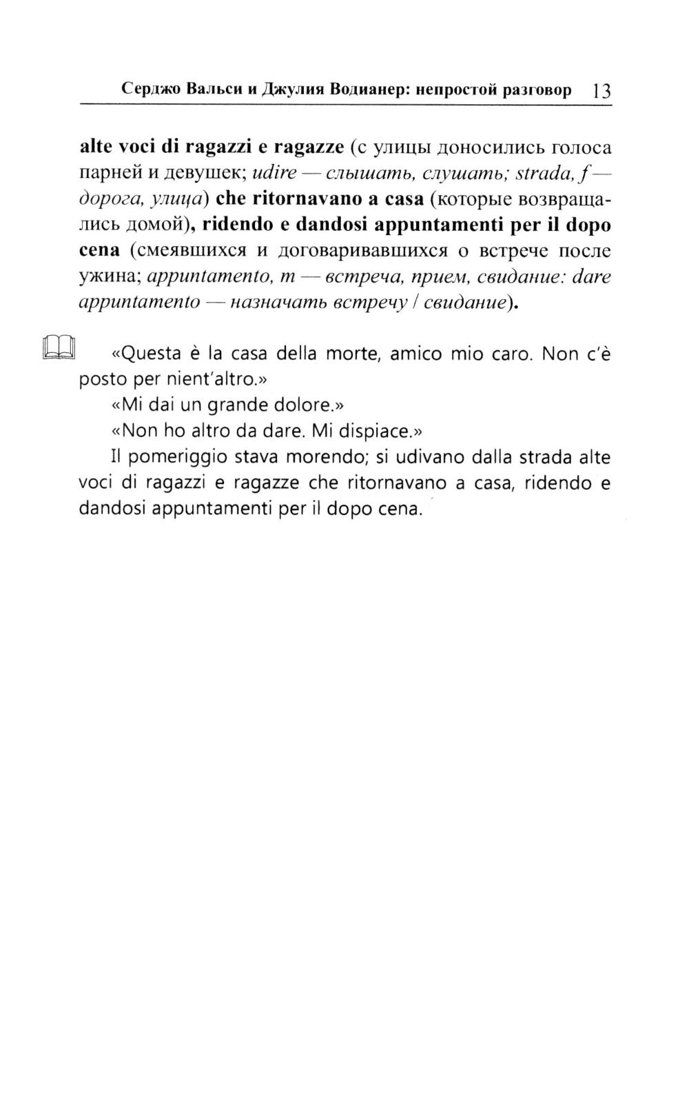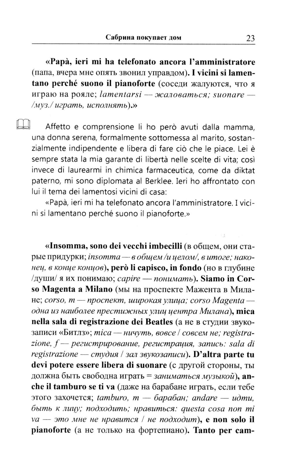 Покупая старый дом, будьте готовы к встрече с призраками прошлого, бродящими по его комнатам... О тайне, окутывающей заброшенное поместье, слышали многие, но беспощадную правду знала только она. И вот, спустя много лет, эта история вновь напомнила о себе, глубоко волнуя, заставляя сопереживать всех, кто с ней соприкоснулся, обретая новую жизнь, над которой время уже не властно... Роман известного итальянского писателя, уроженца Милана Карло Альфьери адаптирован в настоящем издании по методу Ильи Франка: снабжен дословным переводом на русский язык и необходимым лексико-грамматическим комментарием. Уникальность метода заключается в том, что запоминание слов и выражений происходит за счет их повторяемости, без заучивания и необходимости использовать словарь. Кроме того, читатель привыкает к логике итальянского языка, начинает его «чувствовать». Книги из серии «Итальянский XXI века» представляют собой новейшие произведения италоязычной литературы и являются неоценимым подспорьем в изучении «живого» современного итальянского языка.| Издательство | Восточная книга |