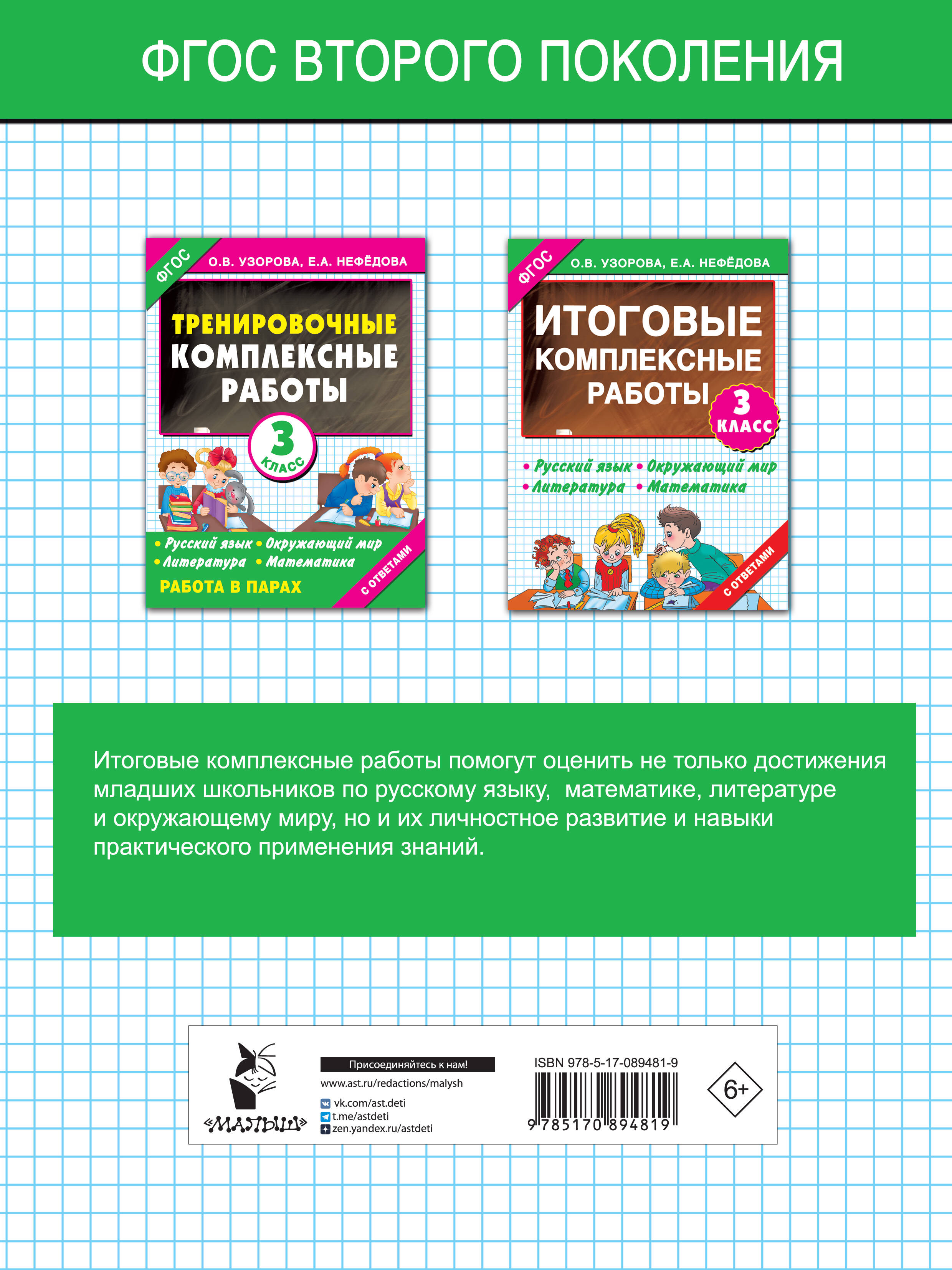 Хотите узнать, каков уровень школьной подготовки у вашего ребёнка? Рабочая тетрадь «Итоговые комплексные работы 3 класс» поможет оценить знания третьеклассника по русскому языку, математике, литературе и окружающему миру. Соответствует ФГОС (федеральному государственному образовательному стандарту). Есть раздел ответов. Большой размер книги и крупный шрифт удобны для ребёнка. Материал основан на эффективной методике известного педагога-практика О.В.Узоровой. Суммарный тираж книг автора - свыше 50 миллионов экземпляров! На учебных пособиях Ольги Узоровой выросло уже несколько поколений школьников. Знания нуждаются в повторении! Для начального образования.| Издательство | ИЗДАТЕЛЬСТВО "АСТ" |