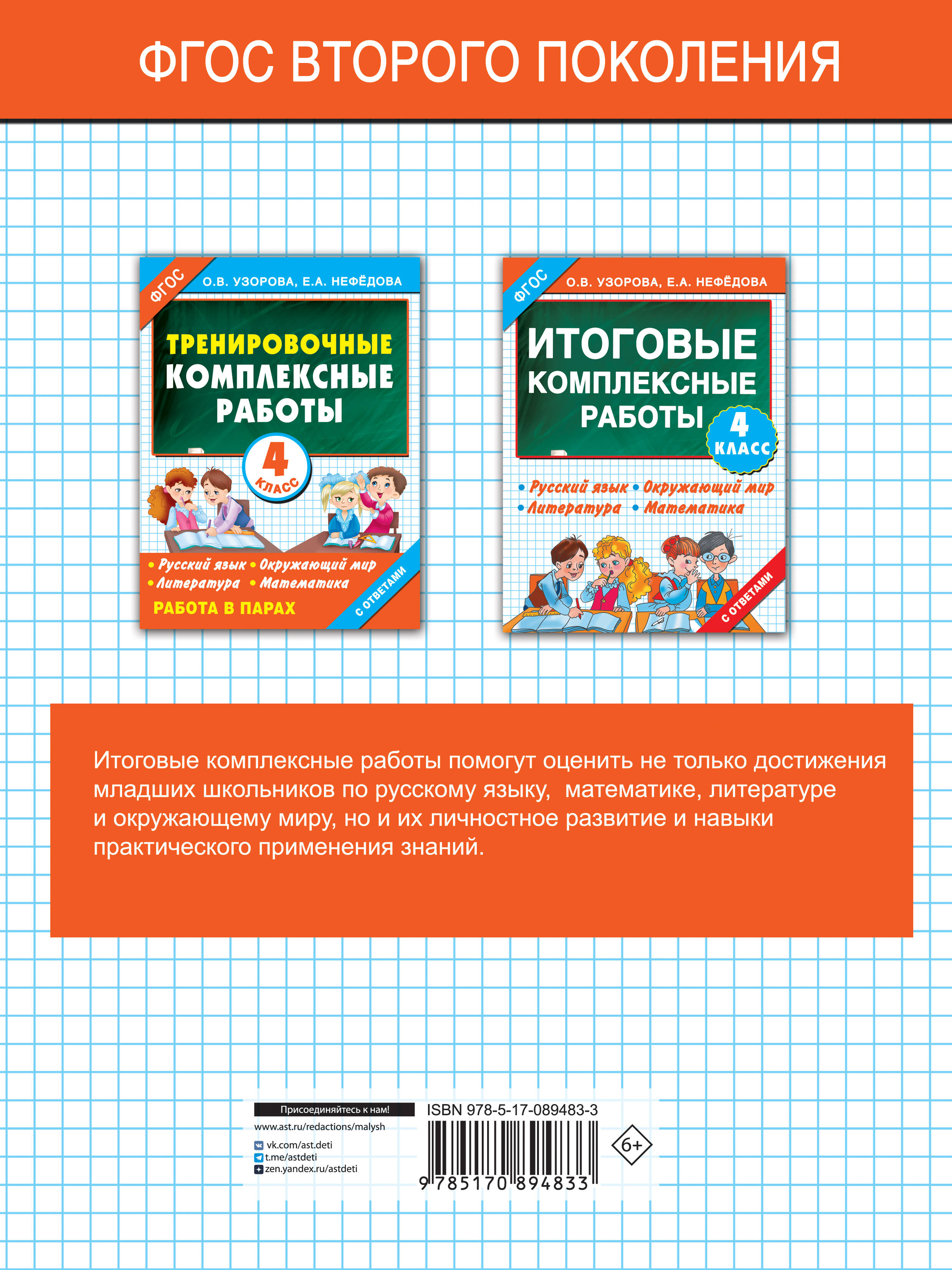Хотите узнать, каков уровень школьной подготовки у вашего ребёнка? Рабочая тетрадь «Итоговые комплексные работы 4 класс» поможет оценить знания четвероклассника по русскому языку, математике, литературе и окружающему миру. Соответствует ФГОС (федеральному государственному образовательному стандарту). Есть раздел ответов. Большой размер книги и крупный шрифт удобны для ребёнка. Материал основан на эффективной методике известного педагога-практика О.В.Узоровой. Суммарный тираж книг автора - свыше 50 миллионов экземпляров! На учебных пособиях Ольги Узоровой выросло уже несколько поколений школьников. Знания нуждаются в повторении! Для начального образования.| Издательство | ИЗДАТЕЛЬСТВО "АСТ" |