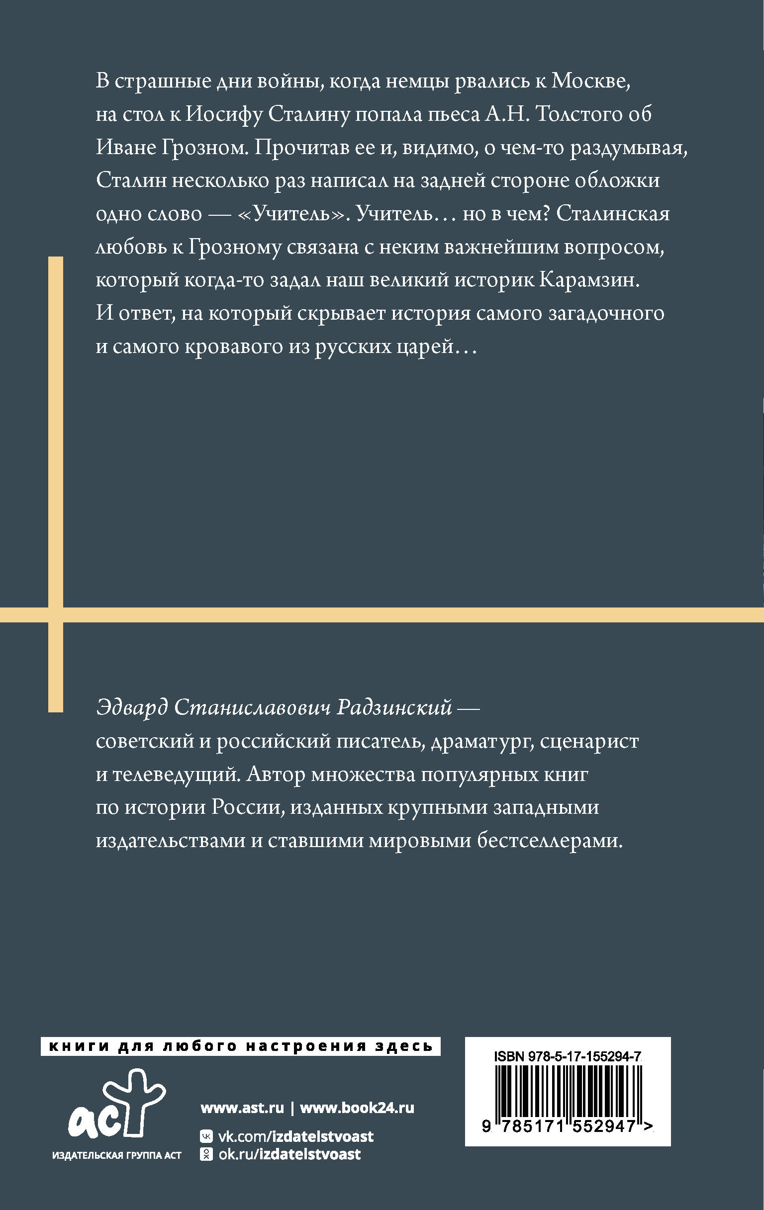 Эдвард Радзинский - писатель, драматург, историк, сценарист, а также создатель телевизионных передач и документальных фильмов. Его книги о Николае II, Распутине, Александре II и Сталине вышли в крупнейших мировых издательствах, переведены на 40 языков и стали бестселлерами по всему миру. Книга "Иван Грозный" приподнимает занавес над темными тайнами самого грозного царя Руси. В страшные дни войны, когда немцы рвались к Москве, на стол к Иосифу Сталину попала пьеса А.Н. Толстого об Иване Грозном. Прочитав ее и, видимо, о чем-то раздумывая, Сталин несколько раз написал на задней стороне обложки одно слово - "Учитель". Учитель… но в чем? Сталинская любовь к Грозному связана с неким важнейшим вопросом, который когда-то задал наш великий историк Карамзин. И ответ, на который скрывает история самого загадочного и самого кровавого из русских царей… Для кого книга: • Для тех, кто любит историю; • Для тех, кто хочет найти истину; • Для тех, кого увлекают загадки.