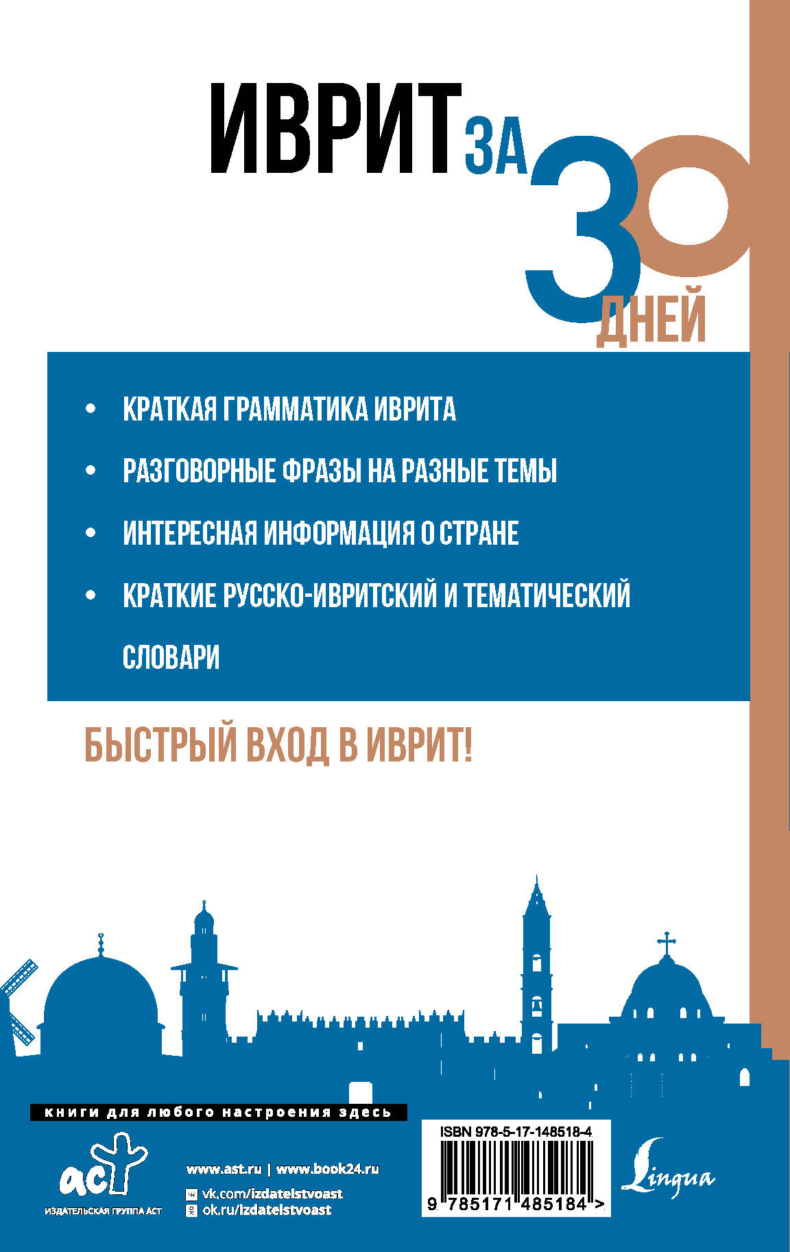 "Иврит за 30 дней" - это отличный помощник для тех, кто хочет выучить иврит легко и быстро. Самоучитель состоит из трех частей. Краткая грамматика знакомит с особенностями письма, произношения и частями речи. Разговорник содержит самые необходимые слова и фразы для свободного общения. Русско-ивритский и тематический словари помогут расширить словарный запас. Самоучитель будет полезен всем, кто интересуется ивритом или начинает его изучать.| Издательство | АСТ |